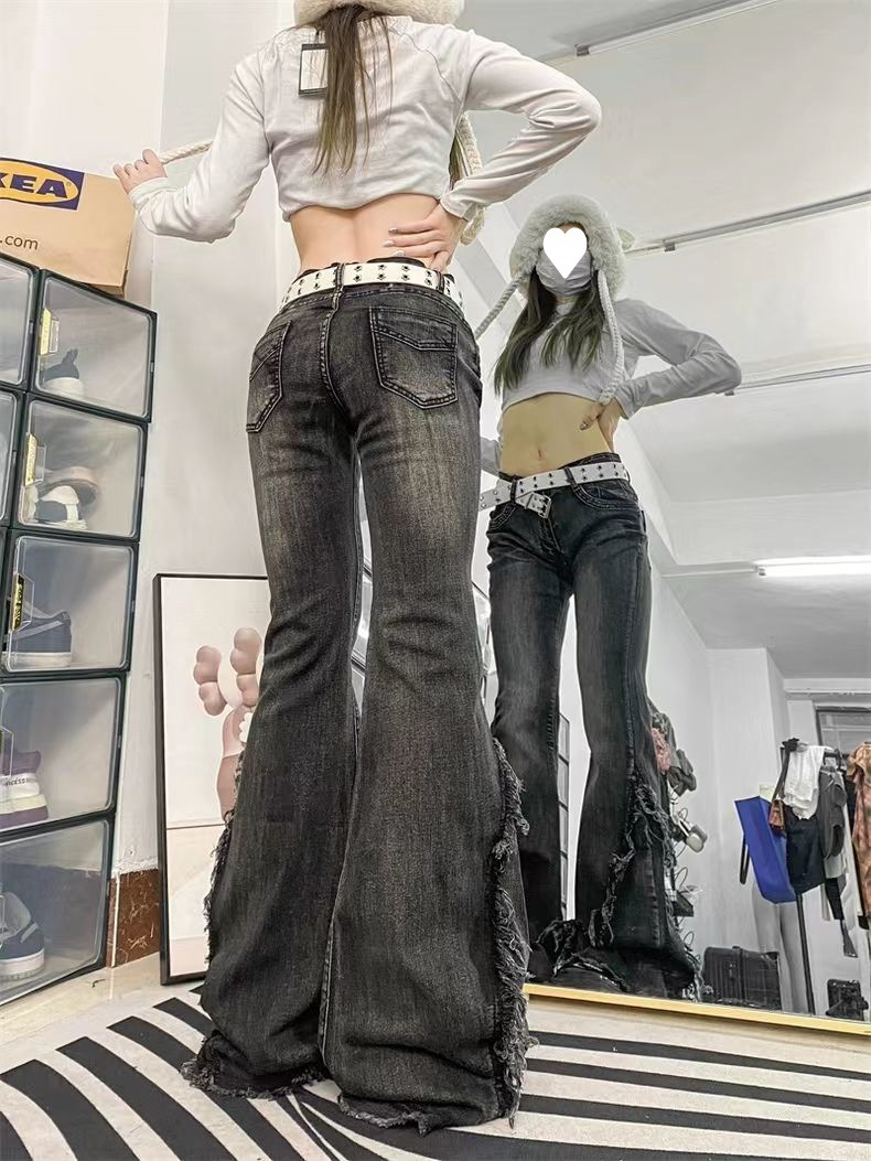 아메리칸 스타일 복고풍 분위기 러핑 엣지 디자인 센스 마이크로 핏 청바지 여성의 가을과 겨울 로우 웨이스트 느슨한 슬리밍 와이드 레그 팬츠