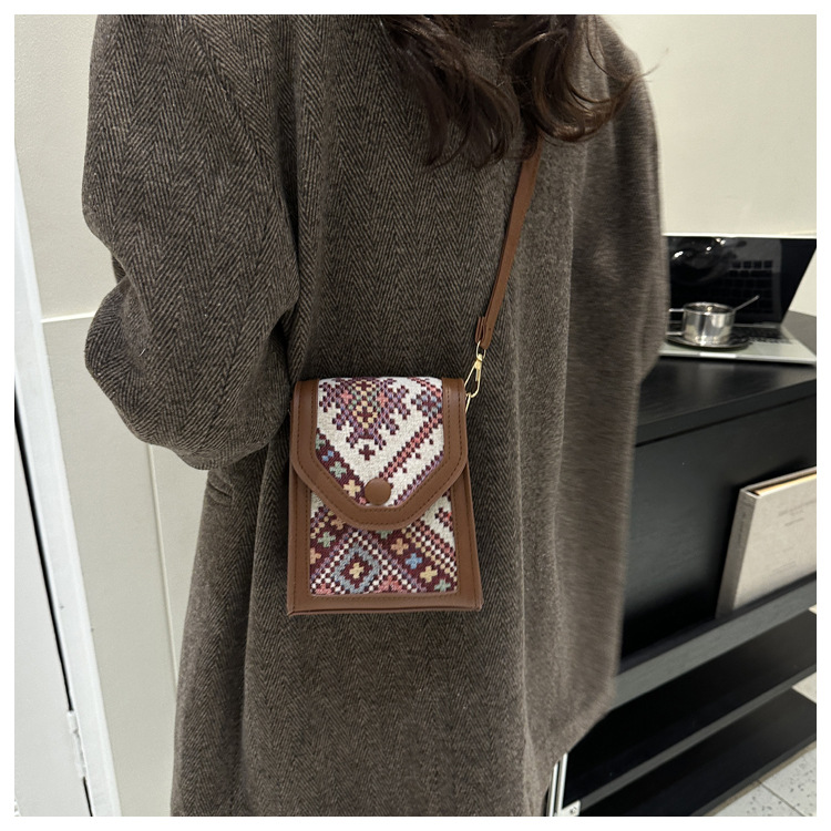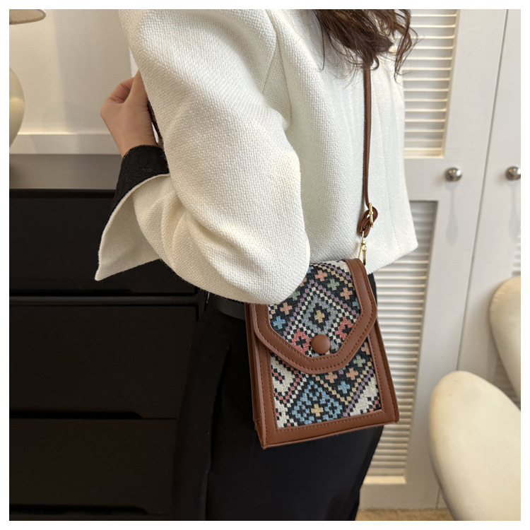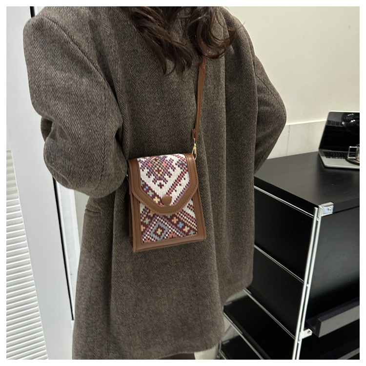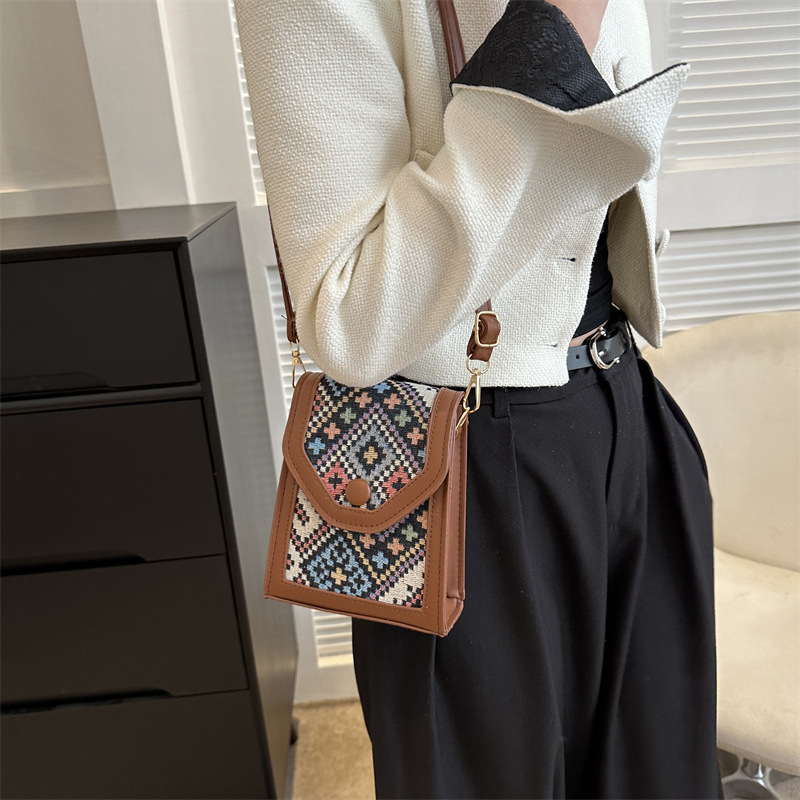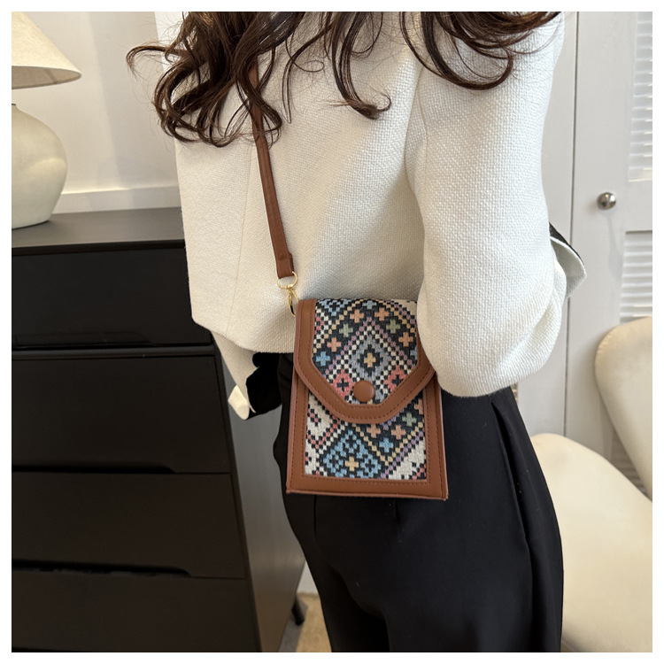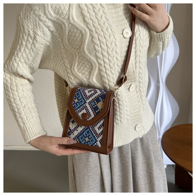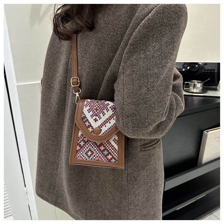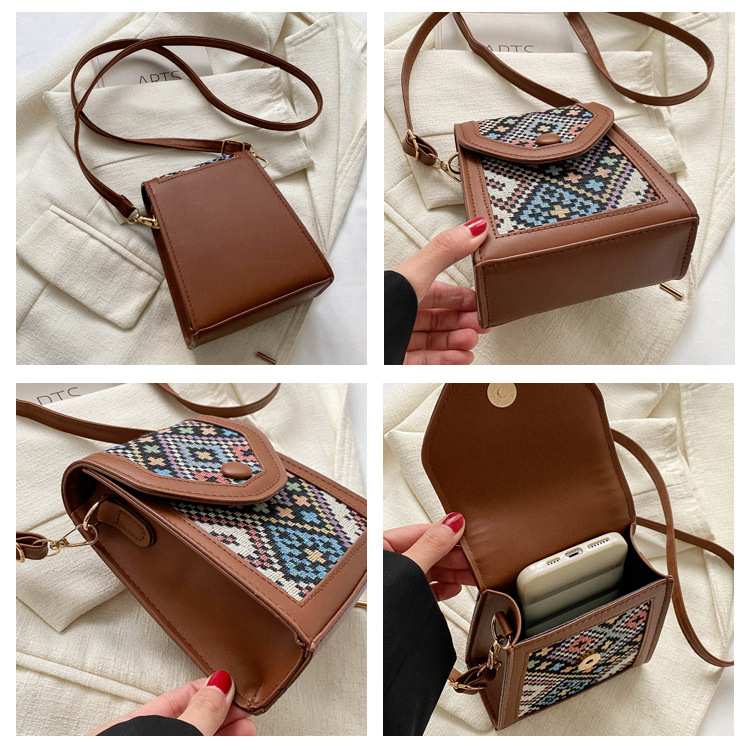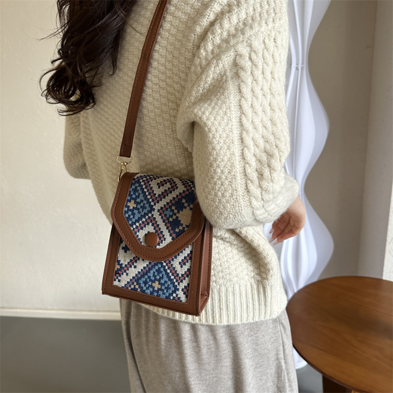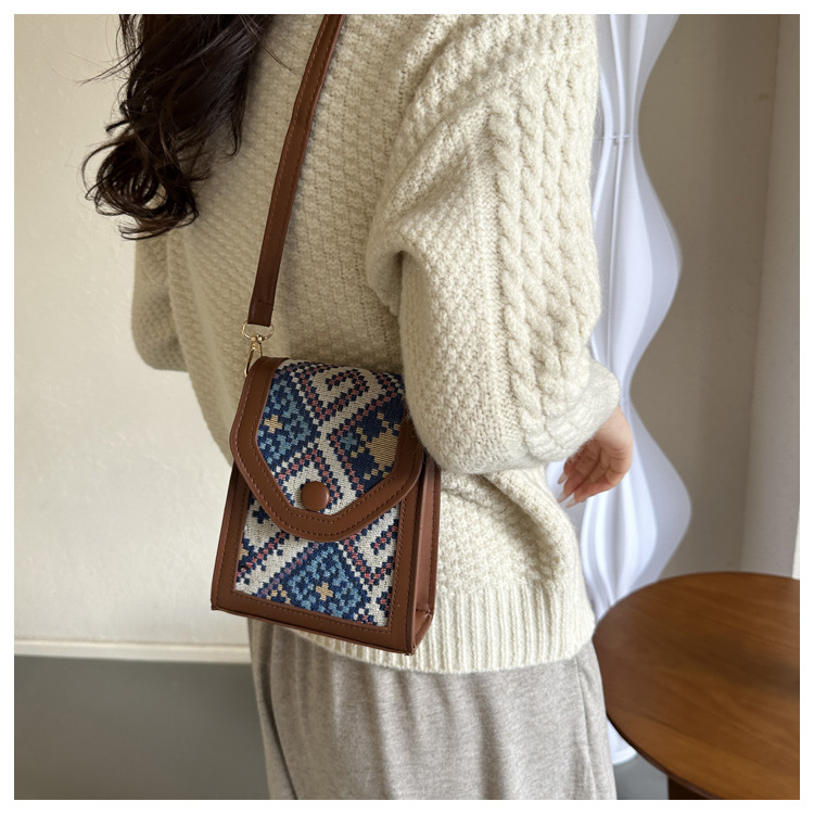 세련된 민족 스타일 크로스 바디 휴대 전화 가방 2023 겨울 새로운 스타일 싱글 숄더 작은 사각형 가방 세련된 대비 색상 동전 지갑