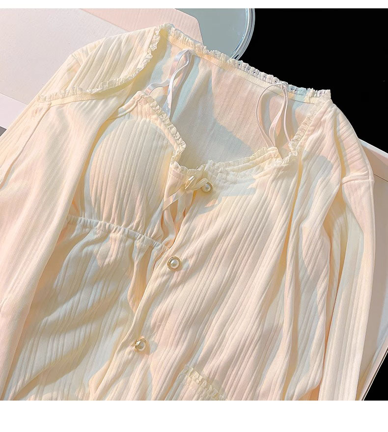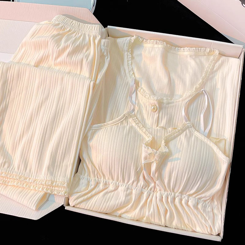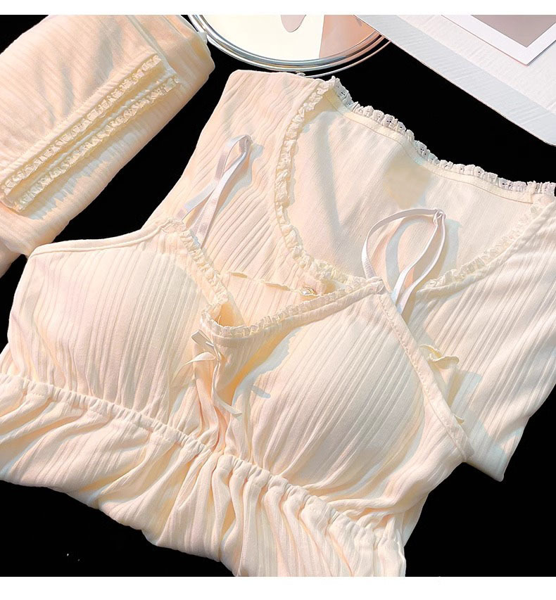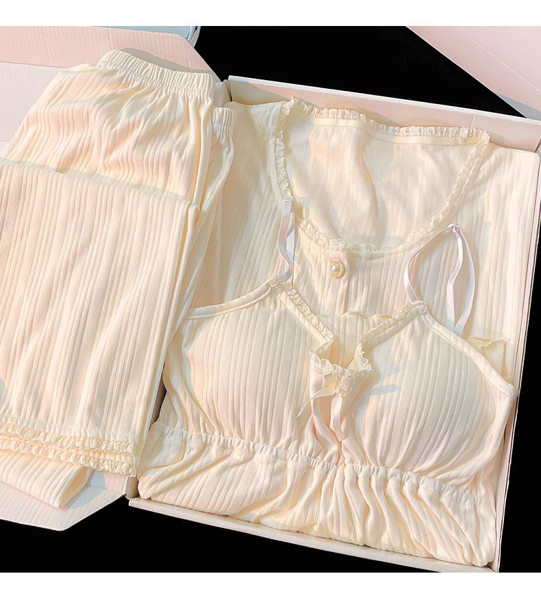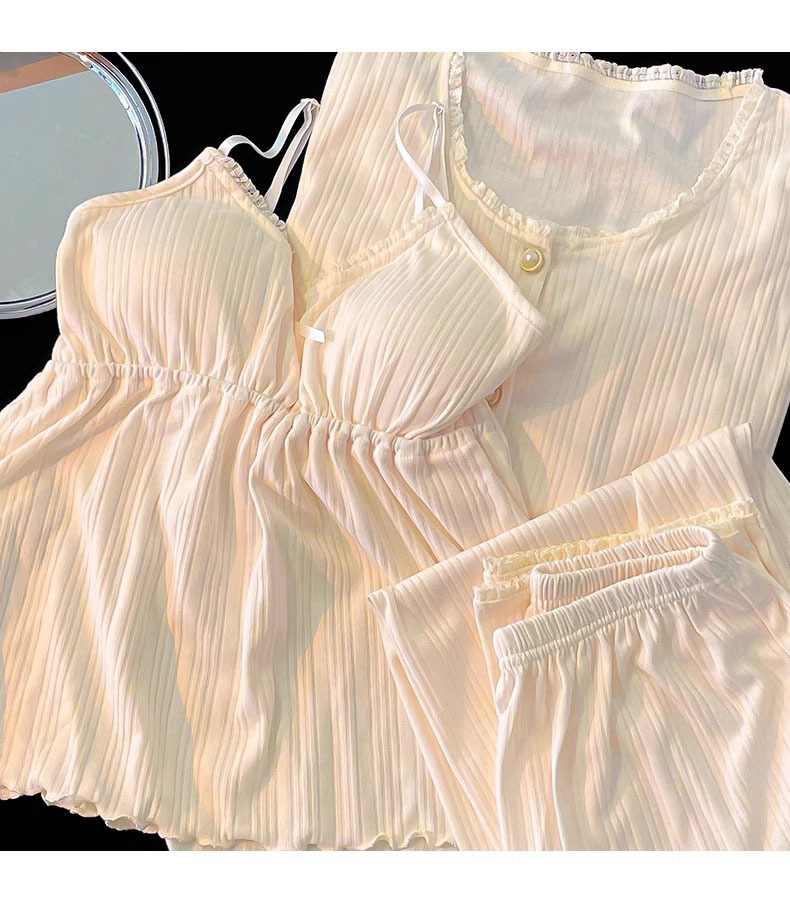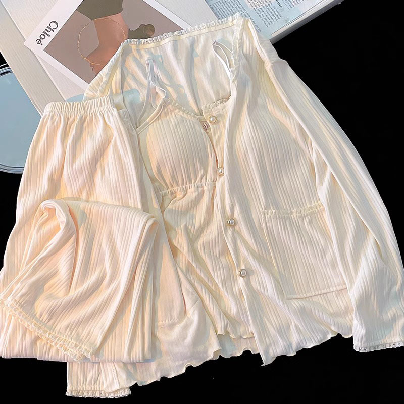 가벼운 살구색 스타일 달콤한 잠옷 여성의 봄과 가을 긴 소매 아웃웨어 캐주얼 4 피스 세트 가슴 패드 슬링