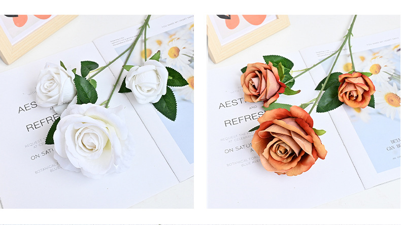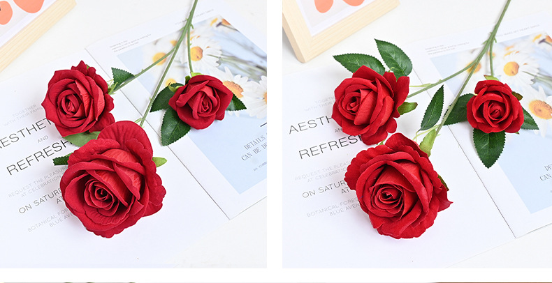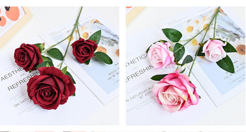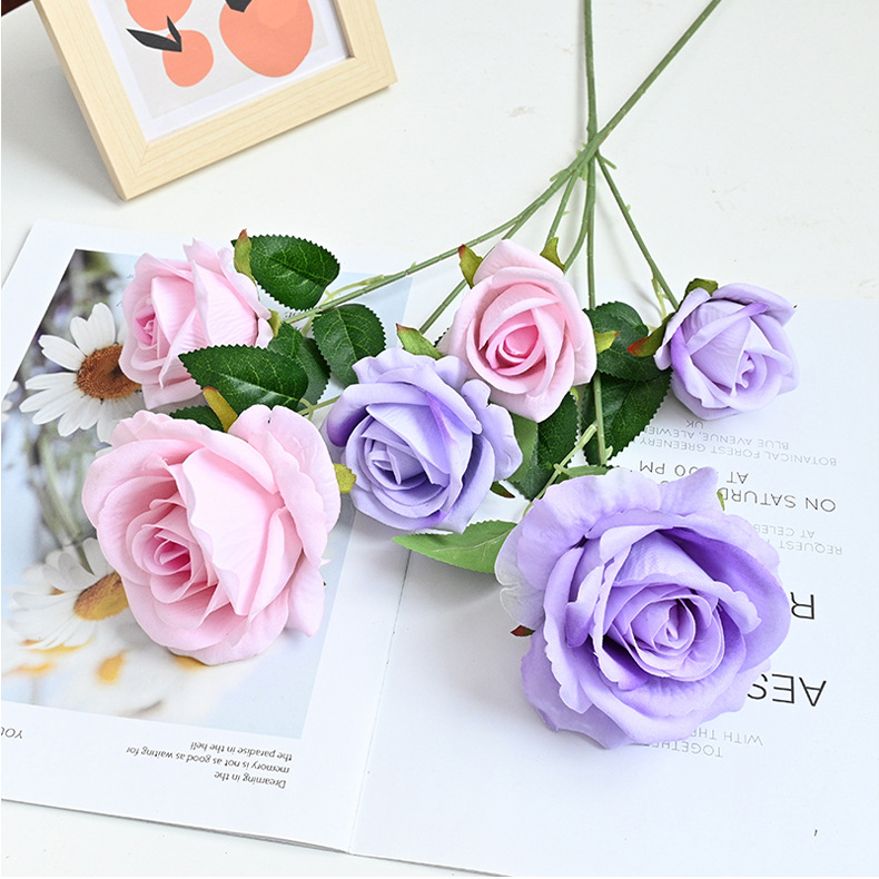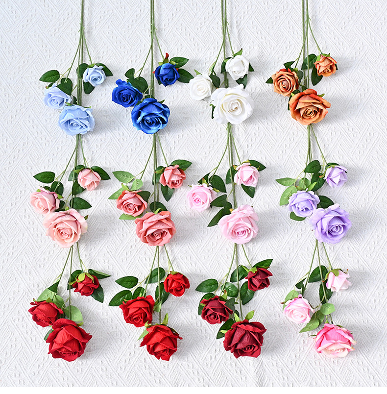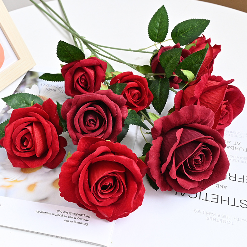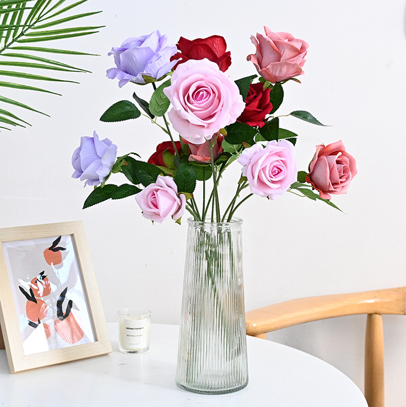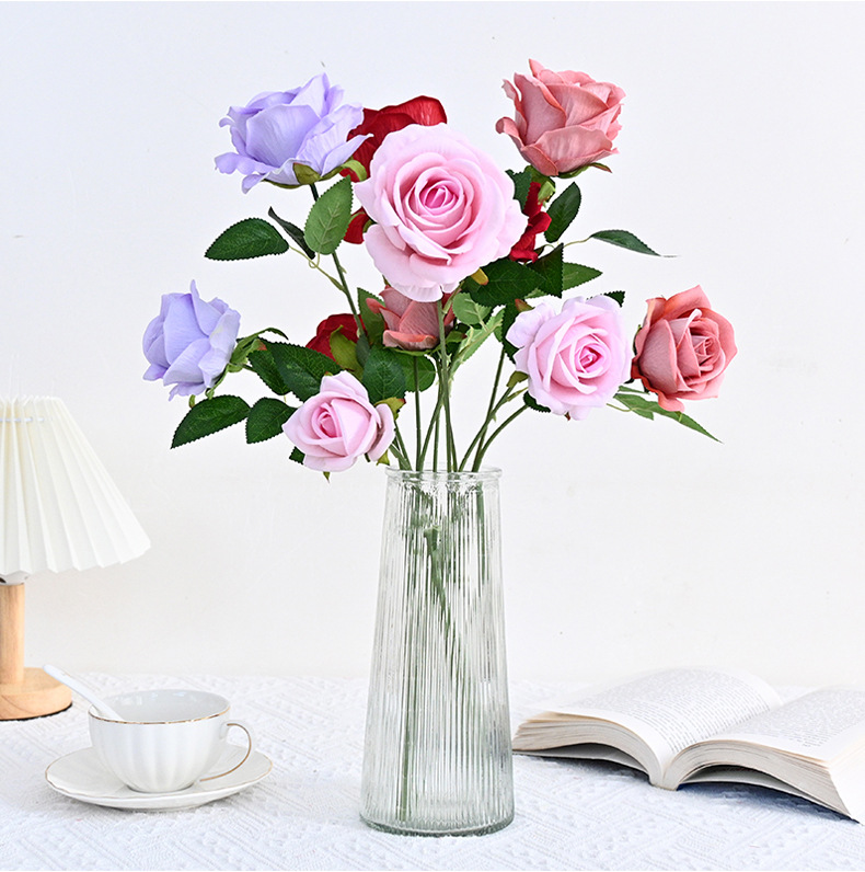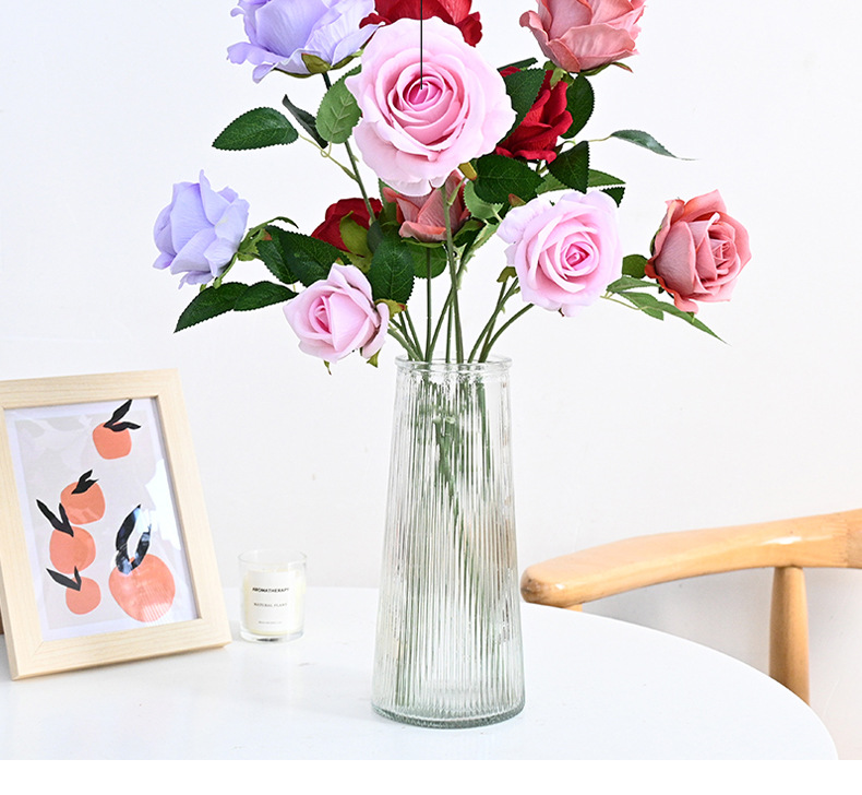 도매 3 헤드 플란넬 로즈 웨딩 홀 꽃꽂이 장식 꽃병 아름다운 시뮬레이션 멀티 헤드 장미 바닥 행 홈