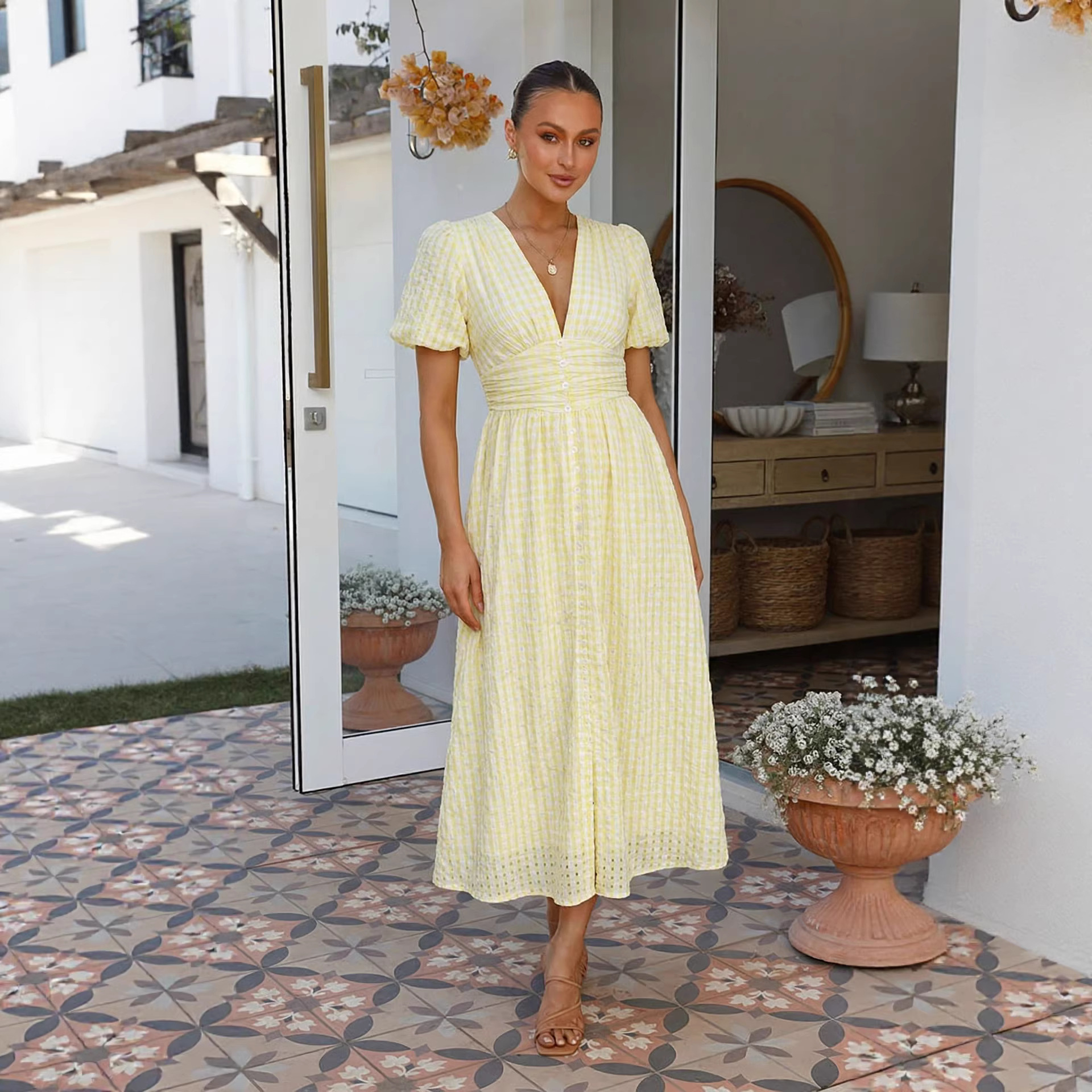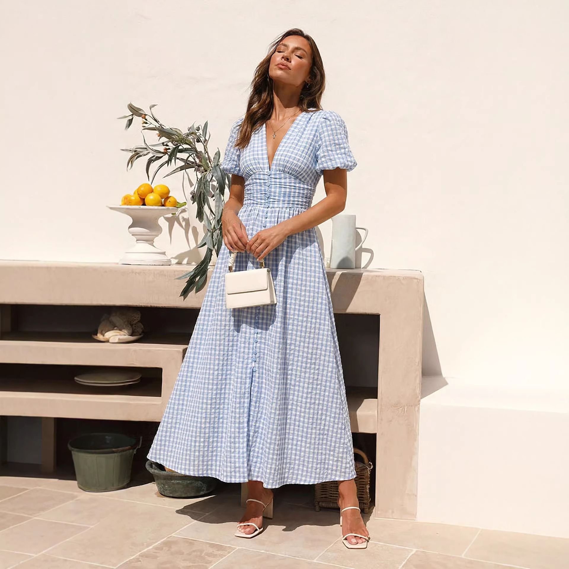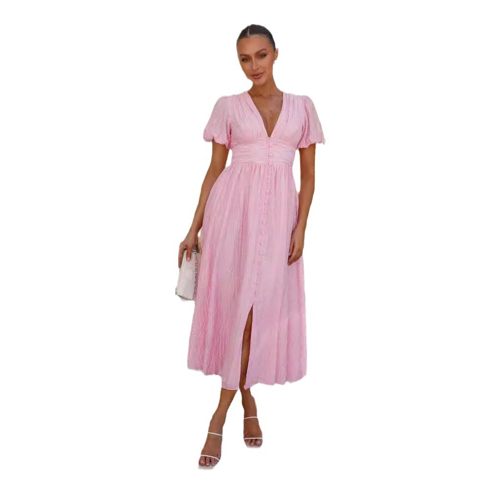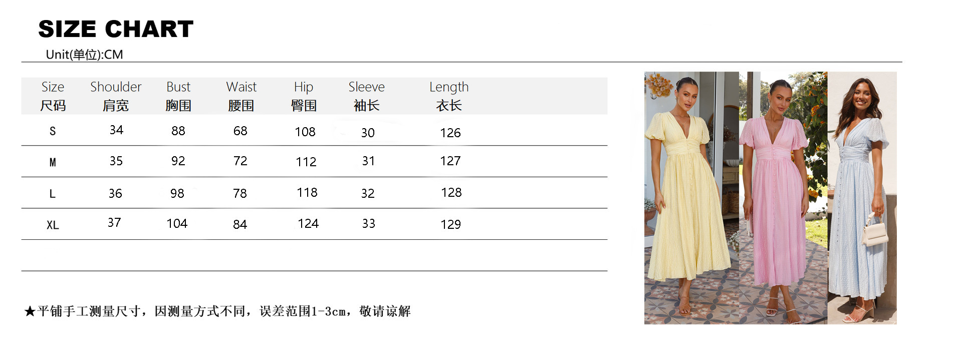 국경 간 유럽과 미국 2024 여성의 새로운 솔리드 컬러 V 넥 롱 버블 슬리브 대형 슬림 원피스