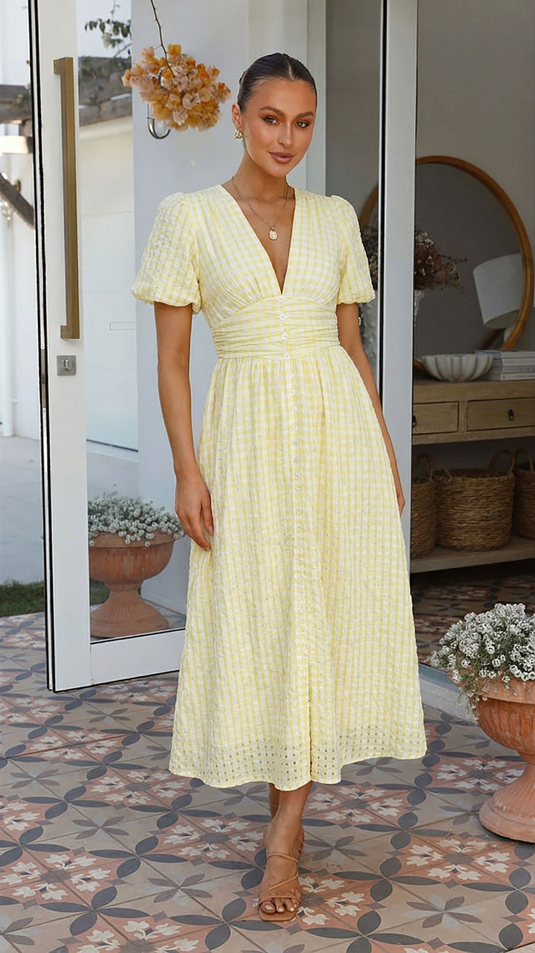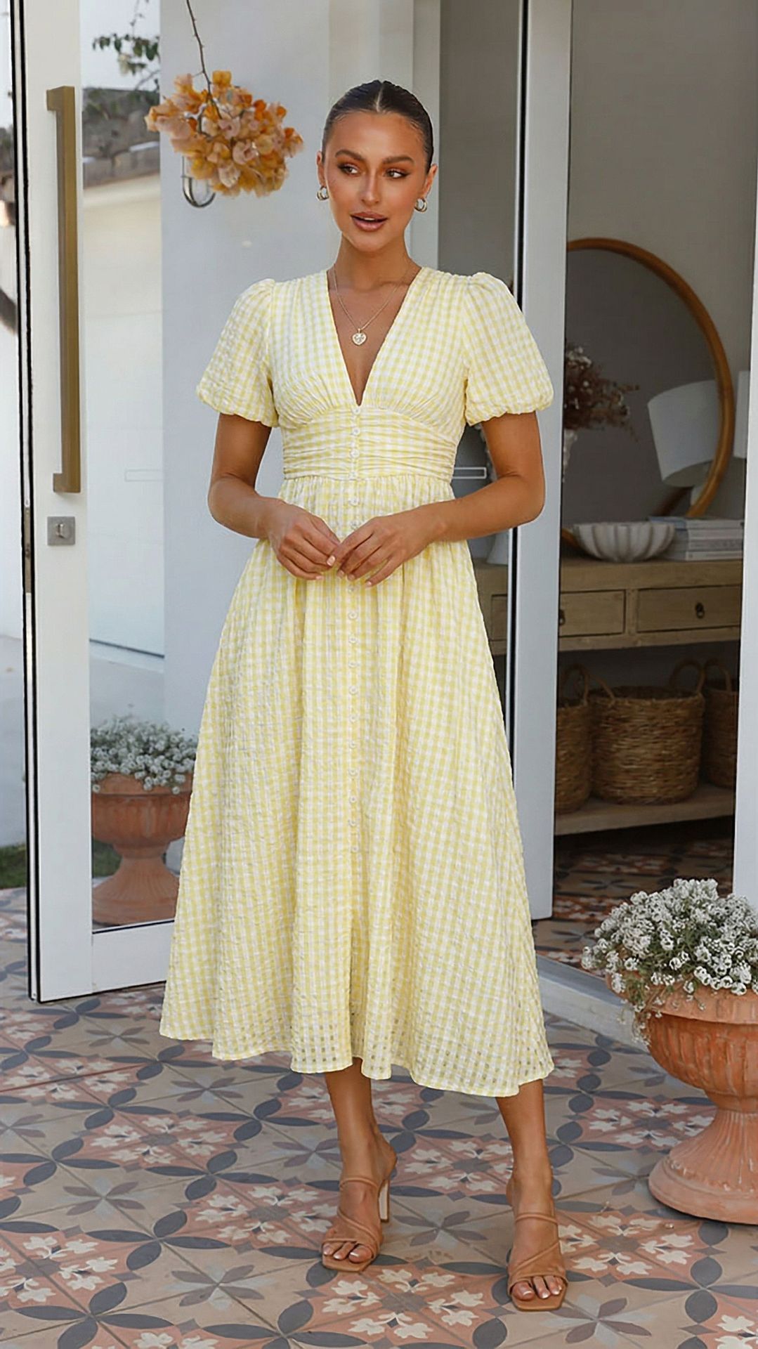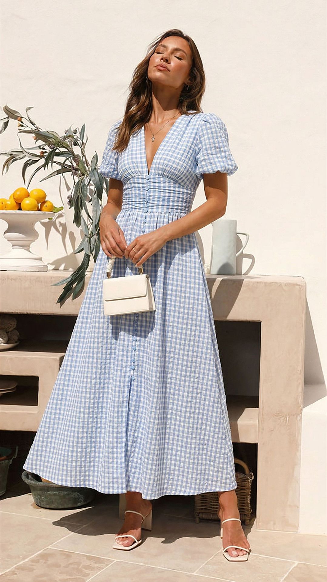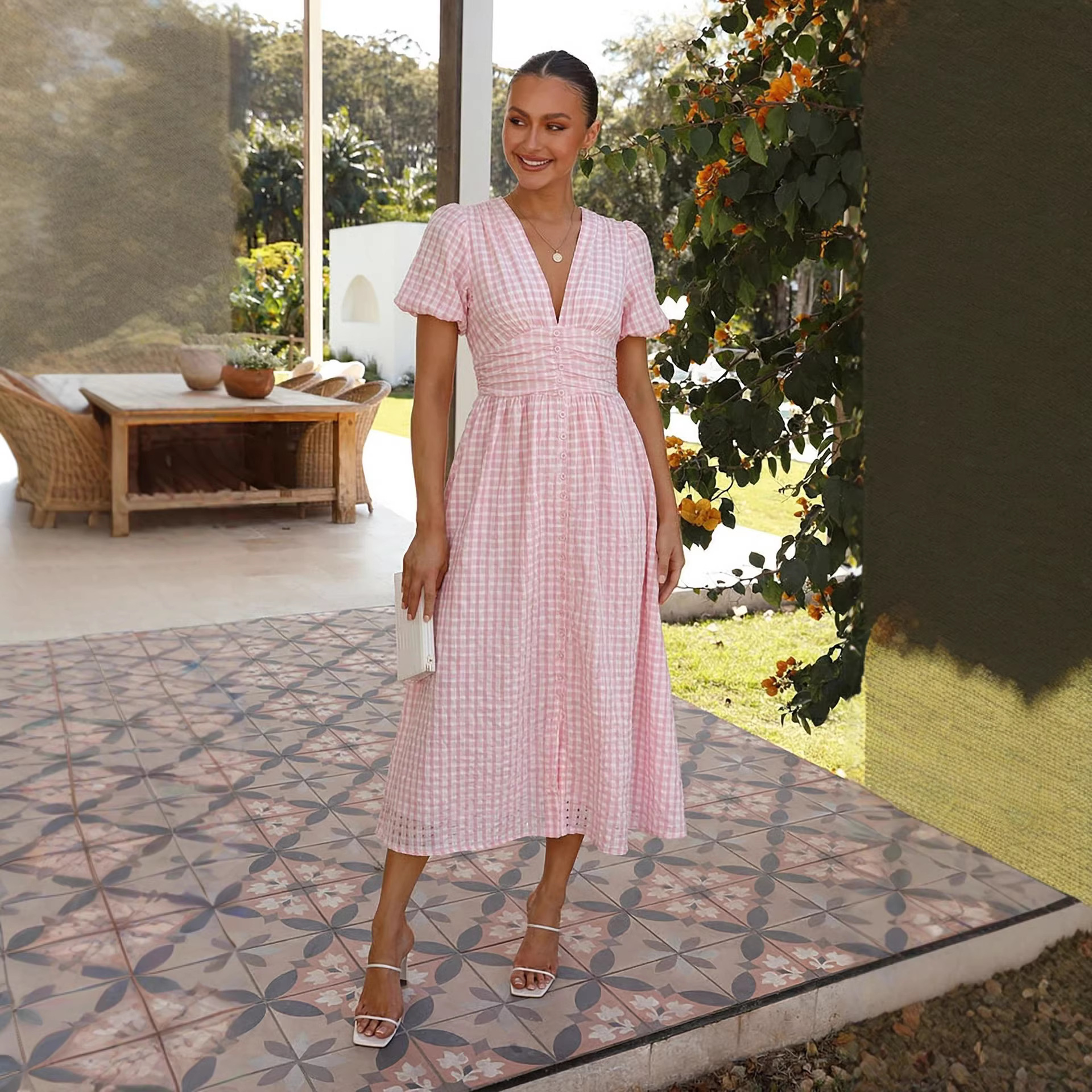 국경 간 유럽과 미국 2024 여성의 새로운 솔리드 컬러 V 넥 롱 버블 슬리브 대형 슬림 원피스