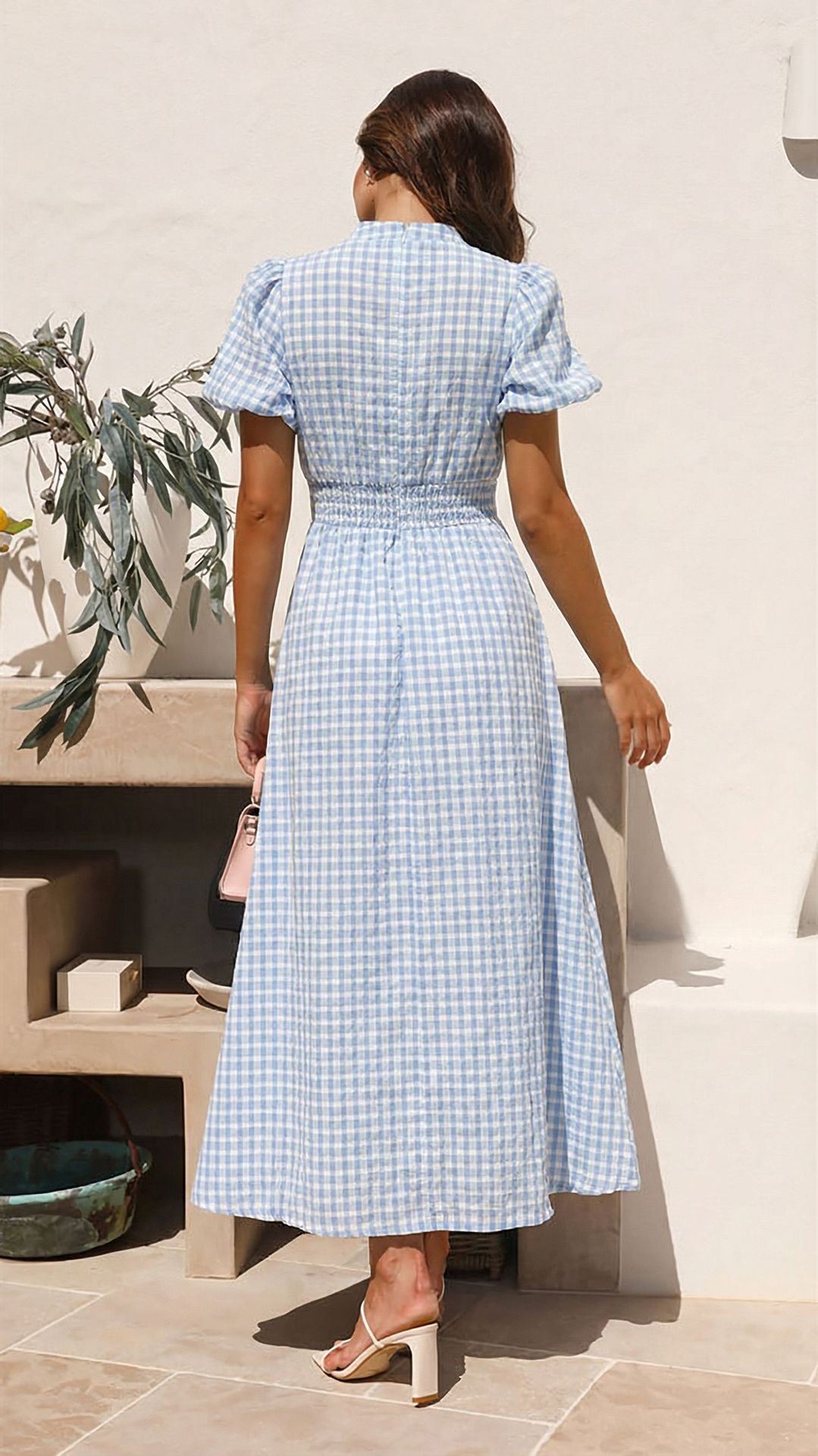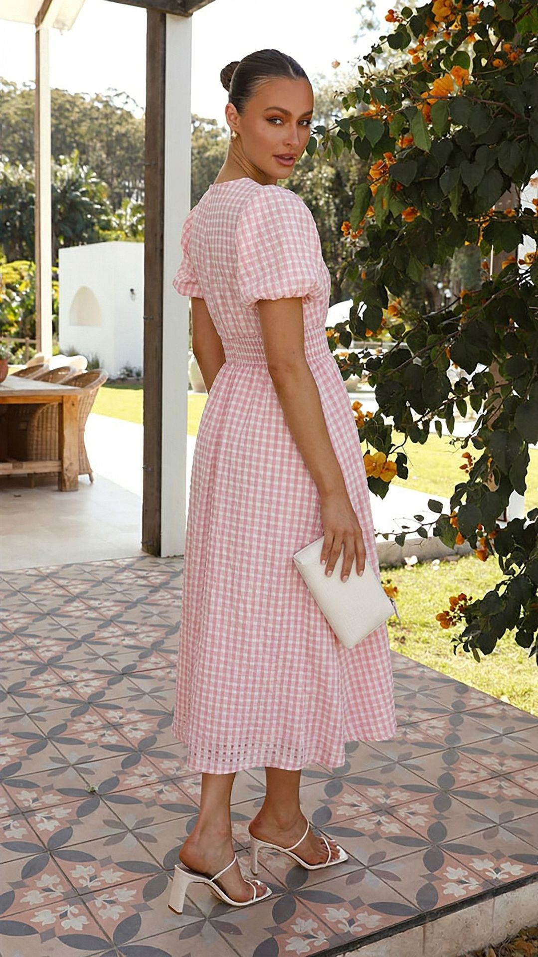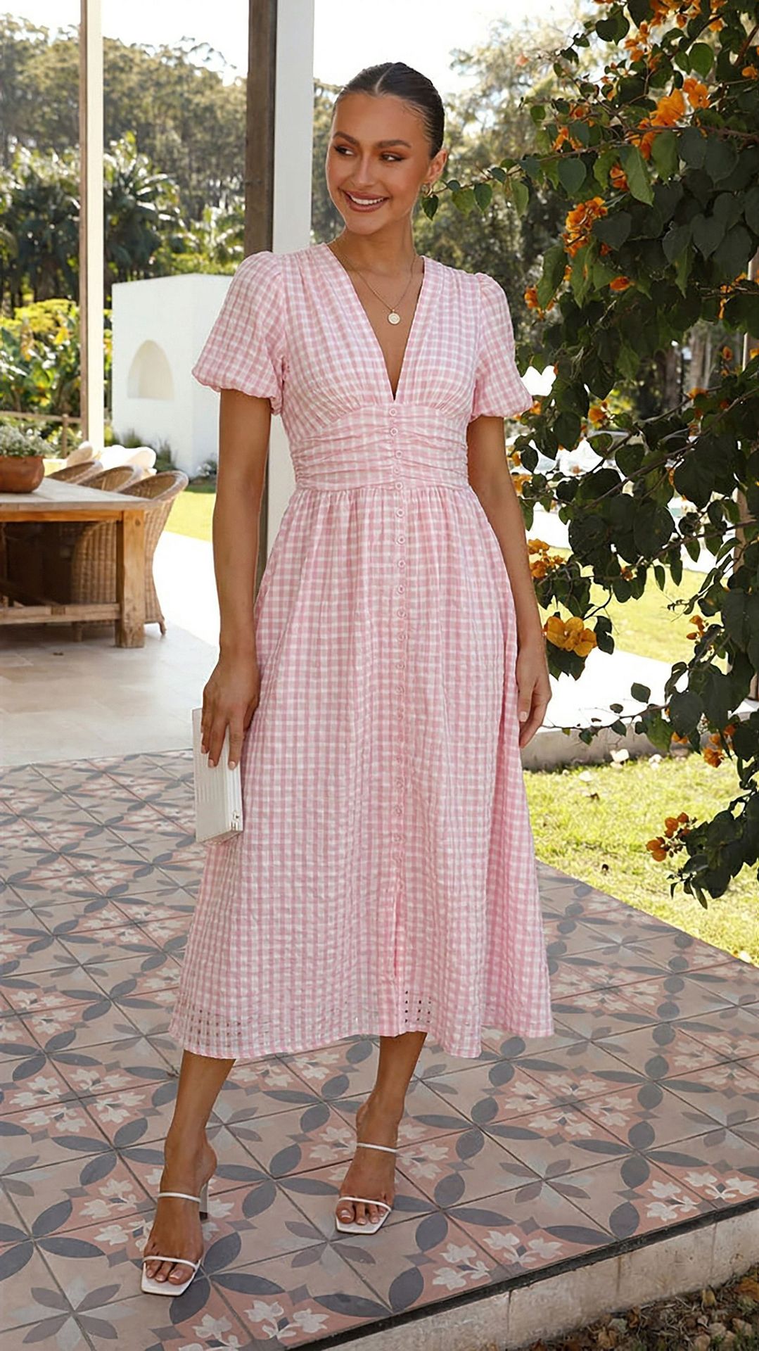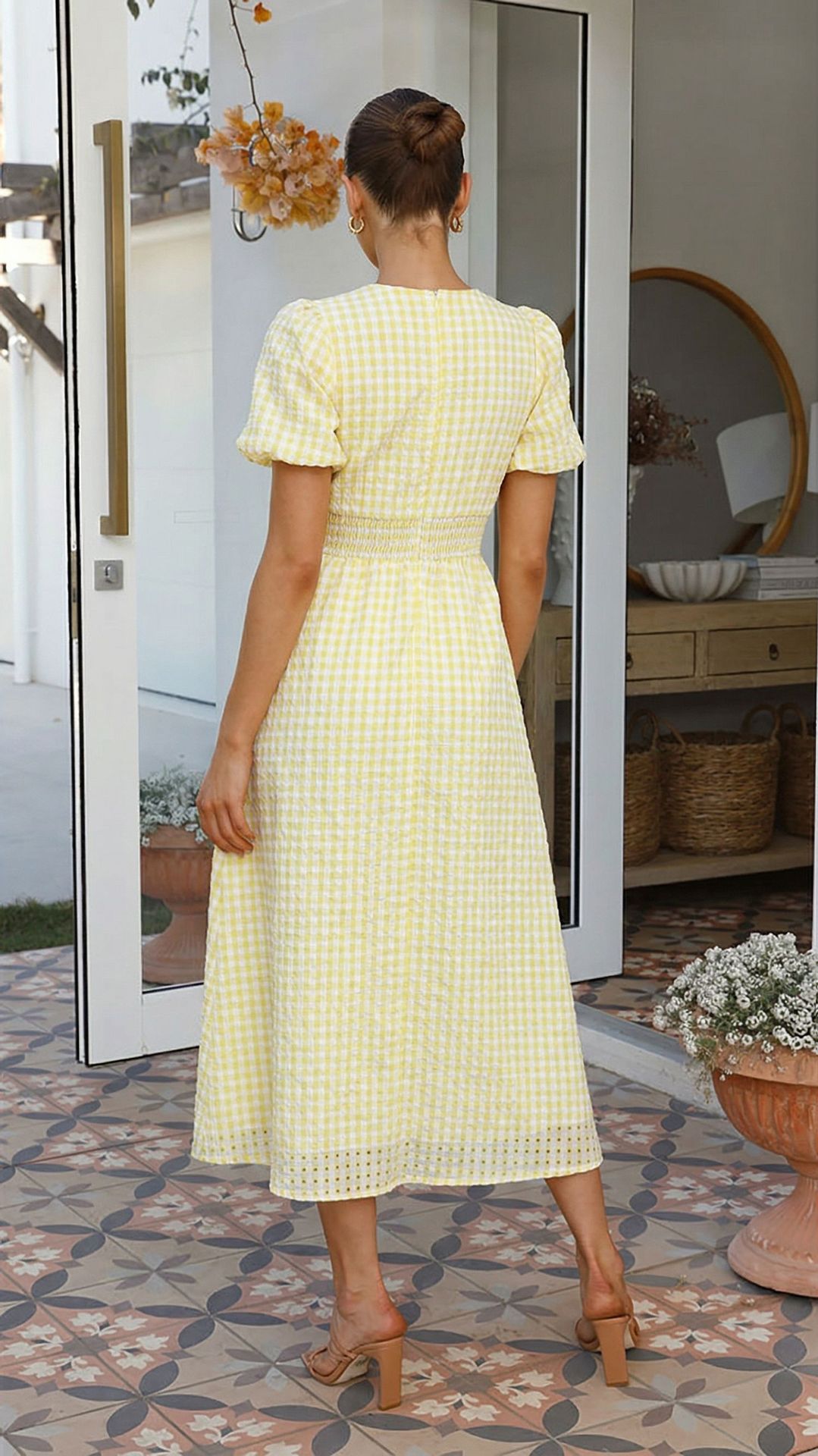 국경 간 유럽과 미국 2024 여성의 새로운 솔리드 컬러 V 넥 롱 버블 슬리브 대형 슬림 원피스