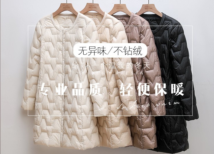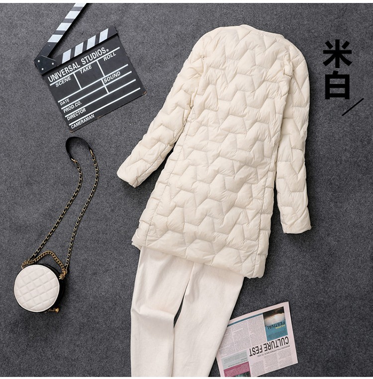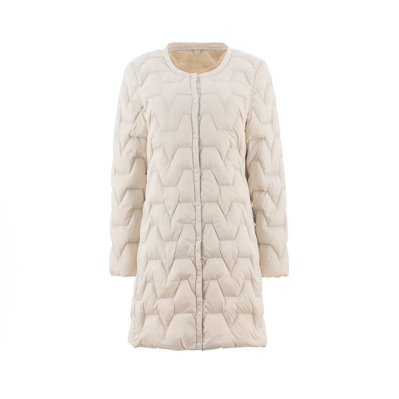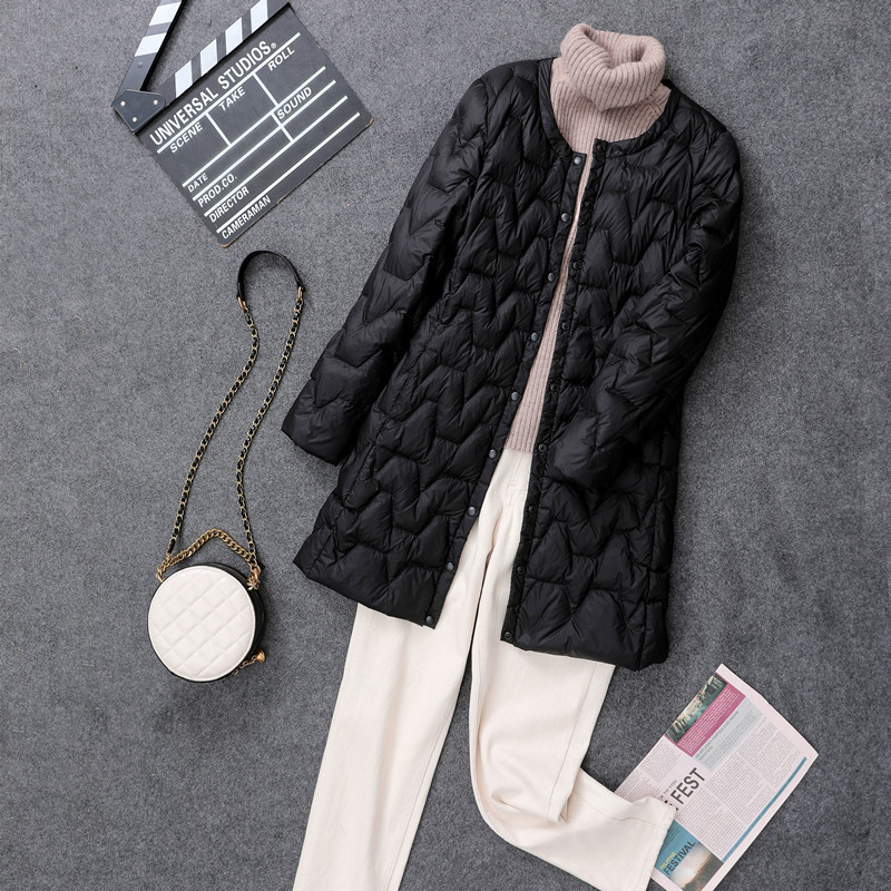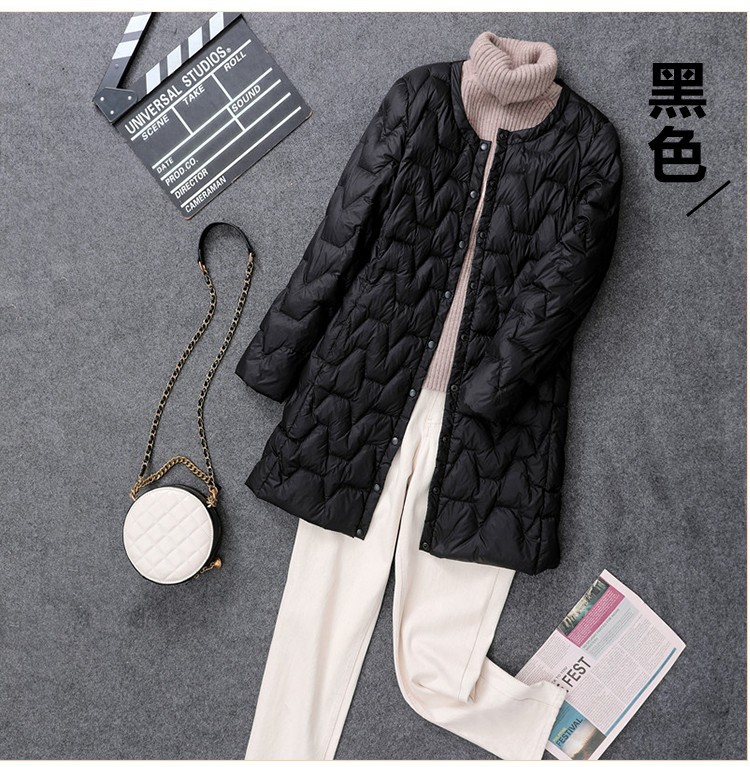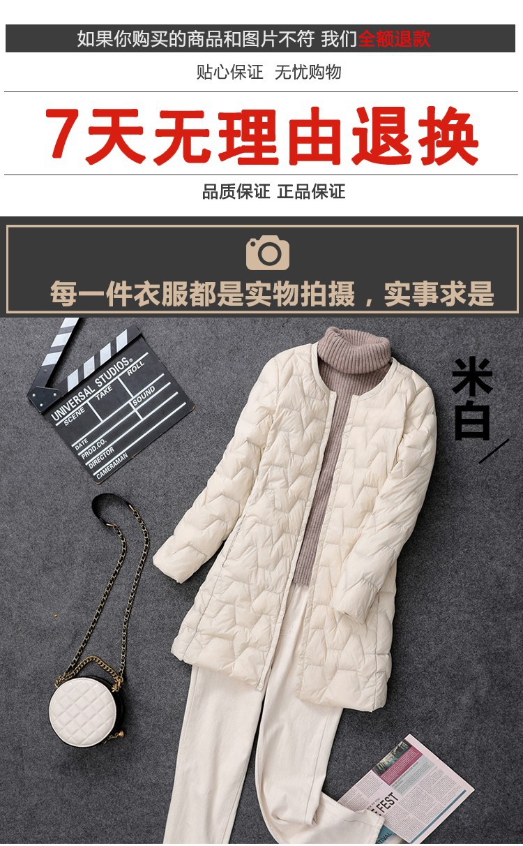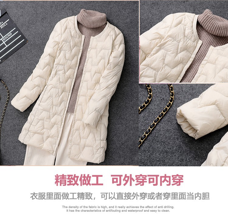 2024 가을과 겨울 새로운 경량 다운 재킷 여성용 칼라리스 중간 길이의 코트 경량 라운드 넥 슬림 핏 트렌디 이너 라이너