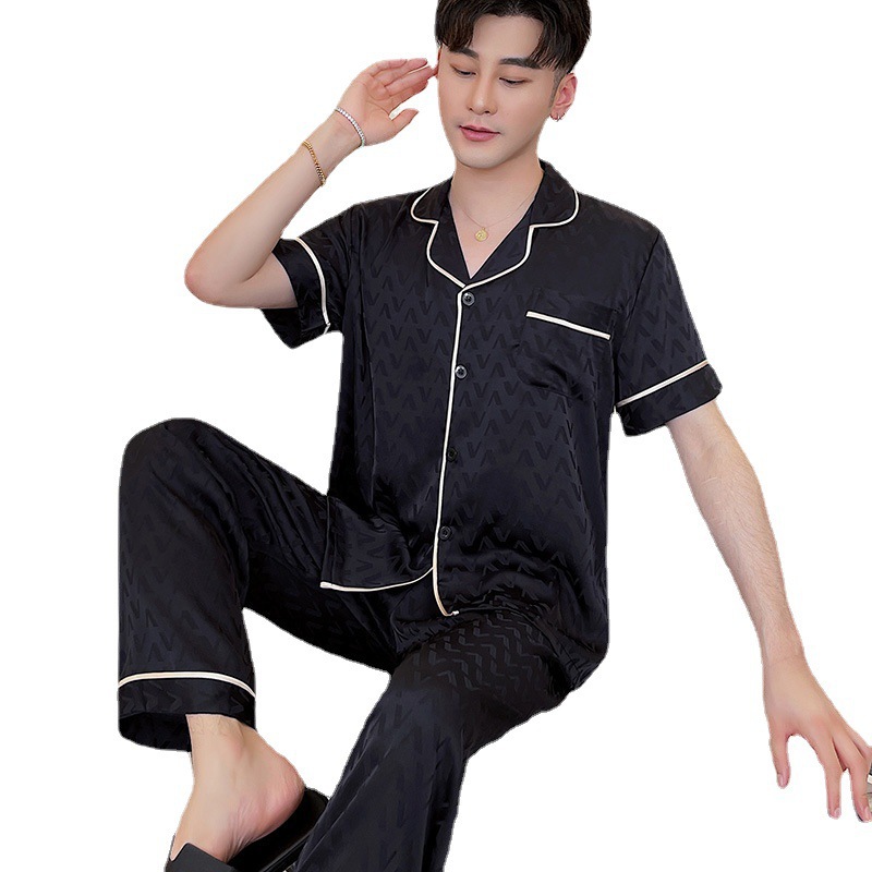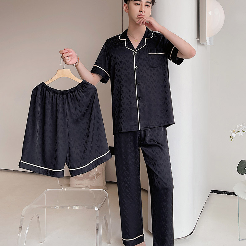잠옷 여름 남자 아이스 실크 반팔 바지 3 피스 자카드 새로운 캐주얼 얇은 실크 홈웨어 세트