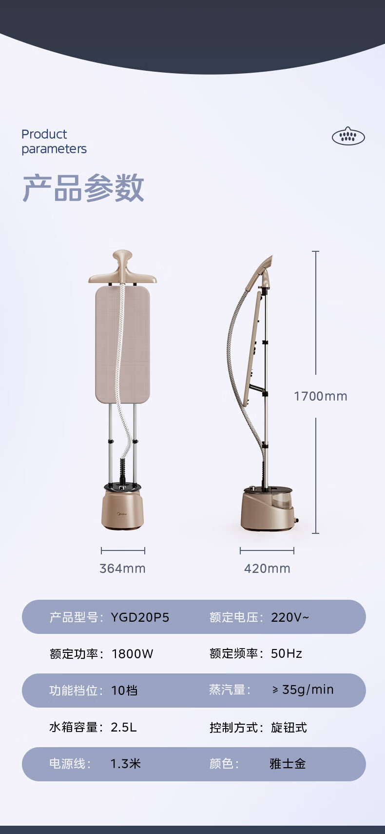 Midea 매달려 다림질 기계 가정용 이중 극 휴대용 다림질 기계 증기 매달려 다림질 기계 2.5 L 전기 철 YGD20P5