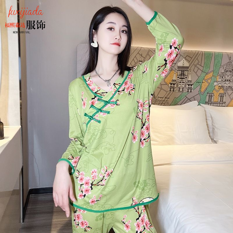 인터넷 유명 인사 스타일 북동쪽 큰 꽃 잠옷 세트 여성 민족 스타일 버클 홈웨어 투피스 겨울 벨벳 따뜻한