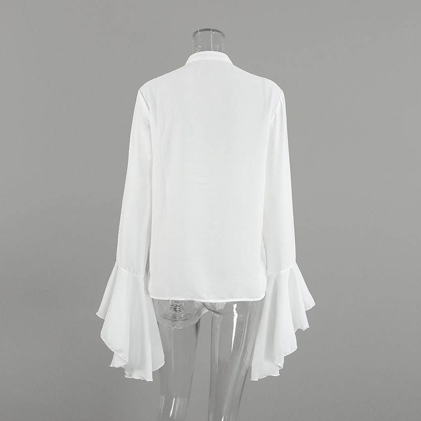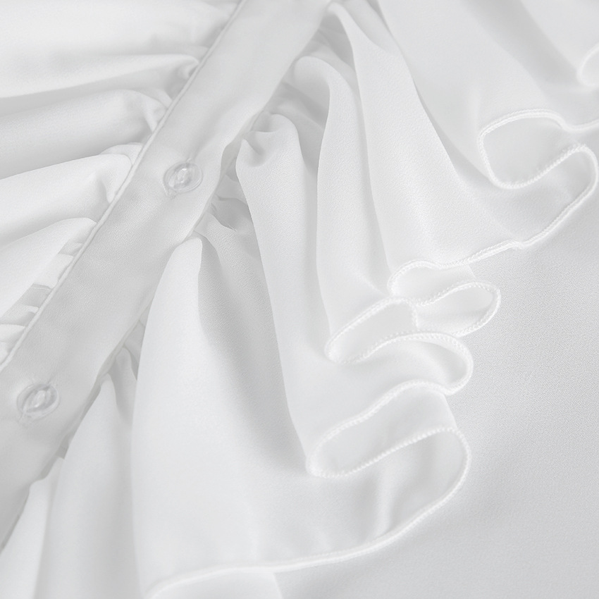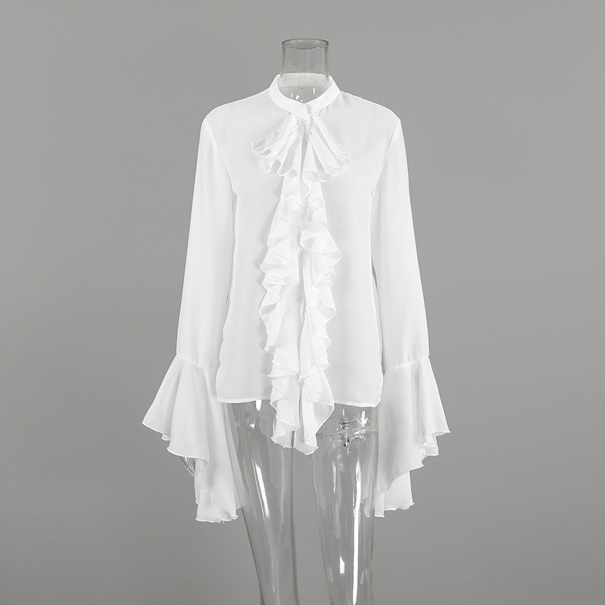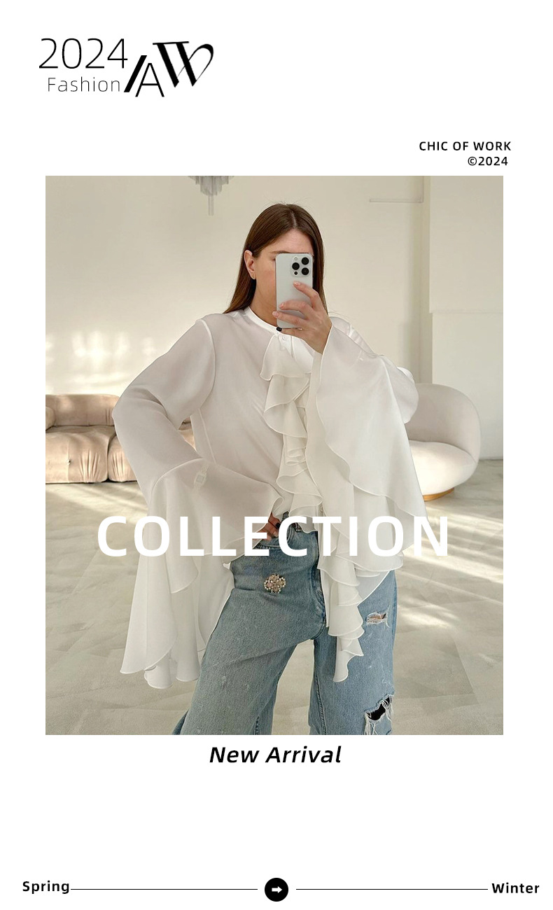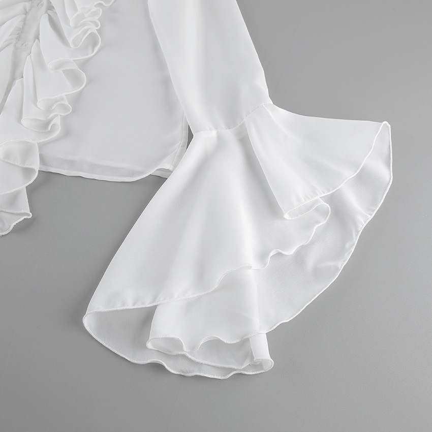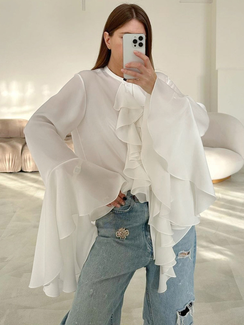 화이트 쉬폰 디자인 라운드넥 벨소매 러플 여성 셔츠 2025 유럽 및 미국 봄 여름 신상 패션 여성복