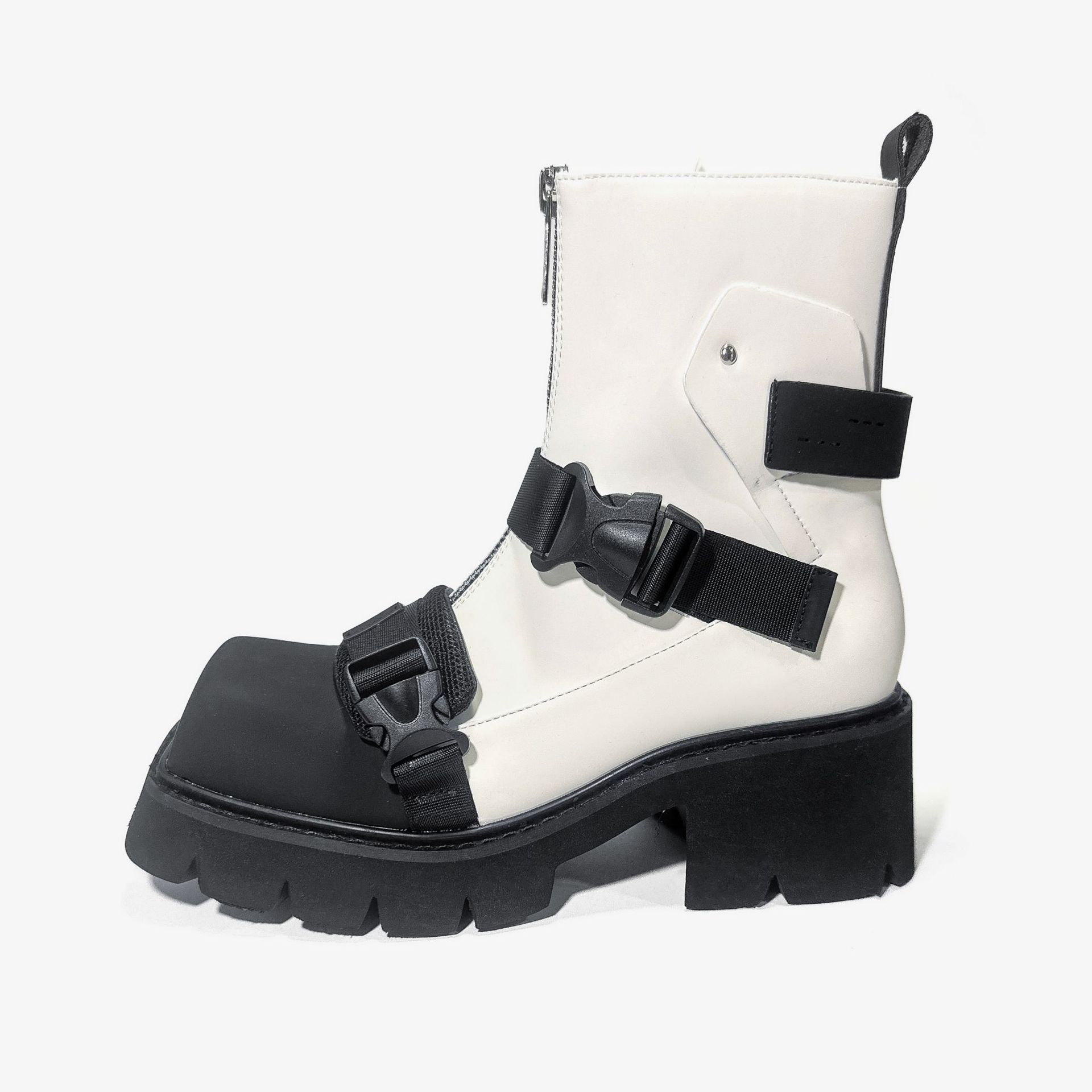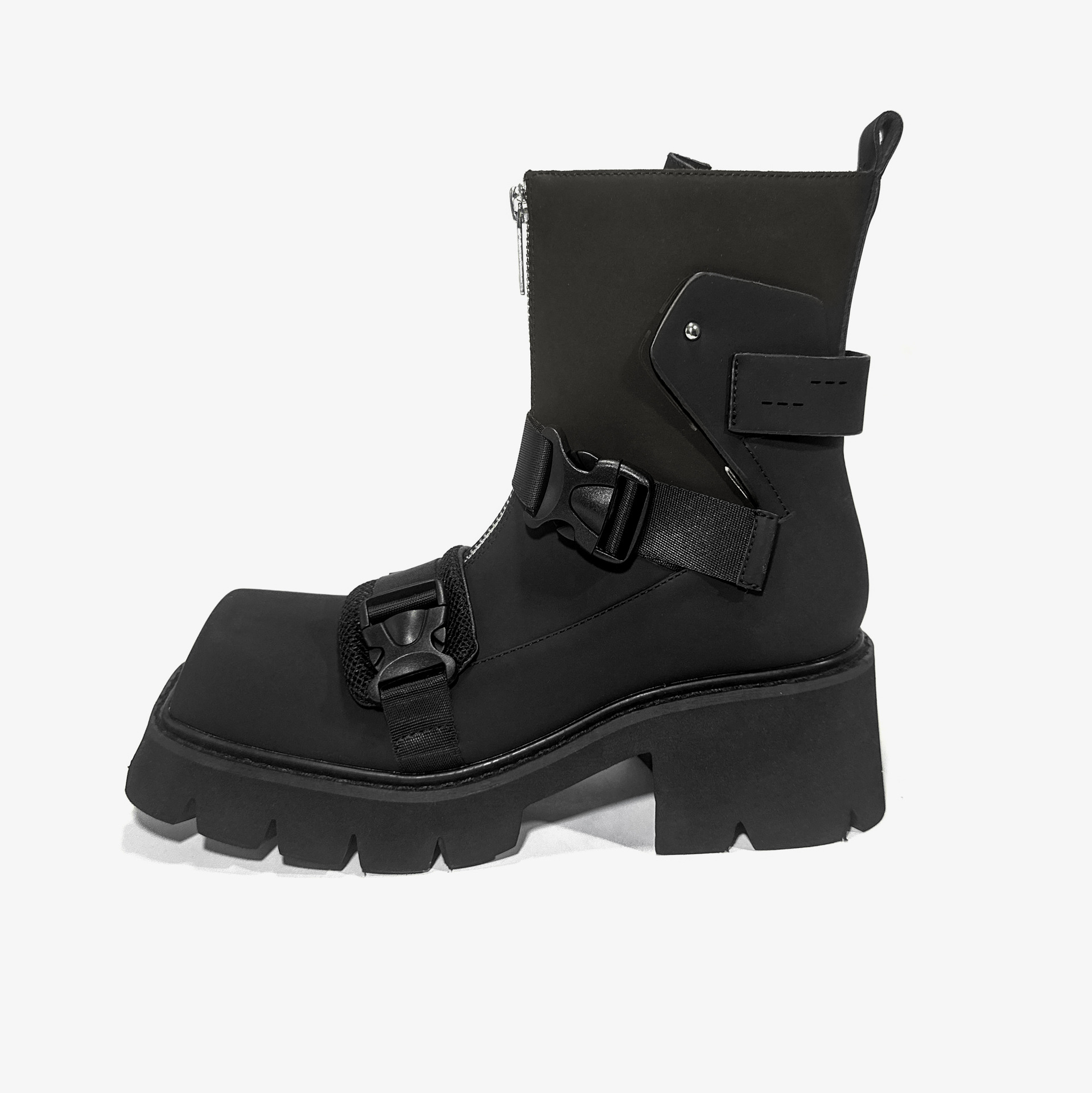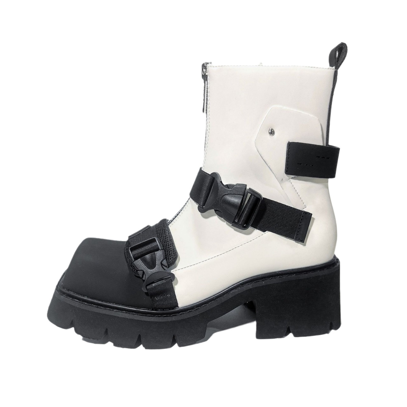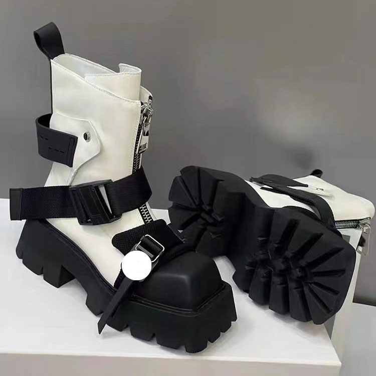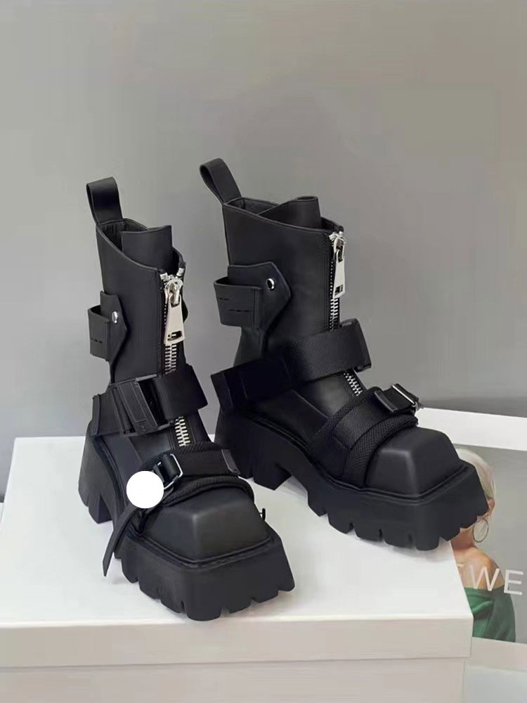 마틴 부츠 여성 유행 2025 새로운 가을, 겨울 유럽과 미국의 광장 발가락 틈새 검은 전사 모바일 중반 송아지 부츠 두꺼운 밑창 플러스 벨벳