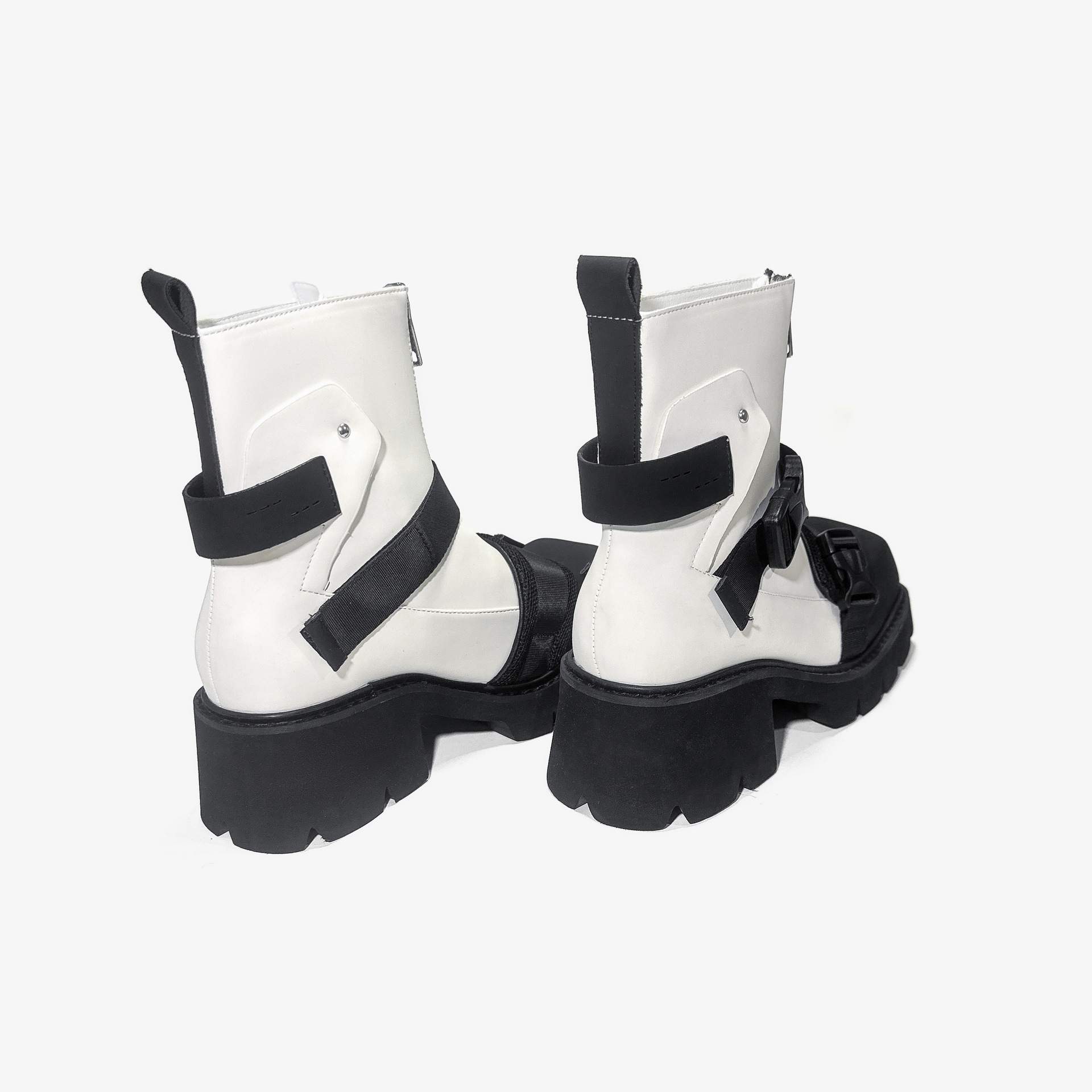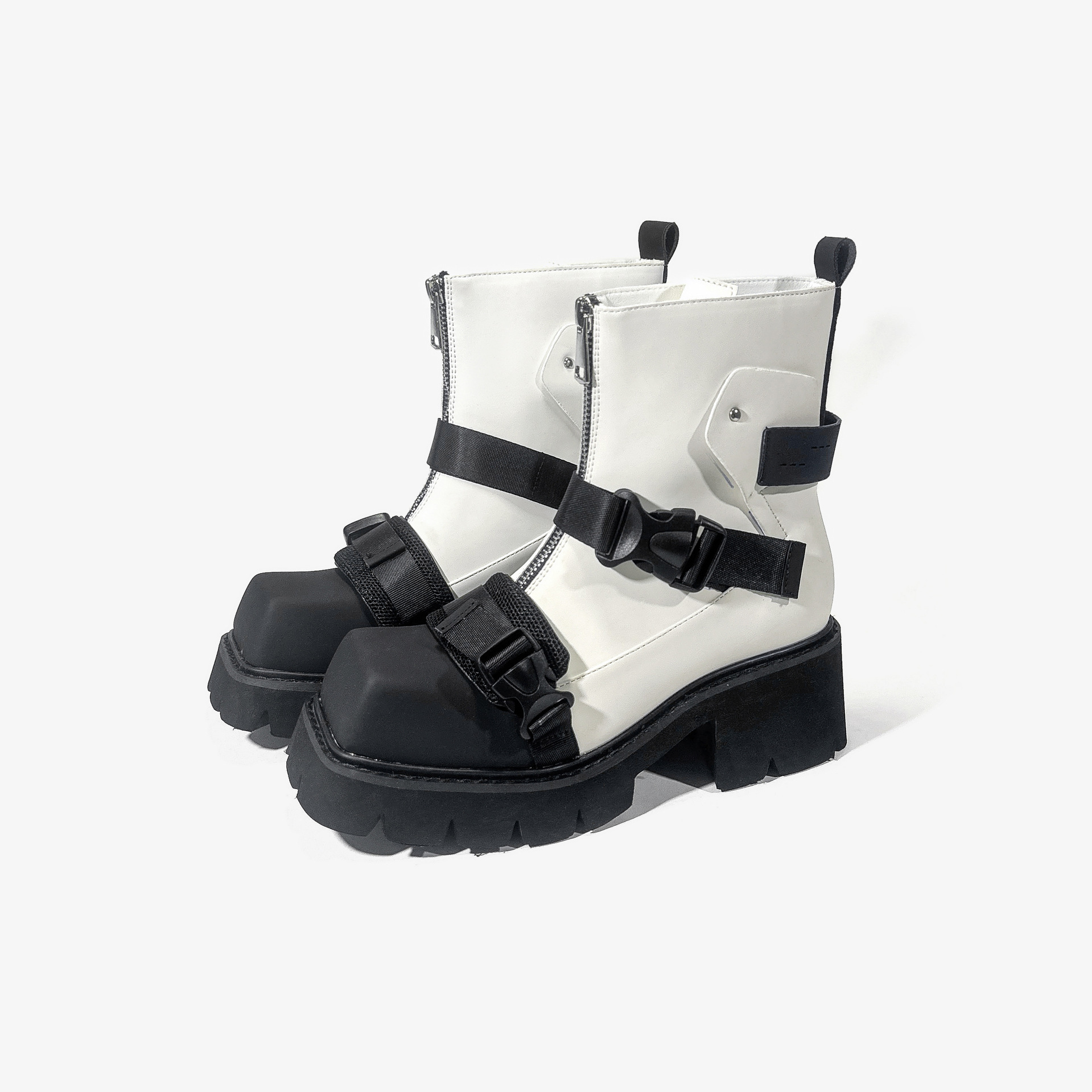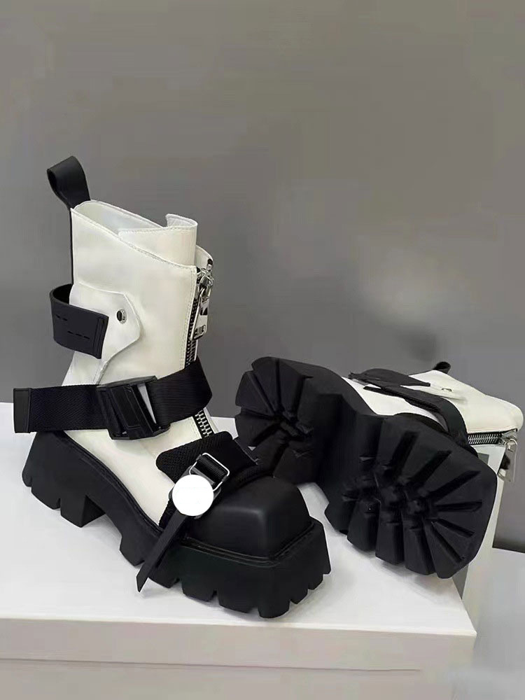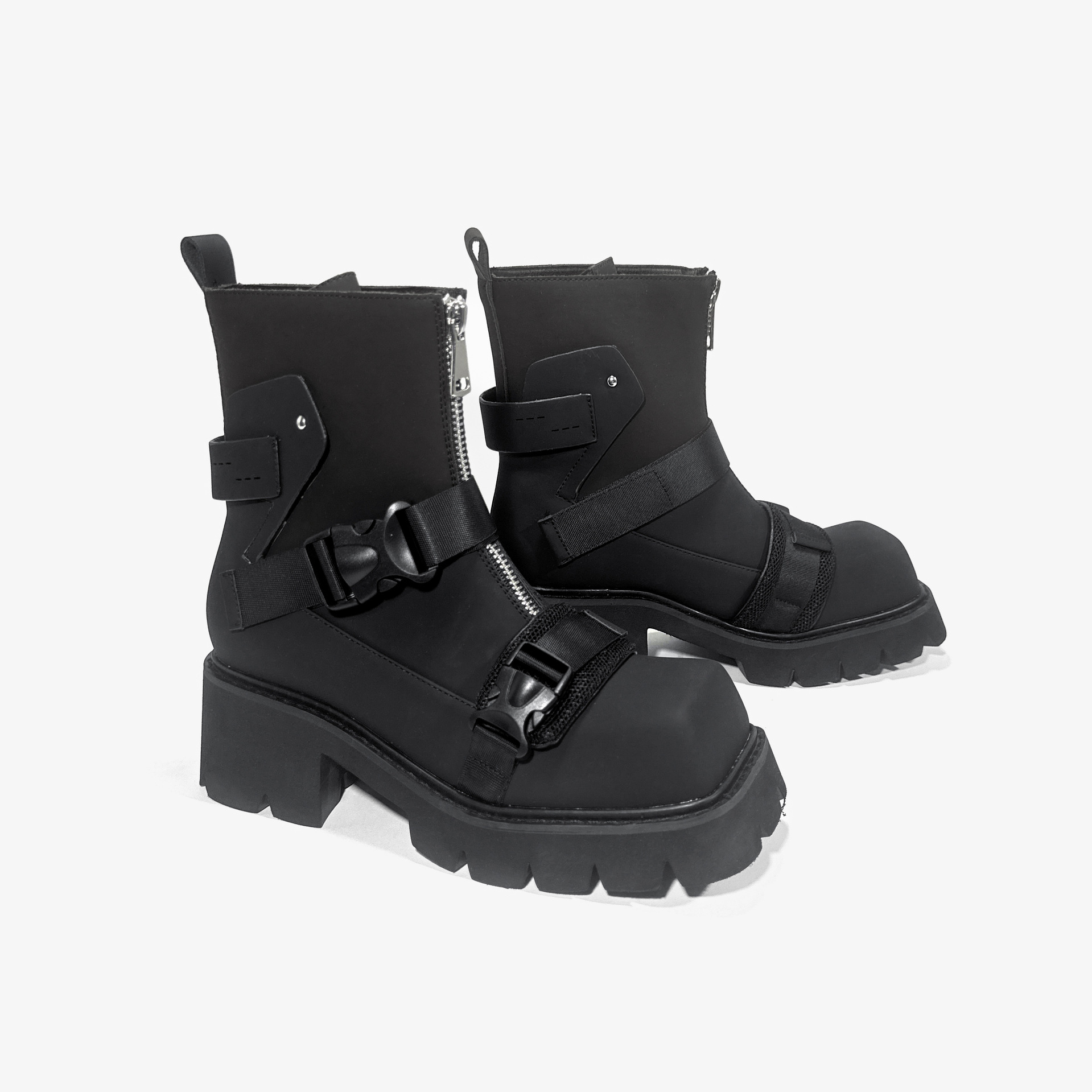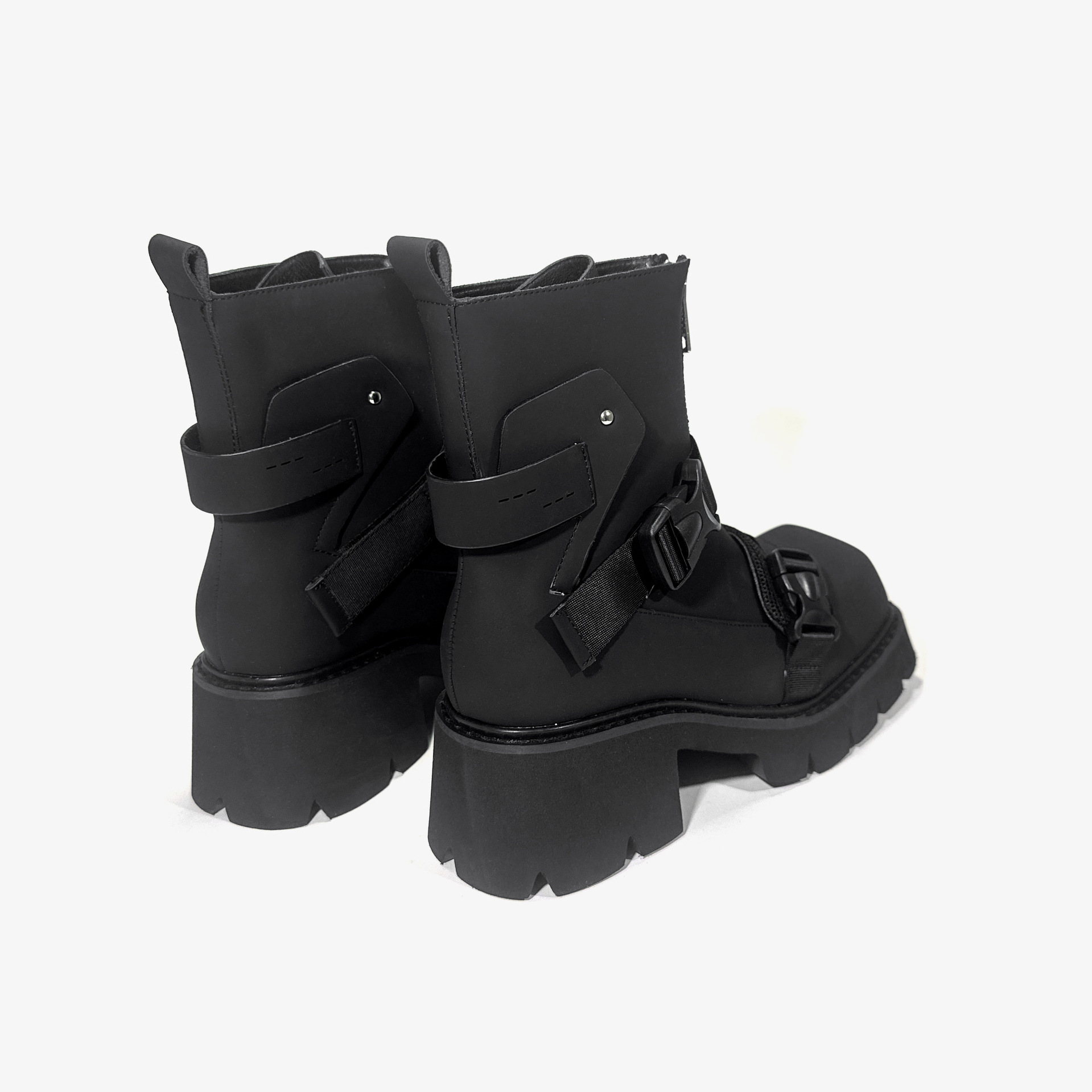 마틴 부츠 여성 유행 2025 새로운 가을, 겨울 유럽과 미국의 광장 발가락 틈새 검은 전사 모바일 중반 송아지 부츠 두꺼운 밑창 플러스 벨벳