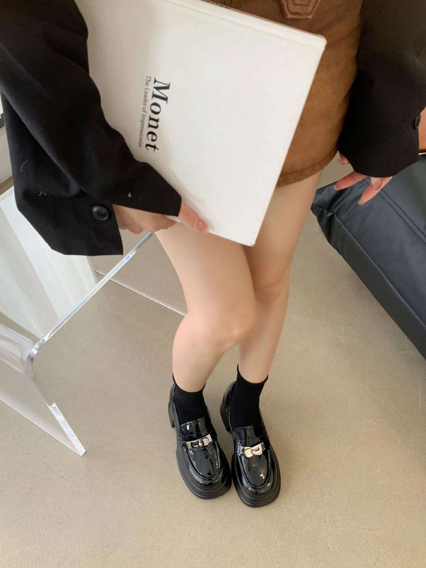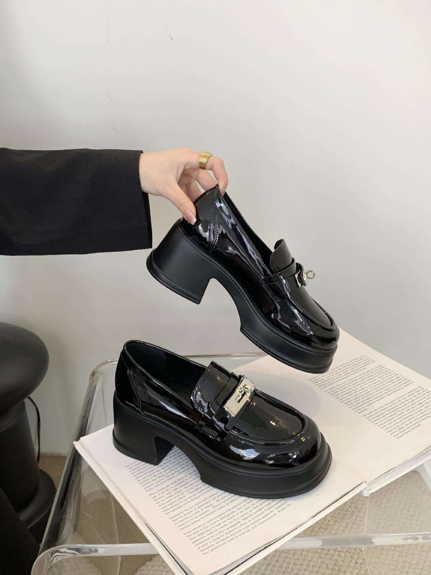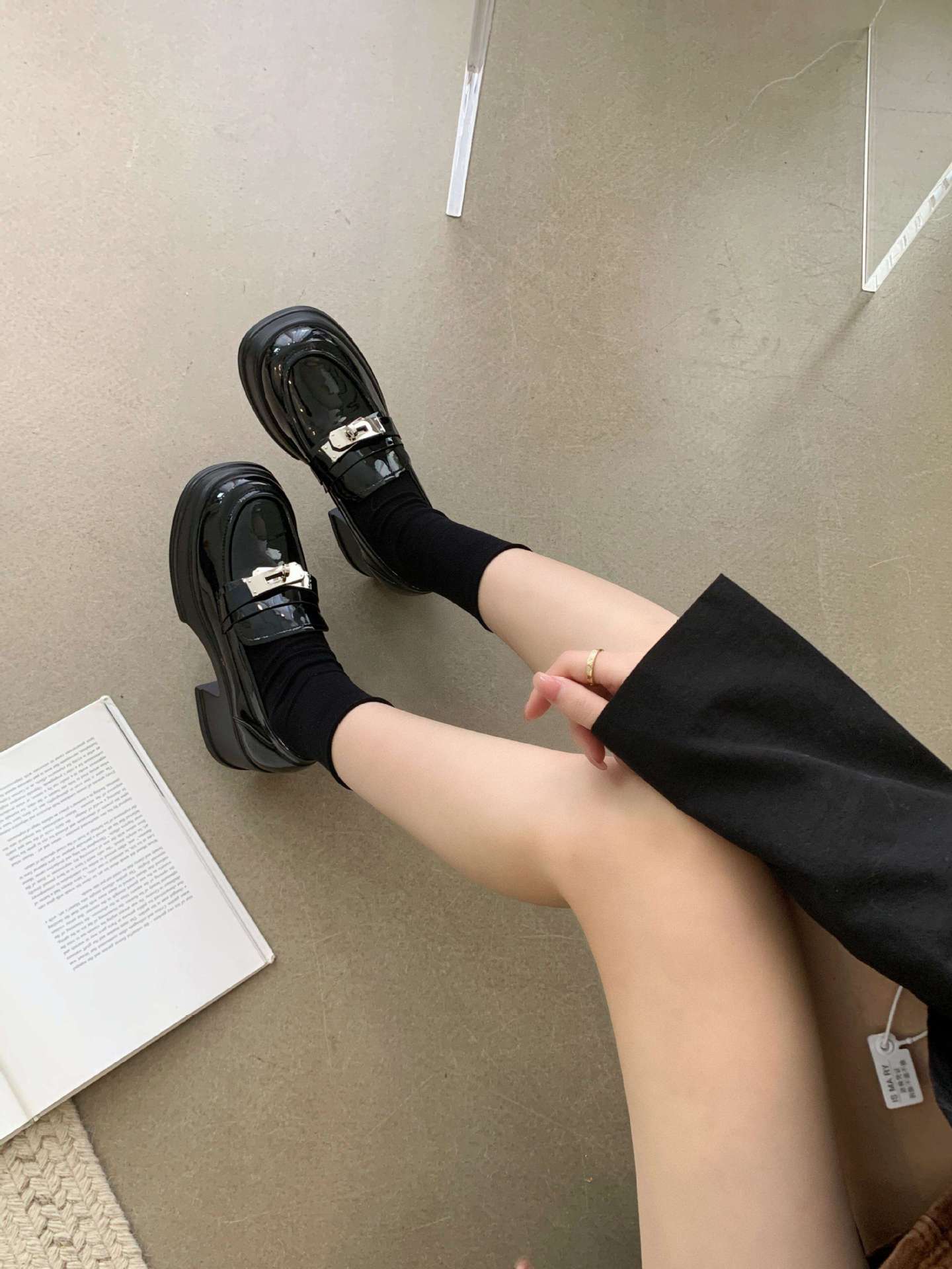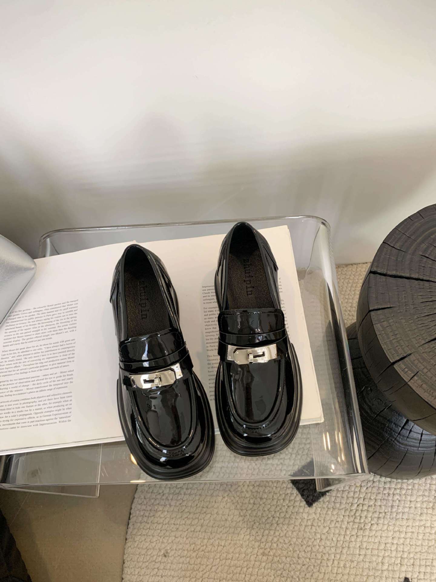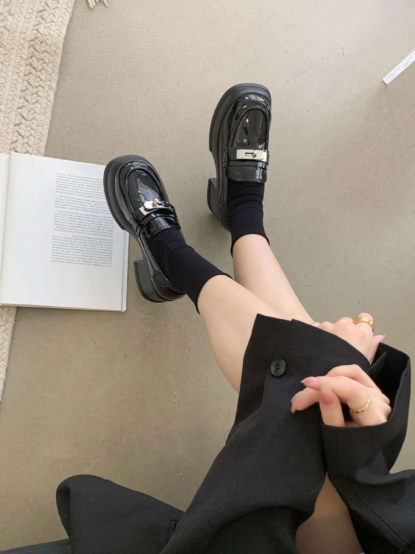 Chupin 머핀 로퍼 여성 2024 뉴 봄 영국 골드 버클 슬립 온 신발 블랙 두꺼운 밑창 가죽 신발