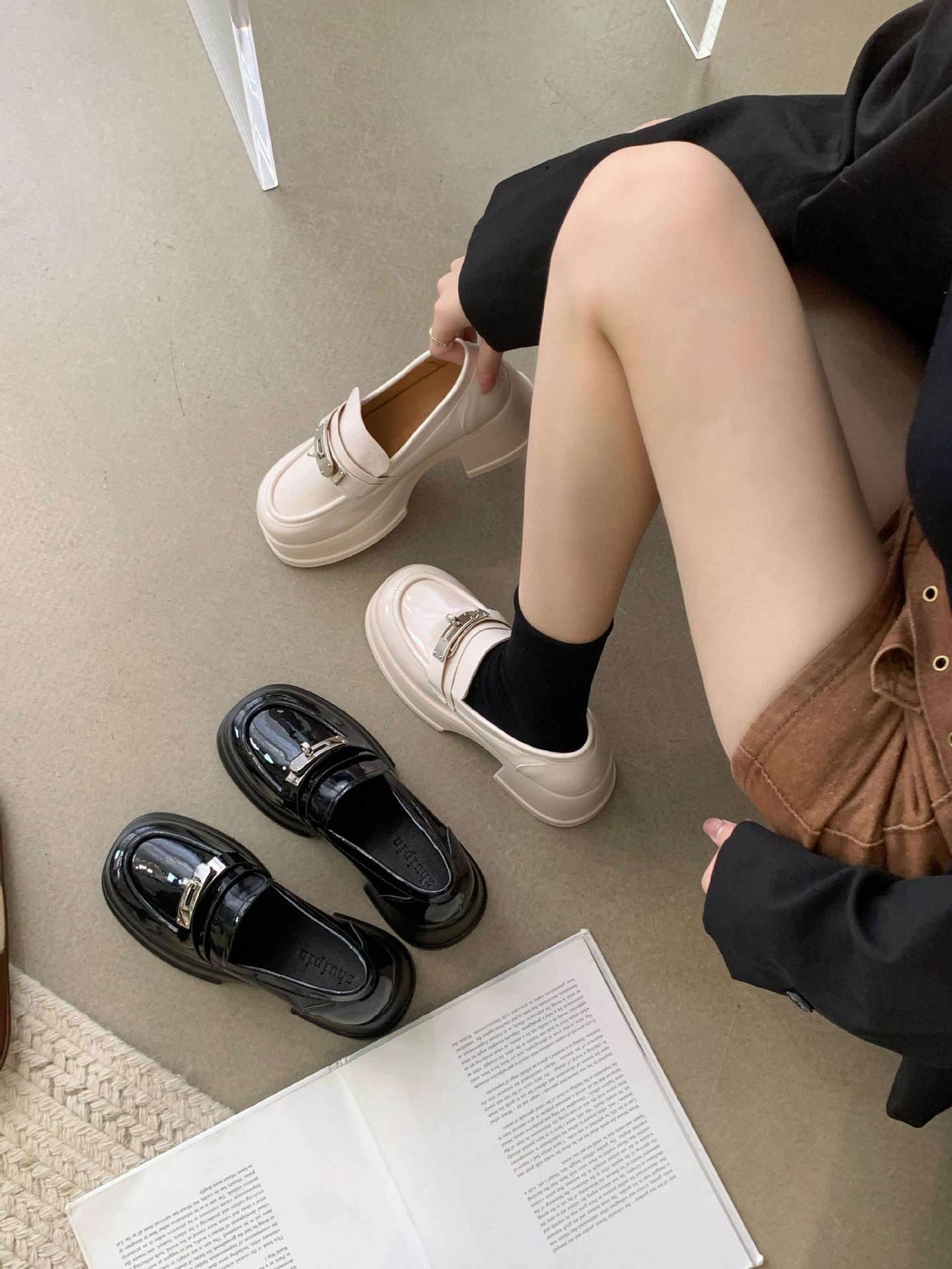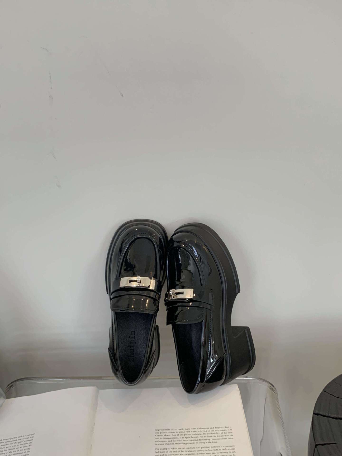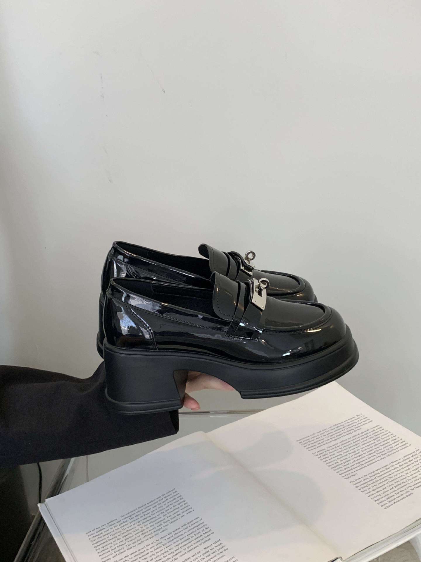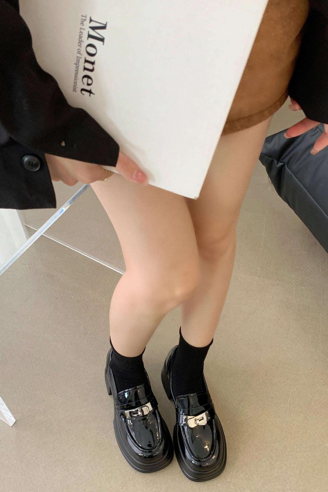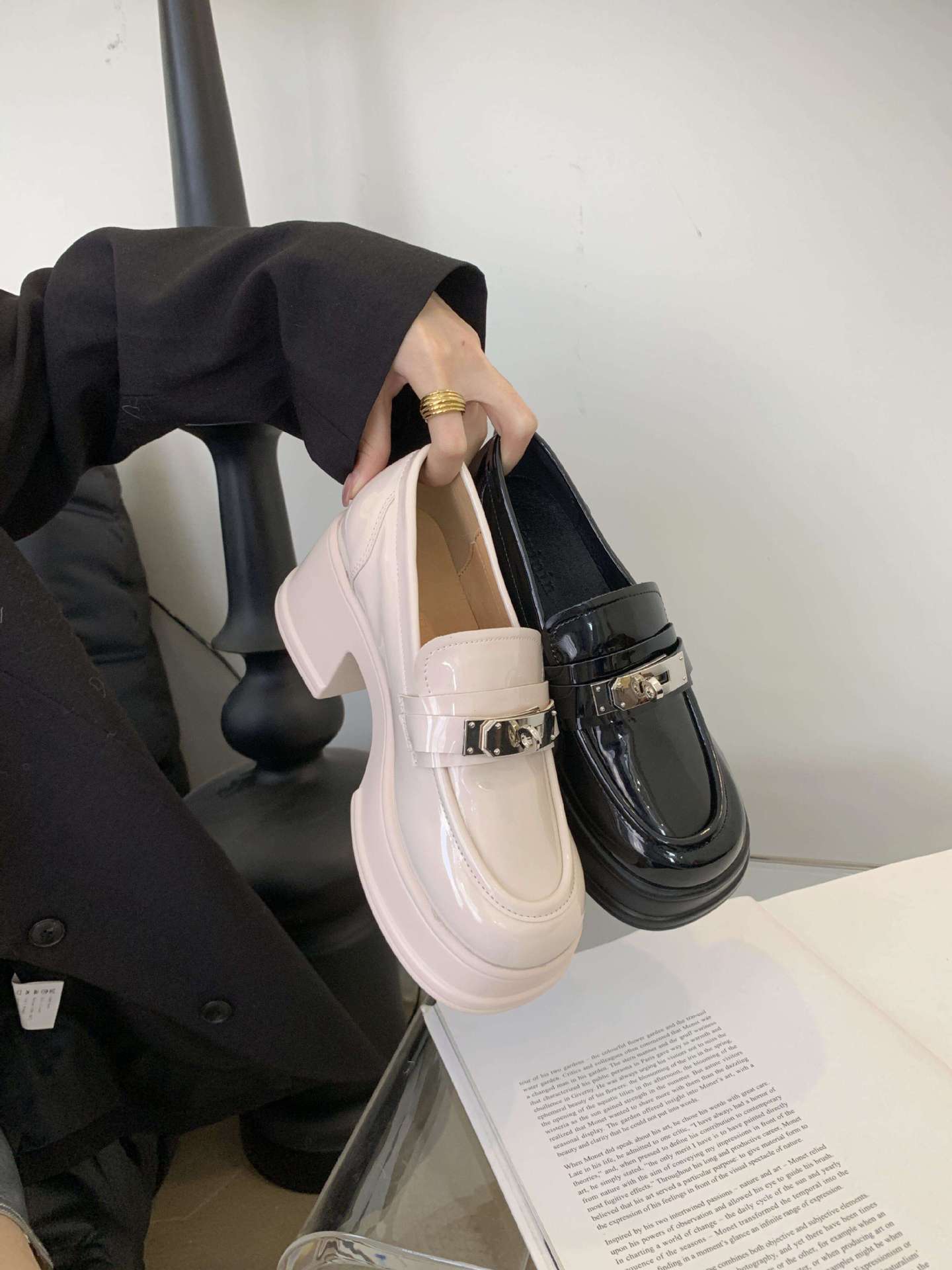 Chupin 머핀 로퍼 여성 2024 뉴 봄 영국 골드 버클 슬립 온 신발 블랙 두꺼운 밑창 가죽 신발