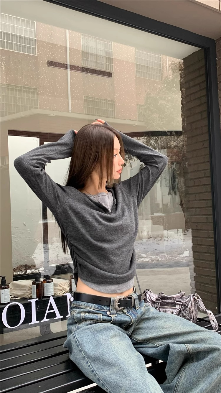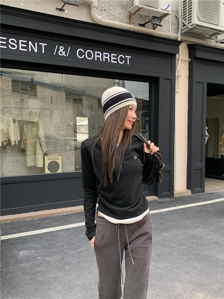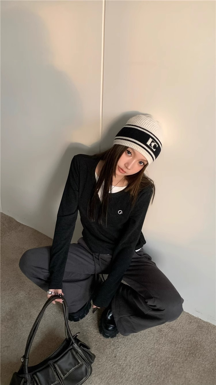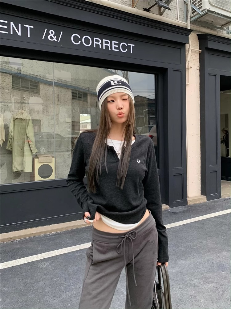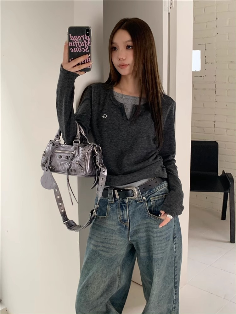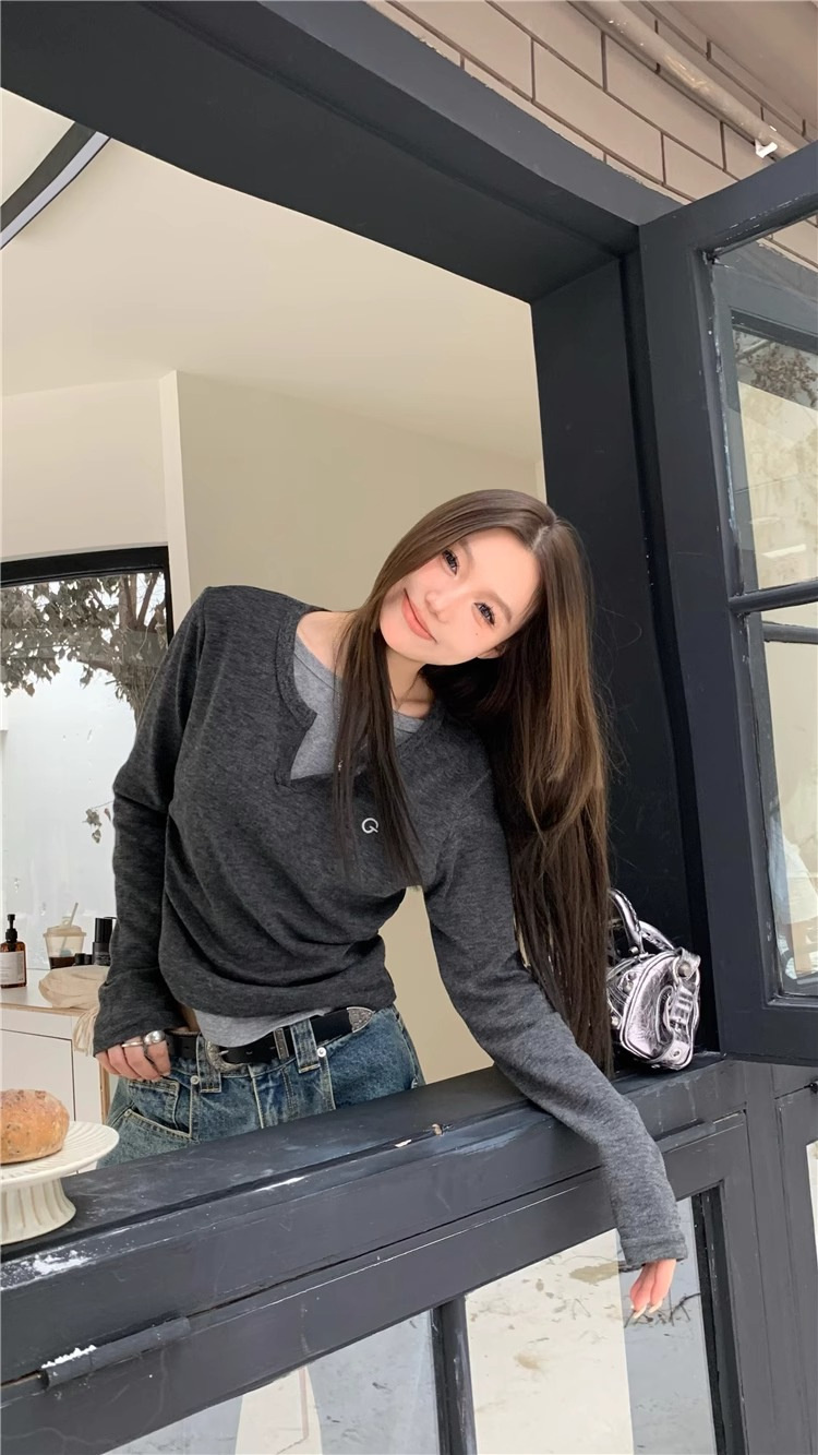여성 티셔츠 가짜 투피스 긴팔 티셔츠 가을과 겨울 내복 슬림 슬리밍 최상 미국 복고풍 바지 셔츠