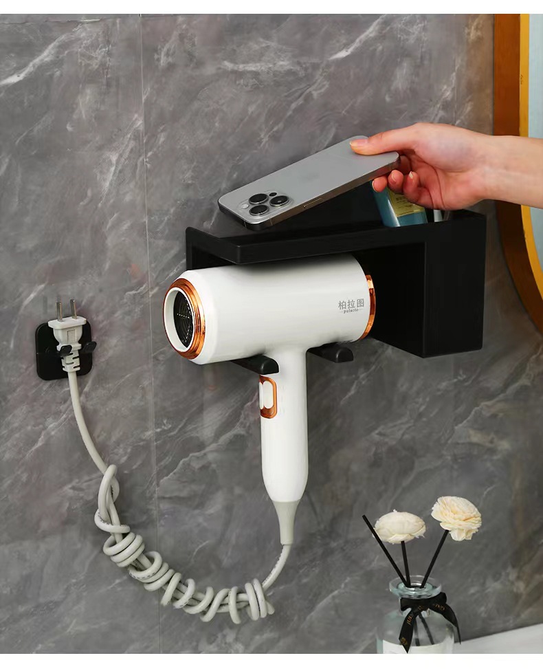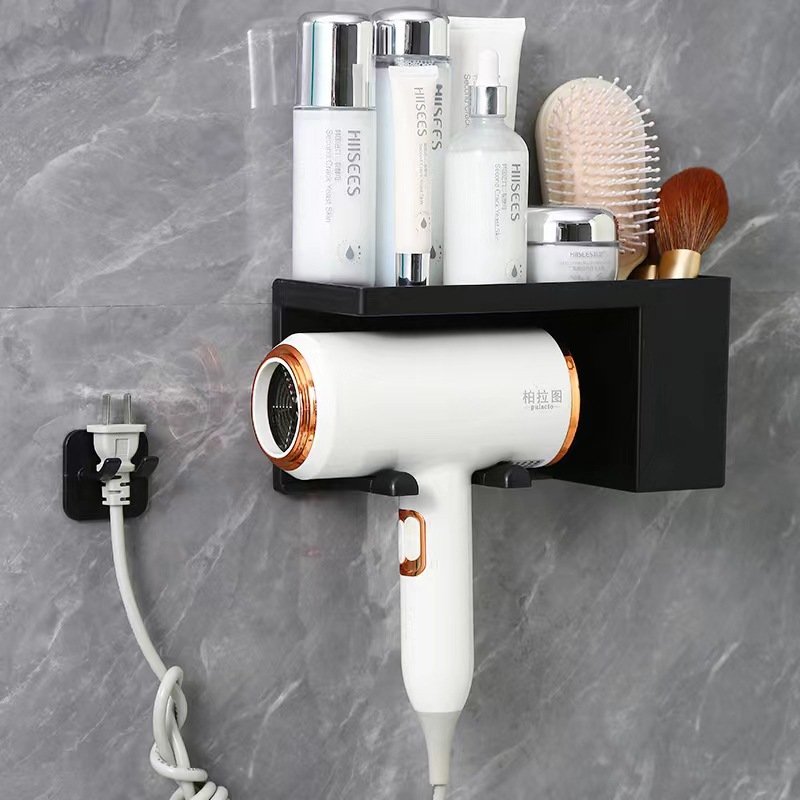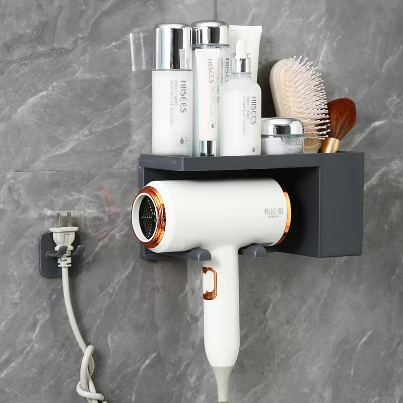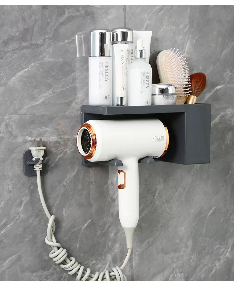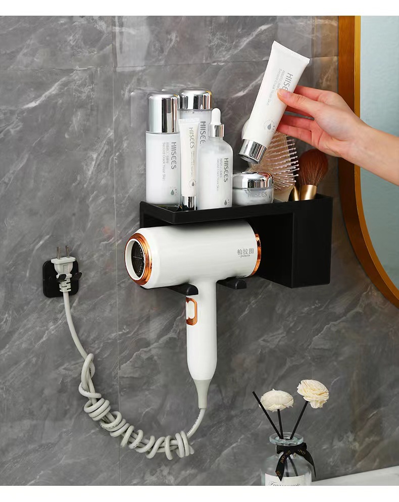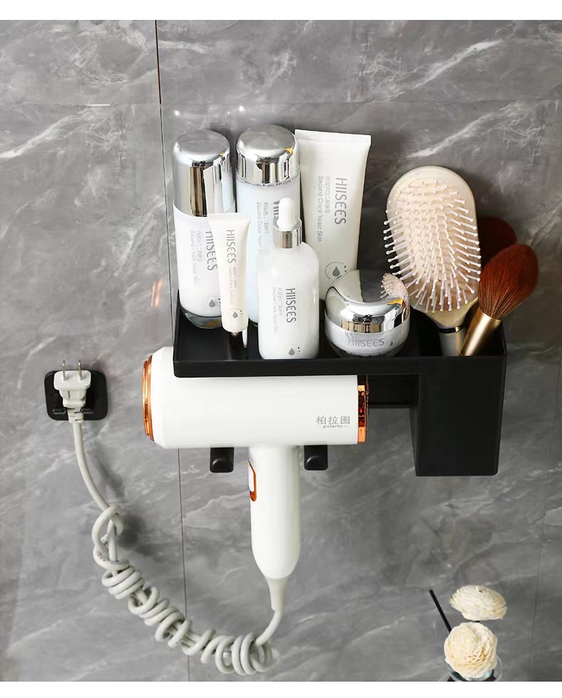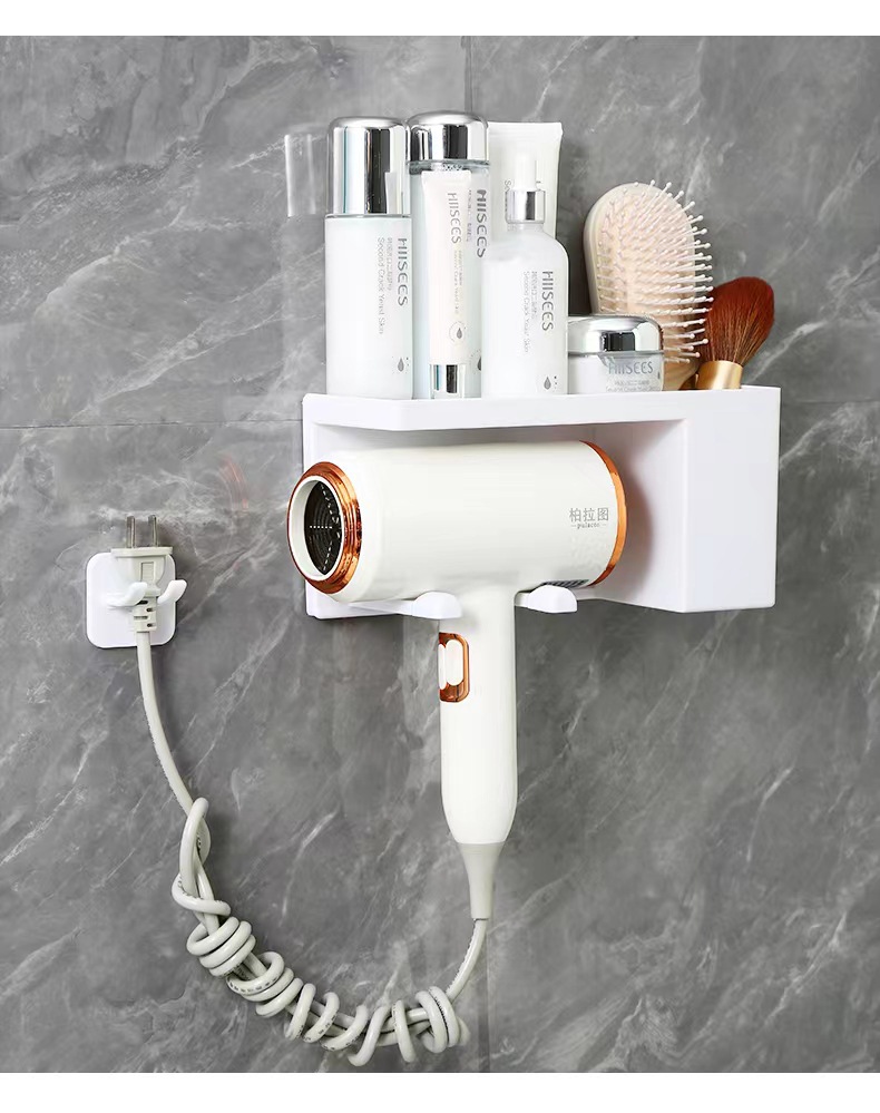 새로운 헤어드라이어 거치대, 플러그와 후크가 있는 이중 레이어, 무타공 욕실 헤어드라이어 보관대