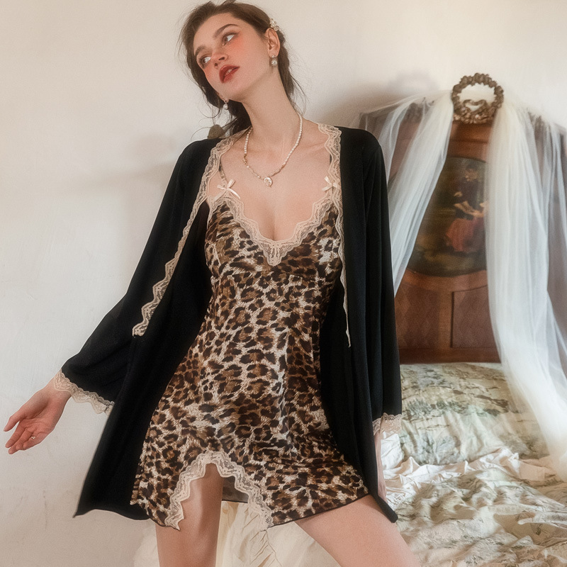 레오파드 무늬 스타일 분리 가능한 가슴 패드 우유 실크 탄성 스플릿 스트랩 나이트 드레스 여성의 섹시한 잠옷 섹시한 란제리 9648