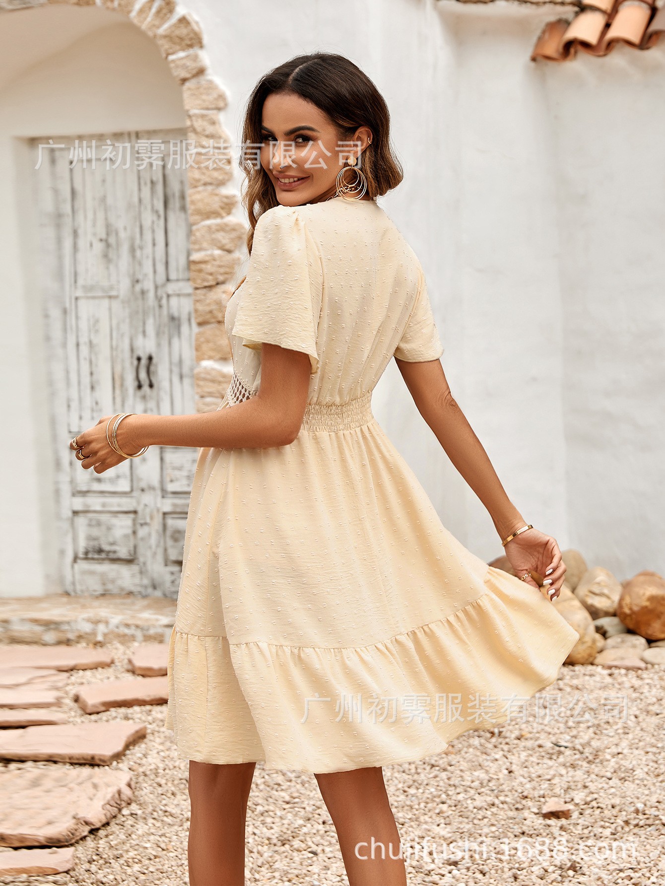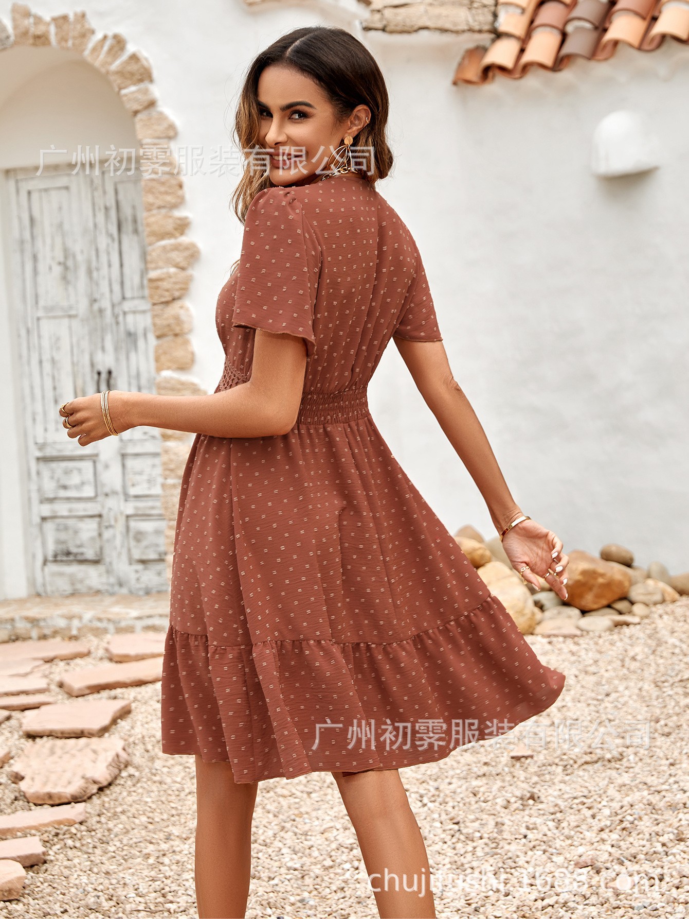 2025 유럽과 미국의 국경 여성 해변 여름 새로운 신선한 v 넥 솔리드 컬러 자카드 연꽃 잎 슬리브 허리 드레스