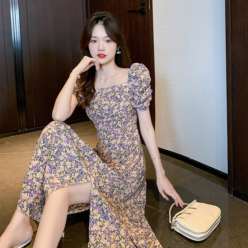 프랑스 스타일 스퀘어 칼라 퍼프 슬리브 플로랄 중간 길이 원피스 여성의 2024 여름 최신 타이트 허리 스플릿 A-라인 원피스 트렌디