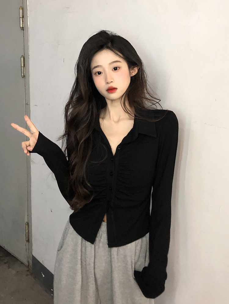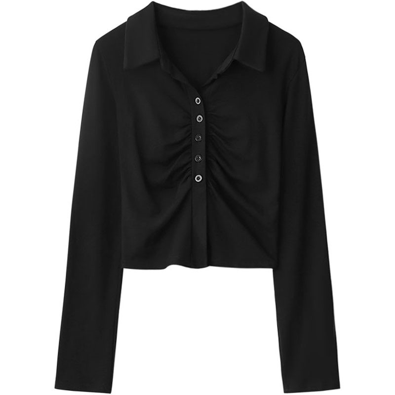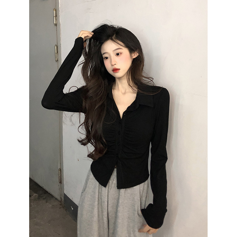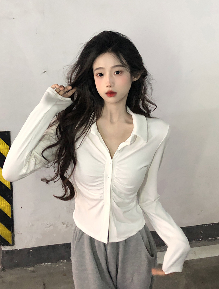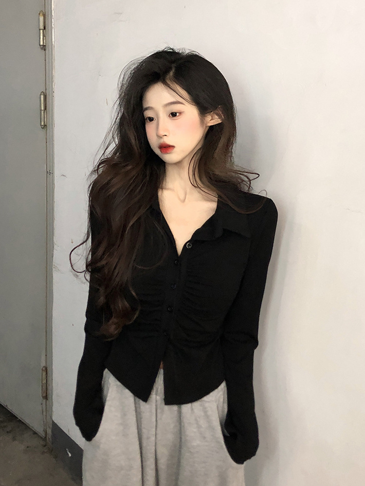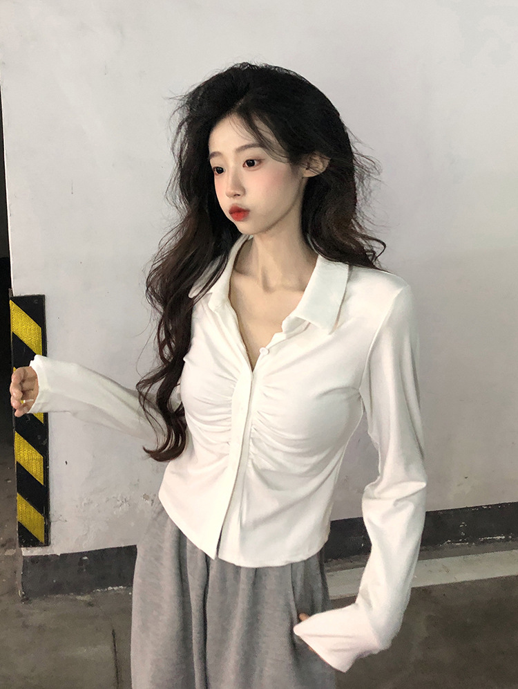 2024 봄 새로운 여성 의류 디자인 주름 긴 소매 티셔츠 슬림 슬리밍 옷깃 순수한 욕망 스타일 바닥