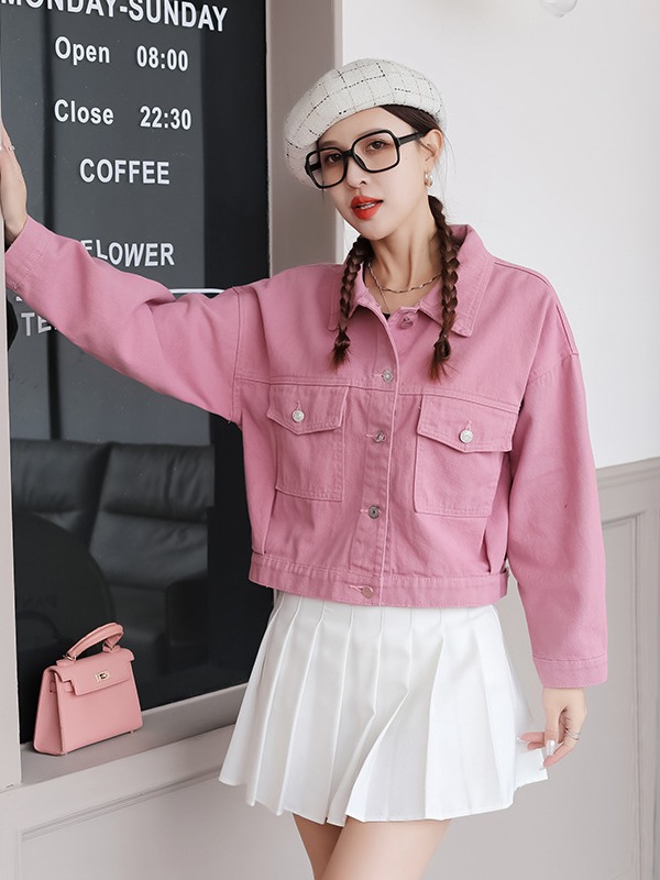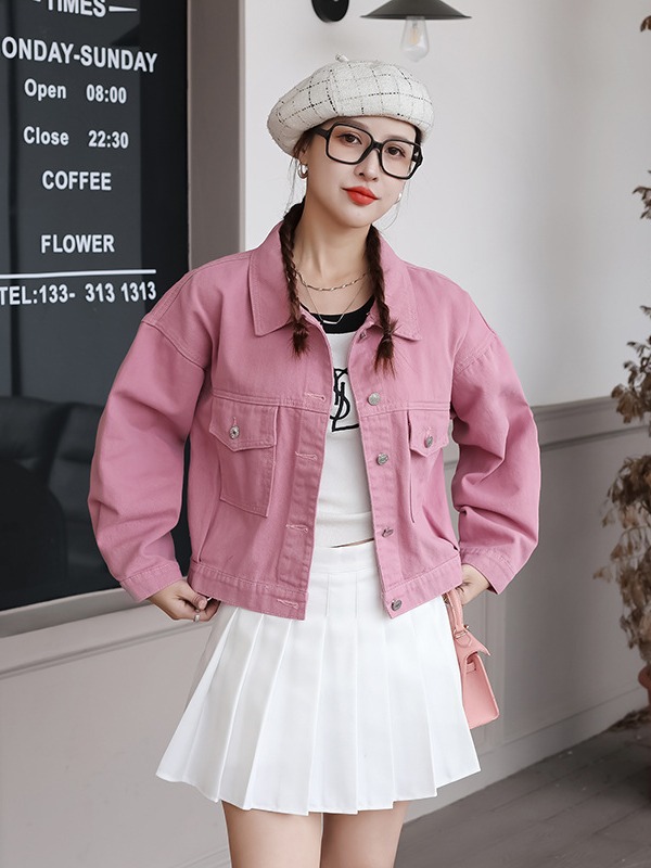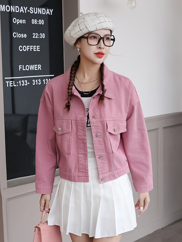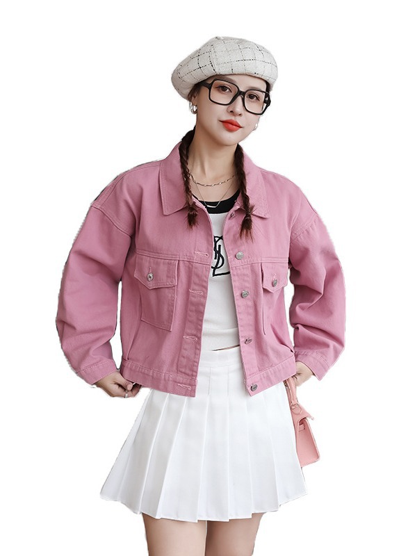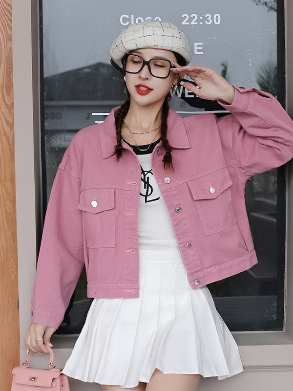 2024 봄과 가을 새로운 작은 작업복 짧은 재킷 탑 여성을위한 로터스 핑크 달콤한 올 매치 데님 코트