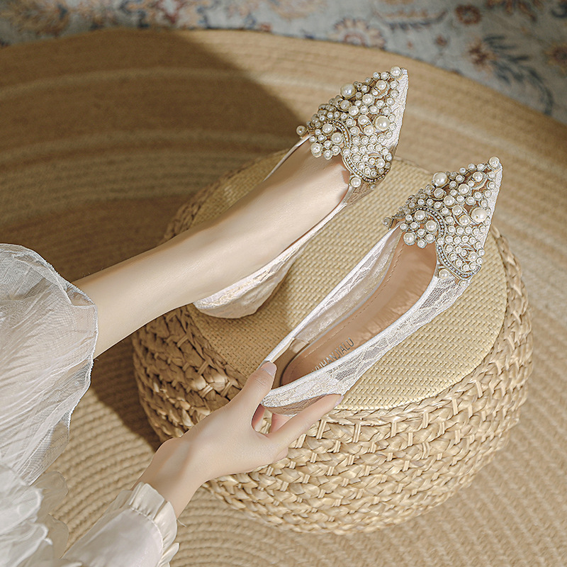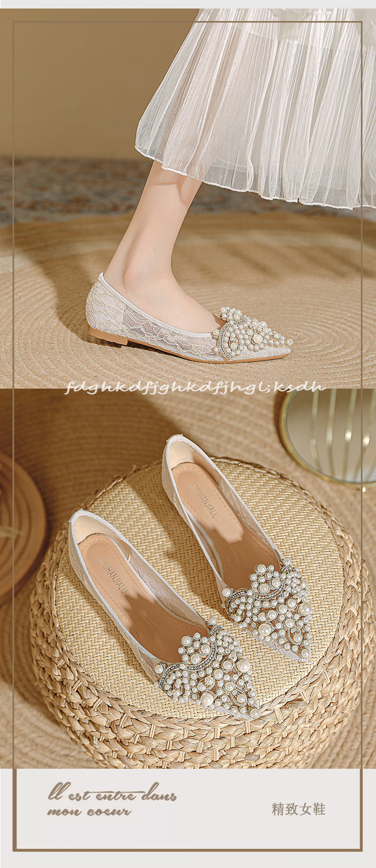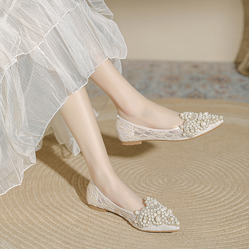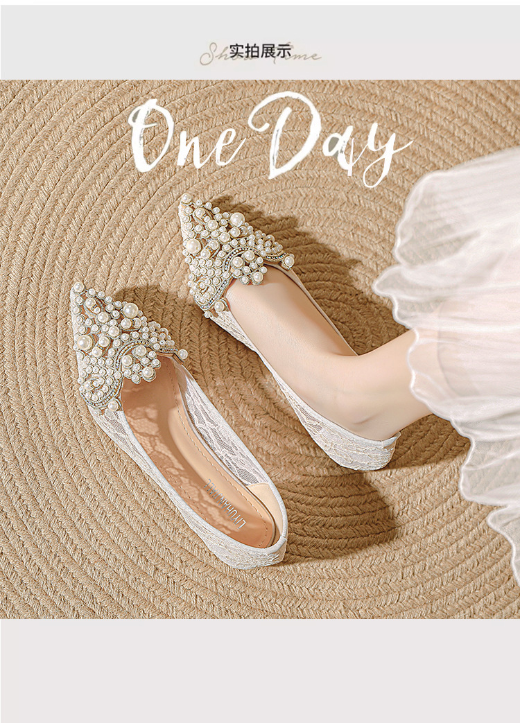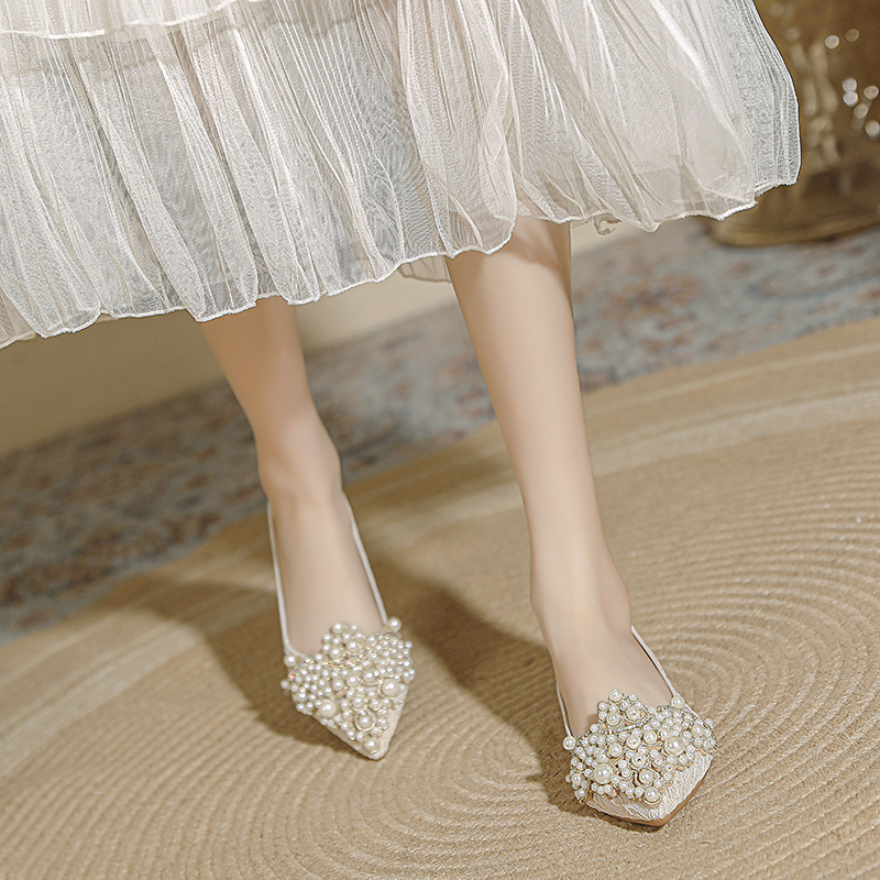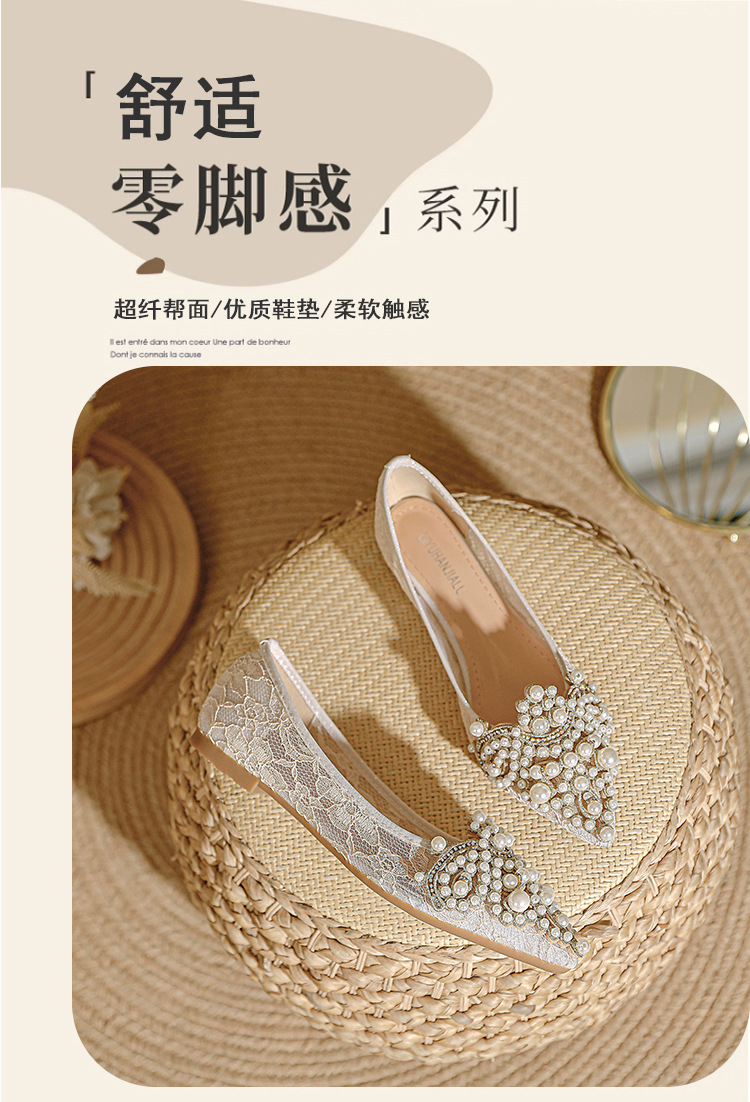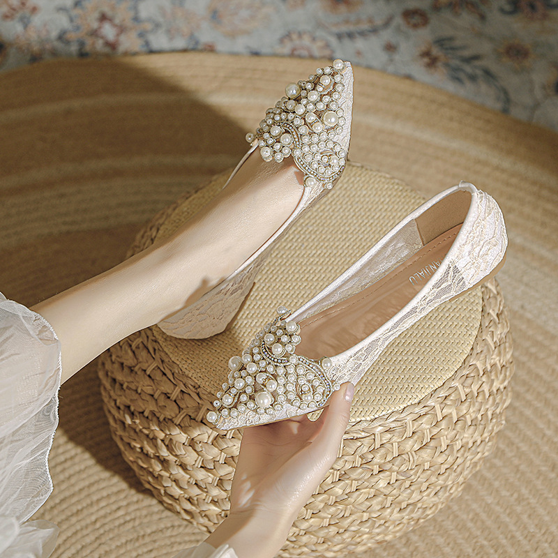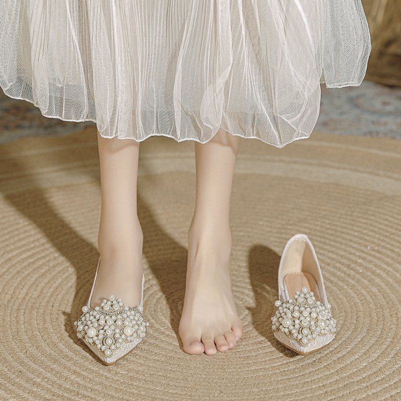 플랫 웨딩 슈즈 신부 신발 여성용 2025 신상 소프트 솔 뾰족코 얕은 굽 요정 스타일 부드러운 워터 드라이 핑크 슈즈 신부 들러리 신발