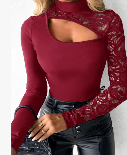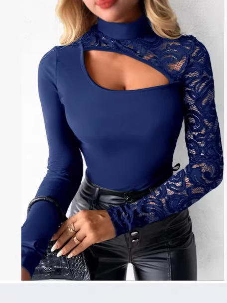 2024 봄과 가을 아마존 패션 어깨 레이스 불규칙한 긴 소매 티셔츠 높은 칼라 여성용 섹시한 티셔츠