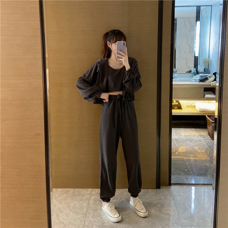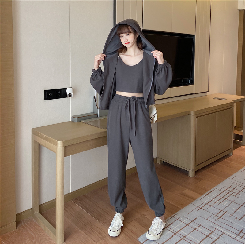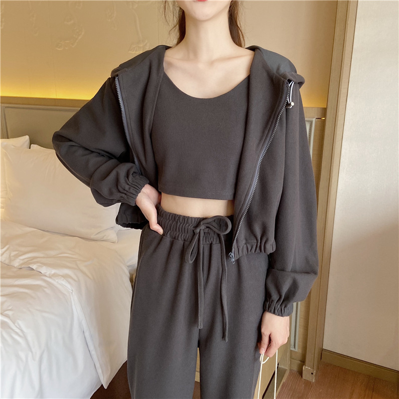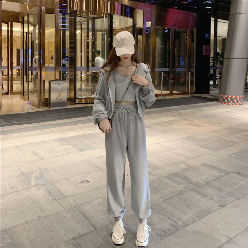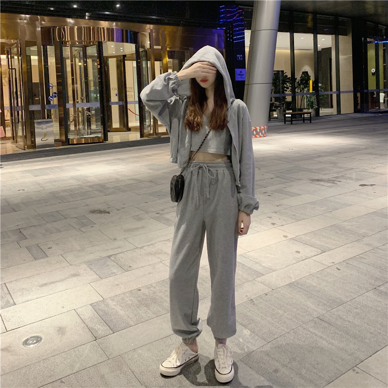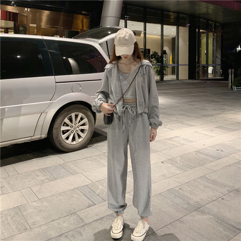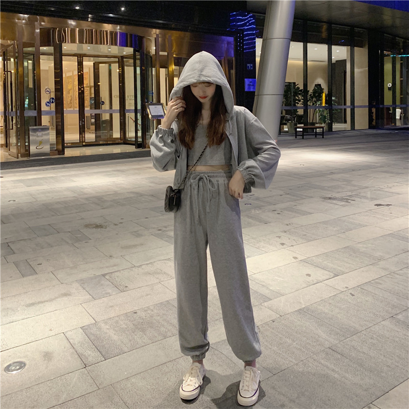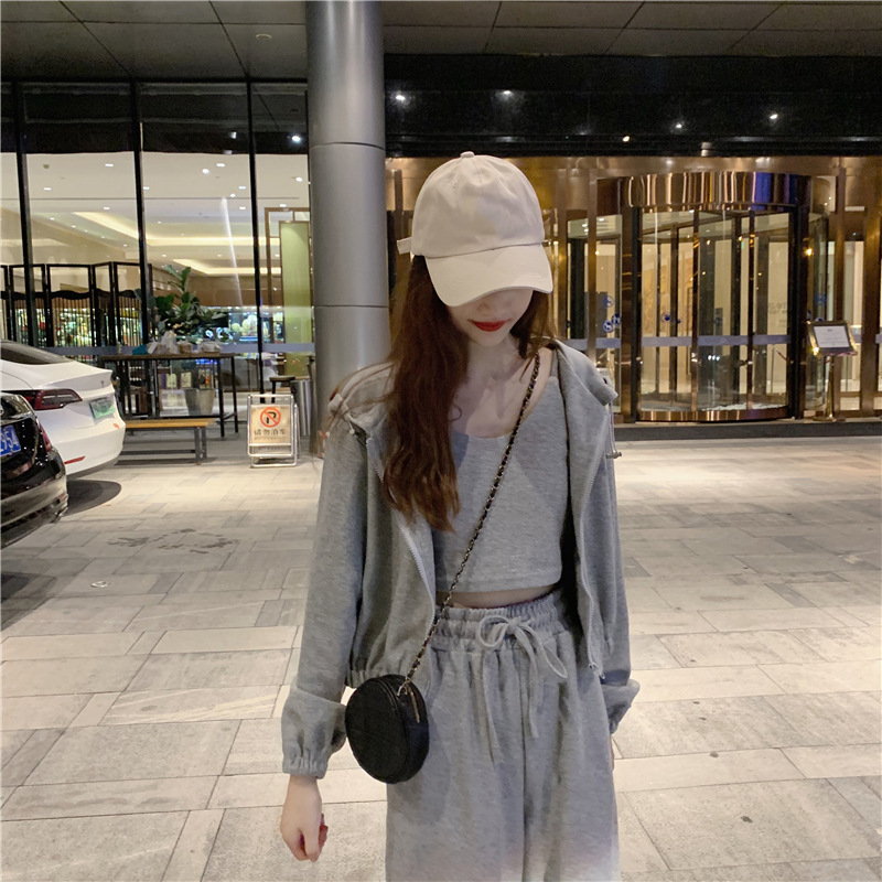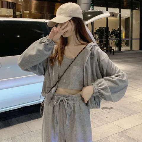 국경 캐주얼 가을 새로운 3 피스 느슨한 얇은 후드 스웨터 재킷 패션 스포츠웨어 세트 여성 패션