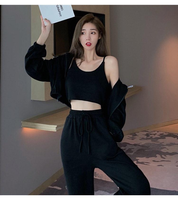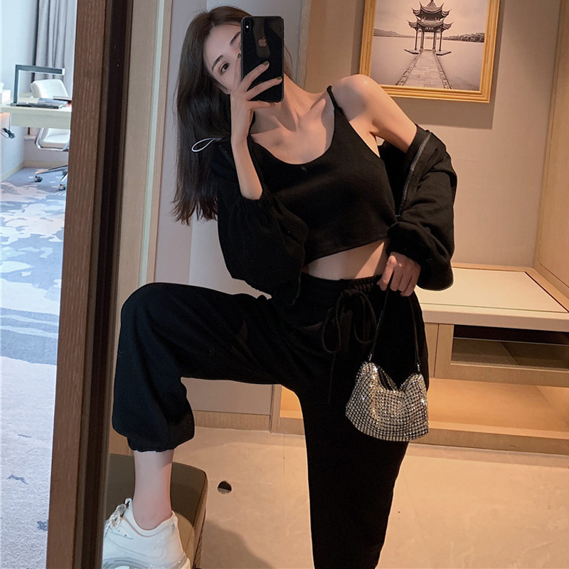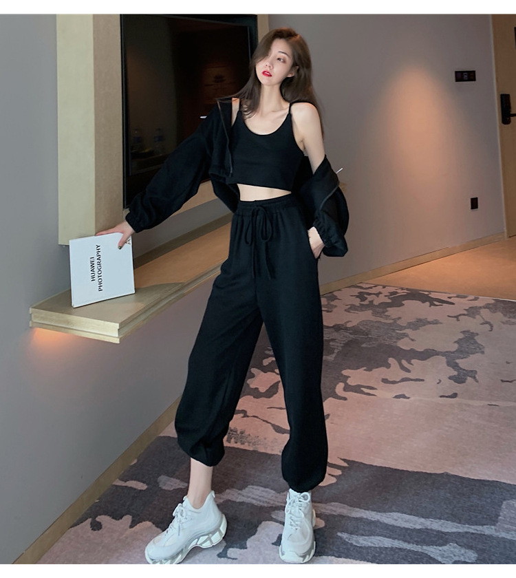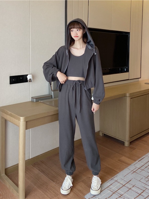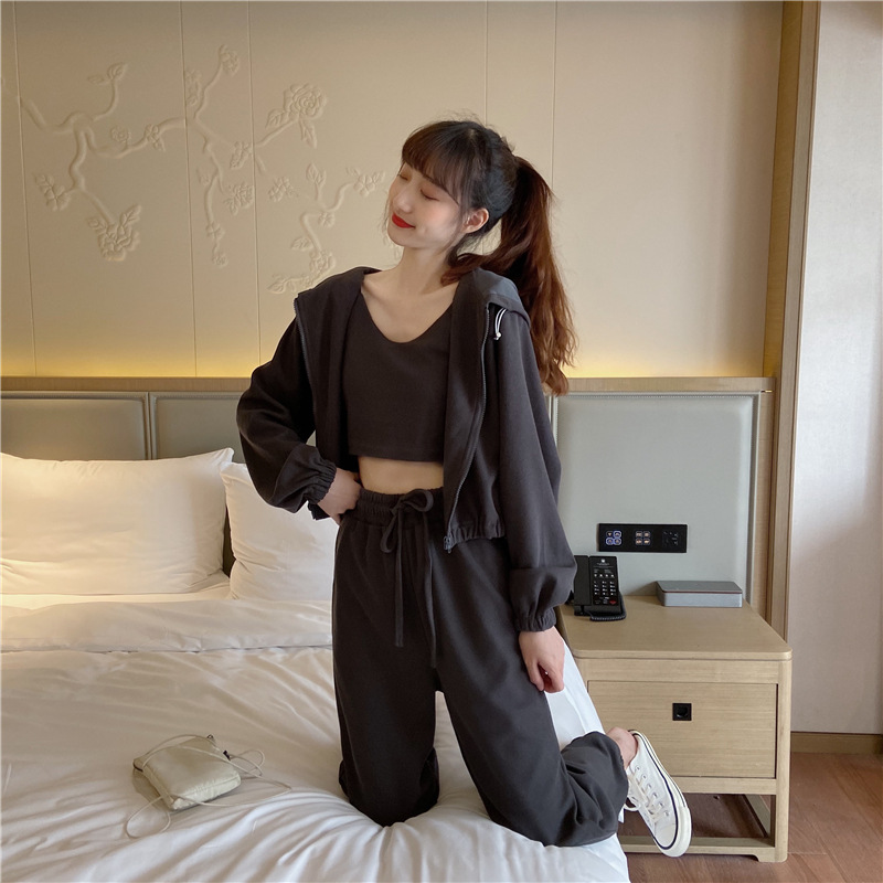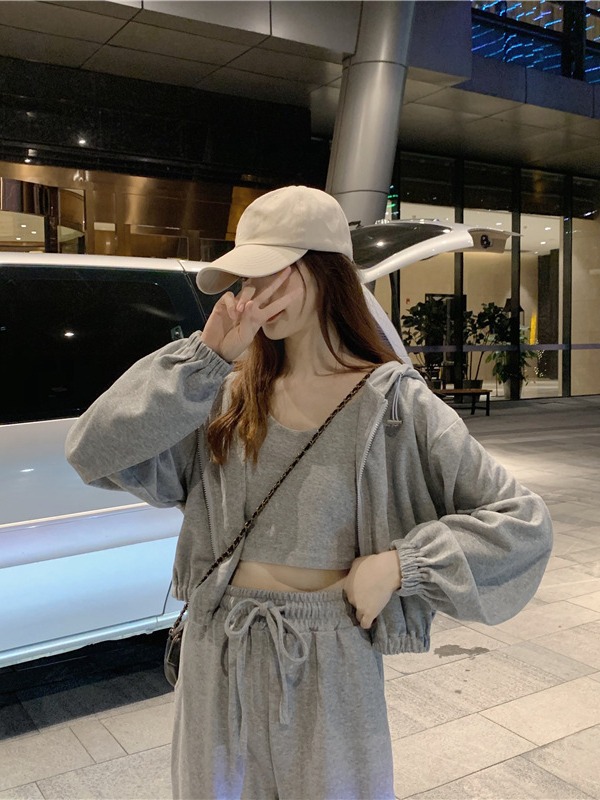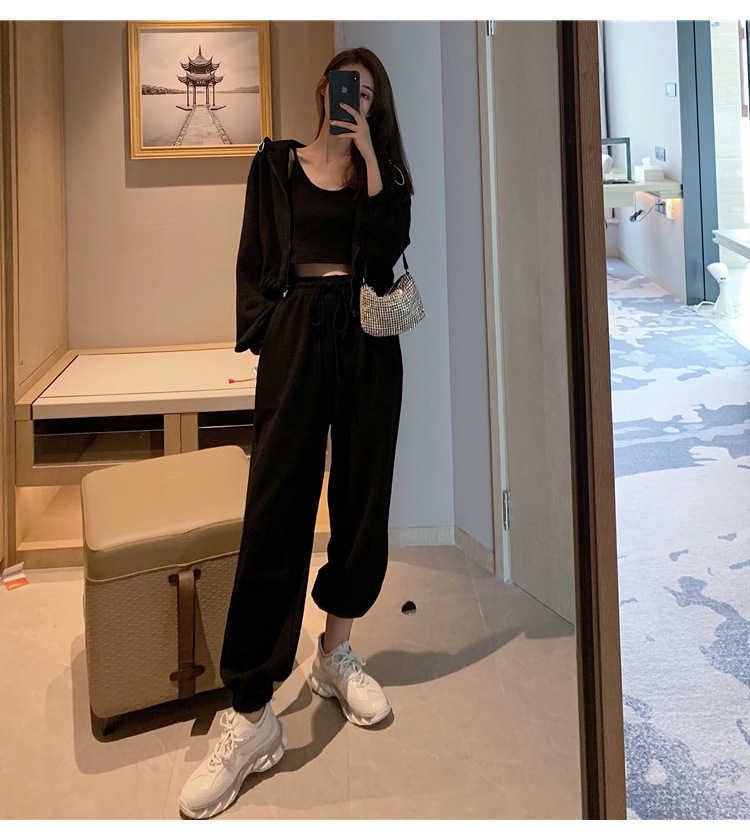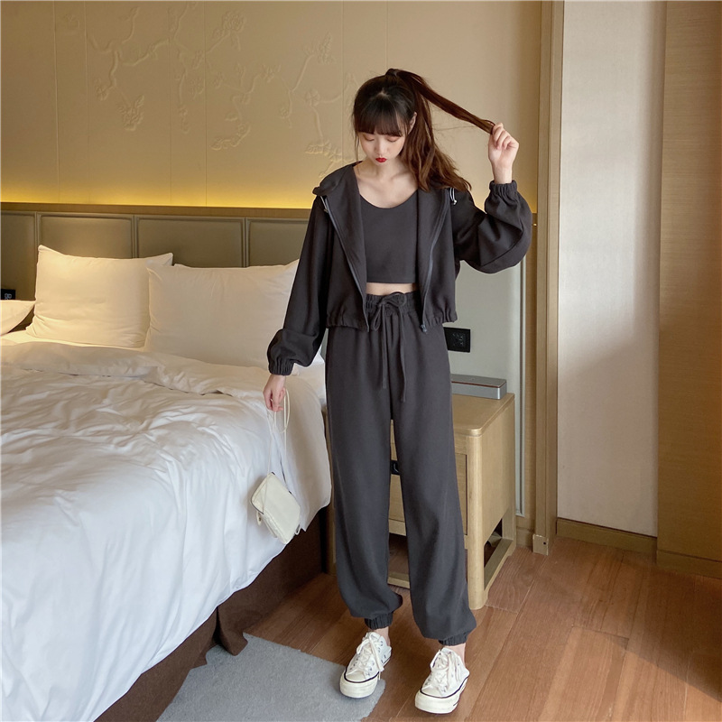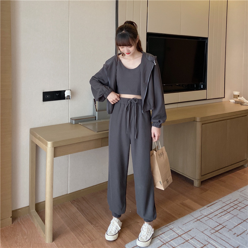 국경 캐주얼 가을 새로운 3 피스 느슨한 얇은 후드 스웨터 재킷 패션 스포츠웨어 세트 여성 패션