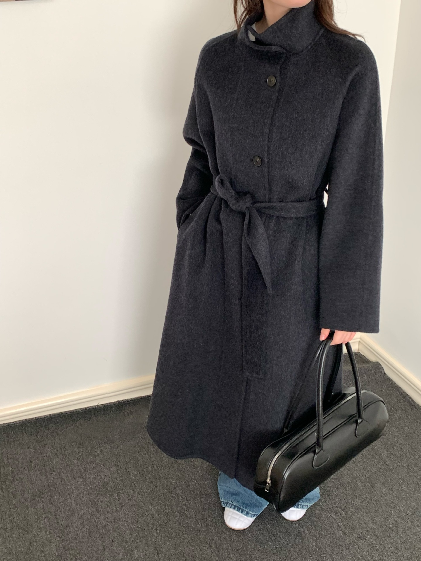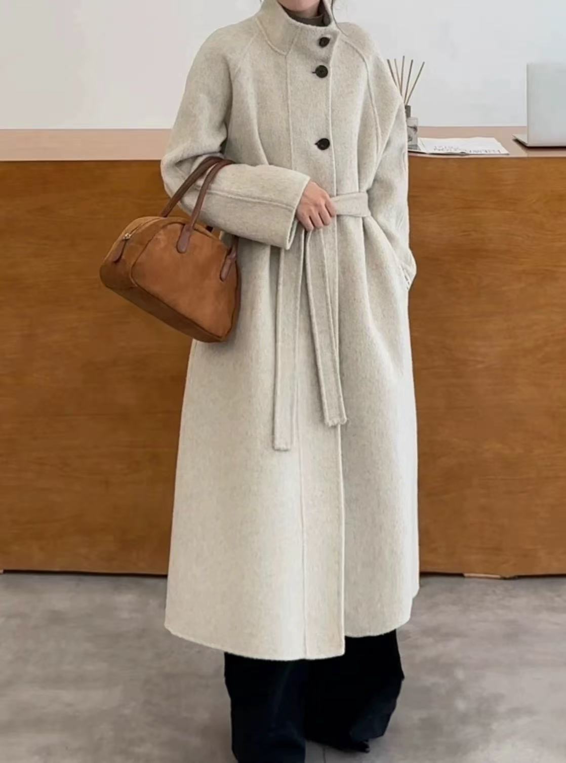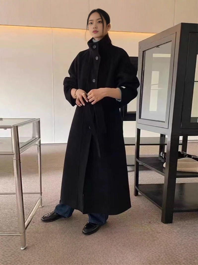 가을 겨울 한국 스타일 스탠드 칼라 끈이 달린 루즈핏 양면 울 코트 여성용 롱 스타일 고급스러운 여유로운 분위기의 여성용 코트