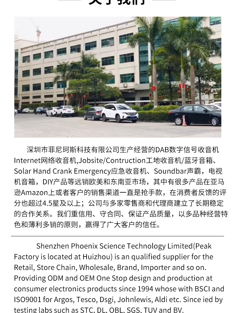 菲尼珂斯科技着重于收音机音箱产品的研发生产! 有超过20年的出口欧美市场经验,产品满足,符合当地国家的出口要求,对欧美,澳洲,东南亚等市场的法律法规了解。专门出口欧美品质,稳定的生产,质量有保障!支持定制开发!交期短,品质好!量大可议价!欢迎咨询!