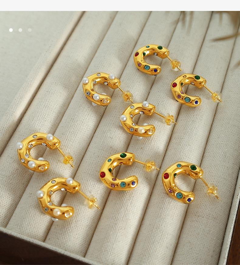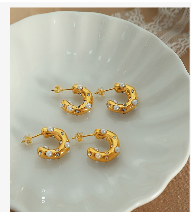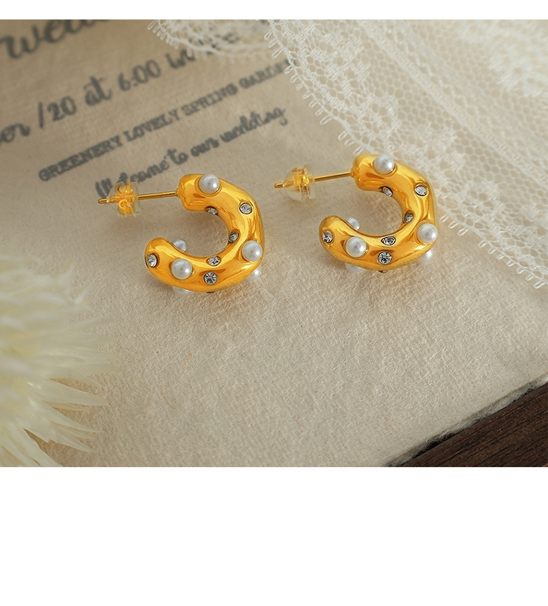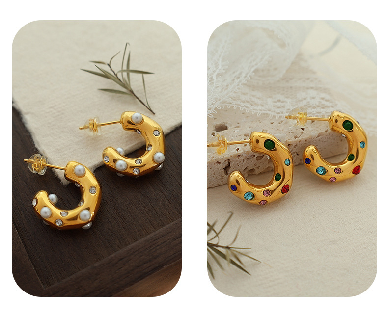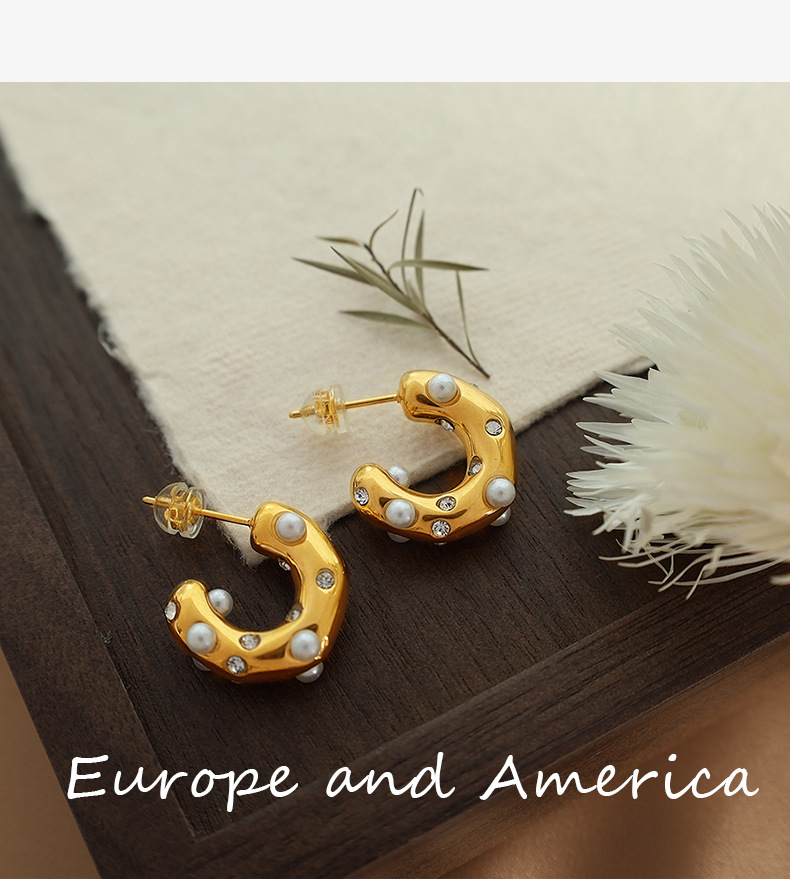 유럽과 미국의 국경 티타늄 스틸 C 자형 중공업 상감 모조 다이아몬드 진주 불규칙한 귀걸이 예술적 복고풍 스타일