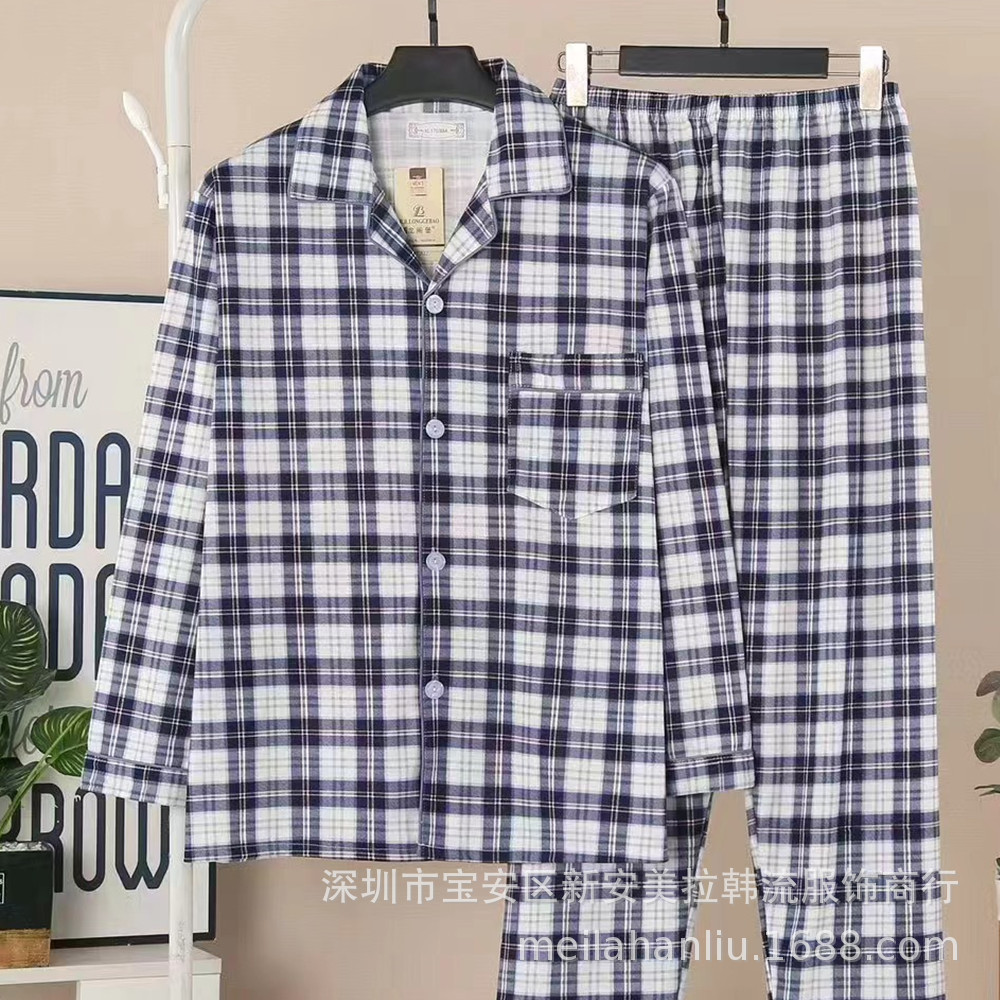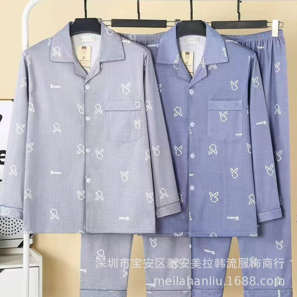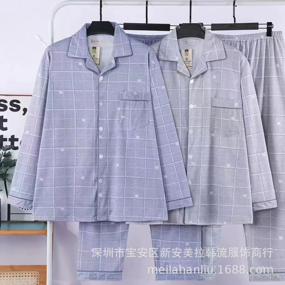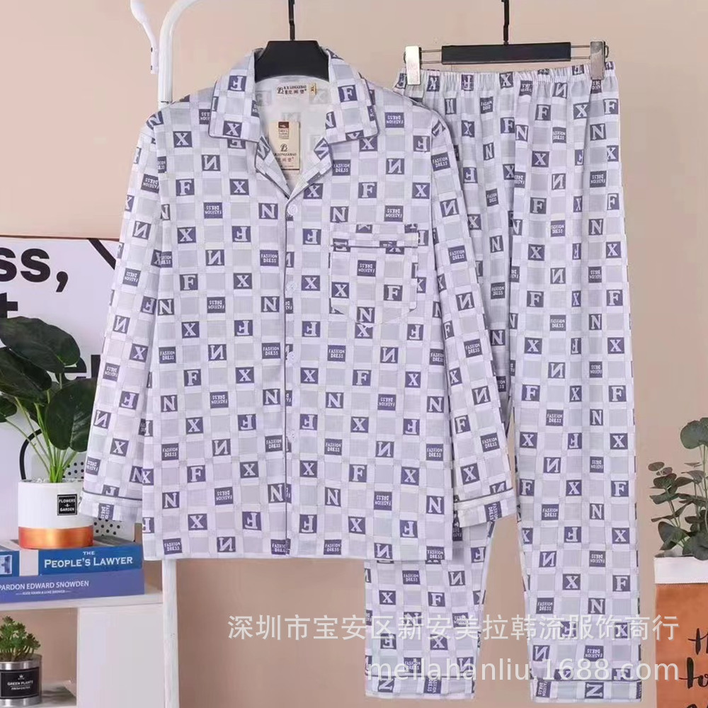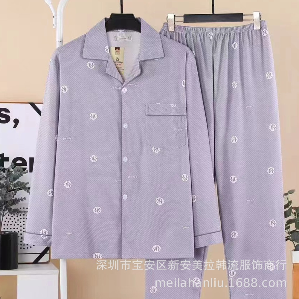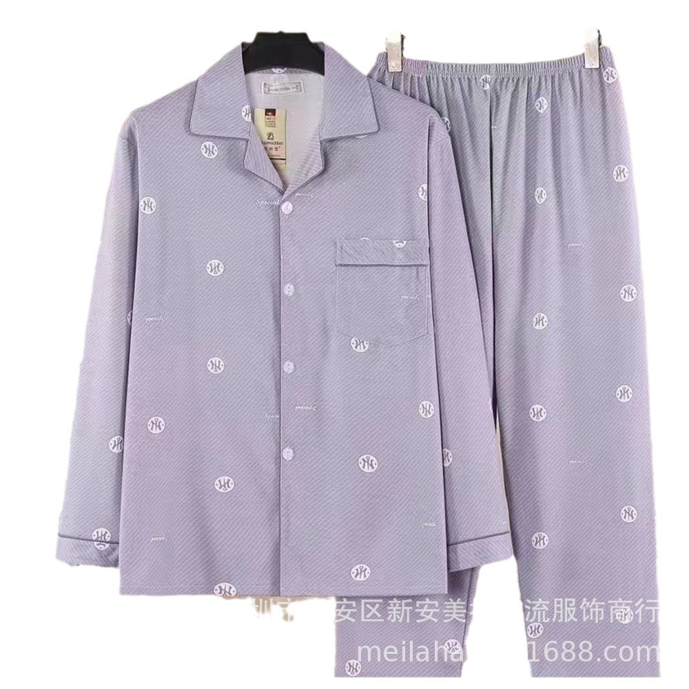 Longjibao 봄과 가을 남자 긴팔 잠옷 카디건 V넥 양면 니트 코튼 캐주얼 플러스 사이즈 홈웨어 세트