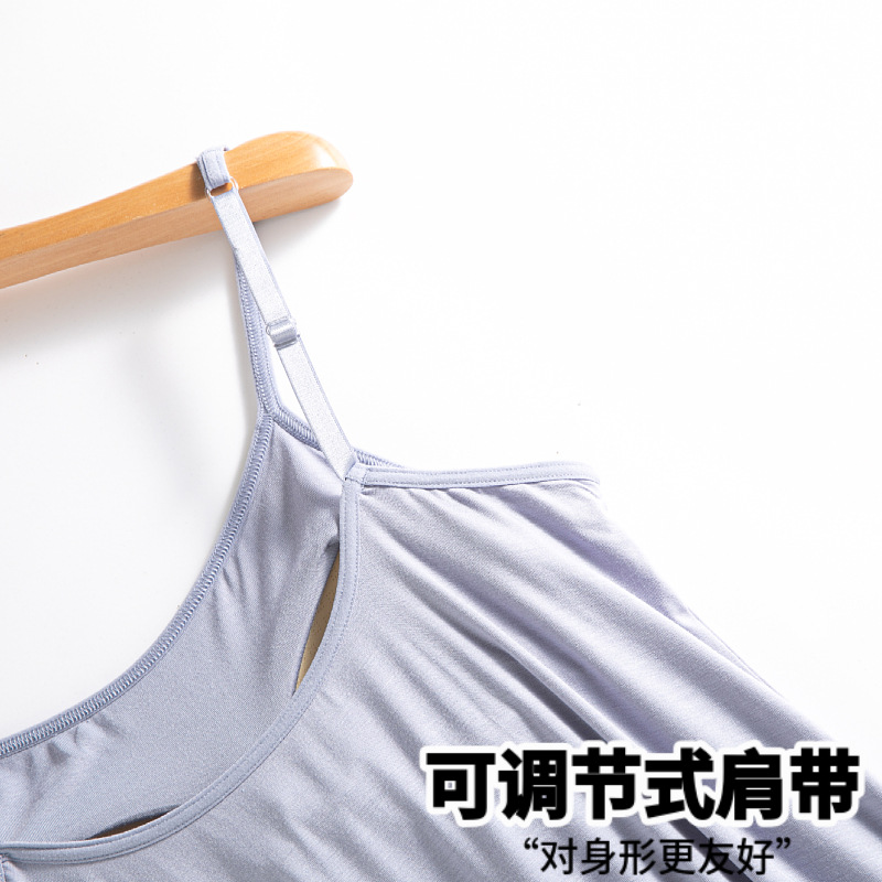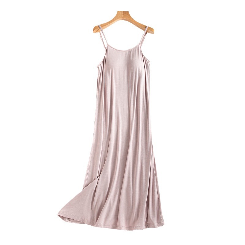 여성용 여름 모달 원피스 고정 컵 무릎 위 캐주얼 바닥 홈 서스펜더 잠옷(가슴 패드 포함) 외부 착용 가능