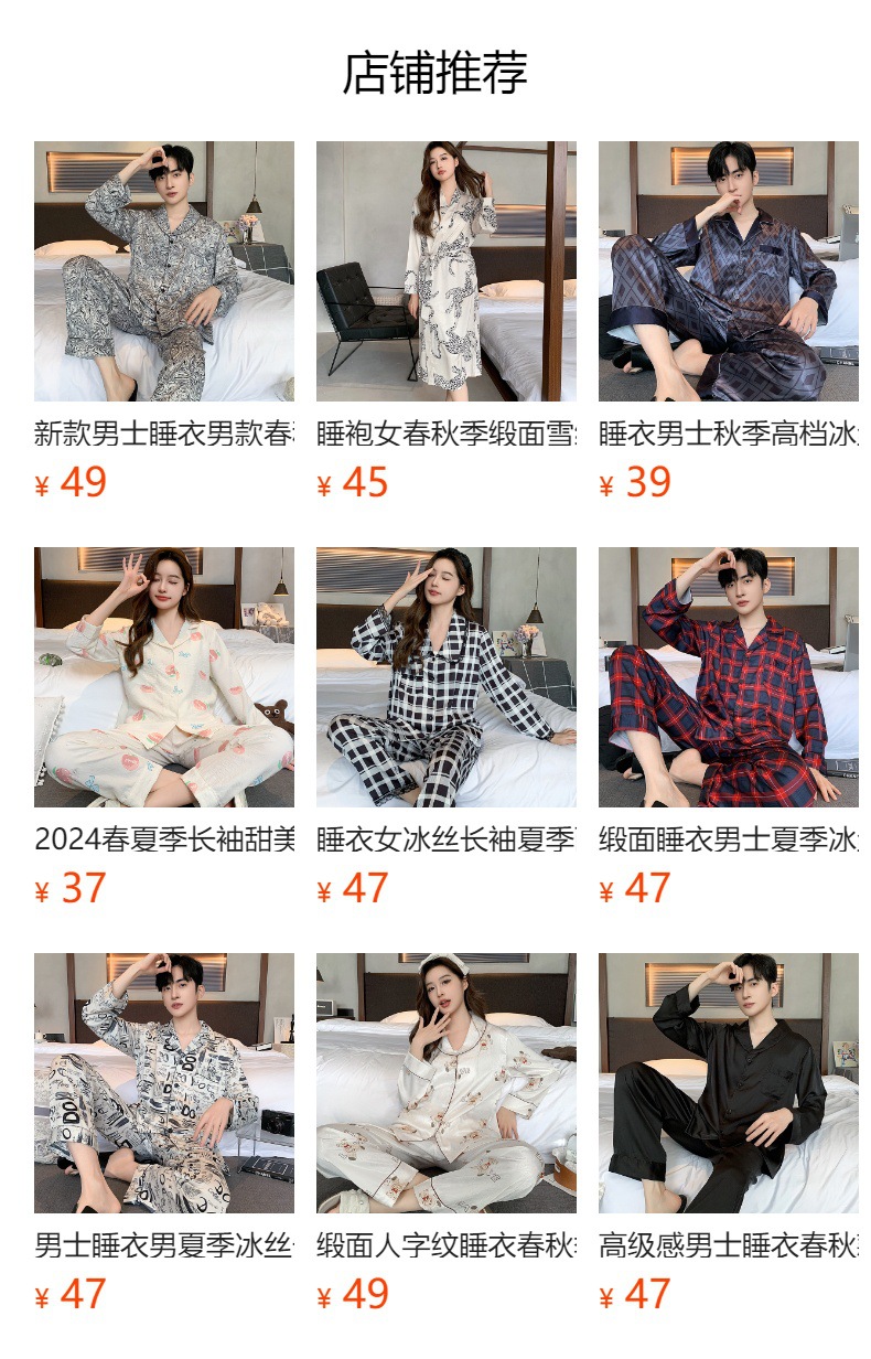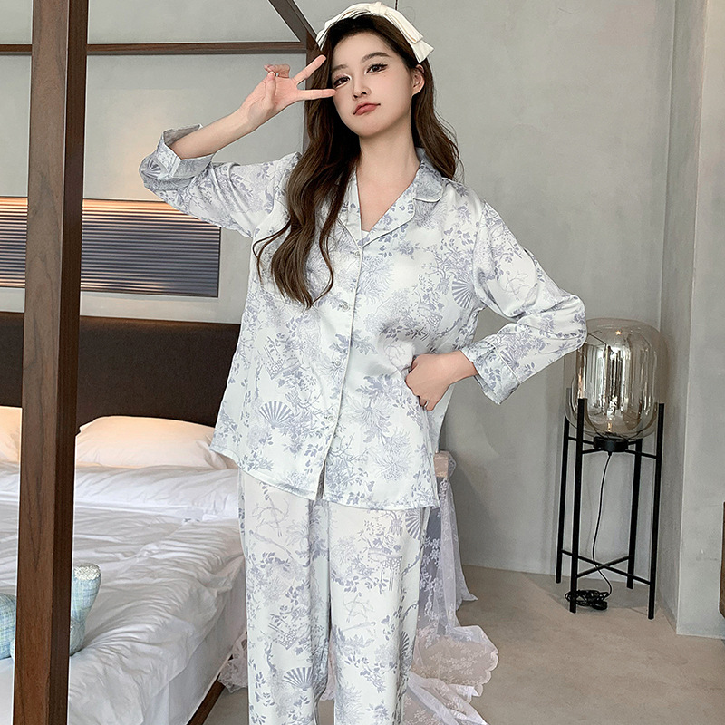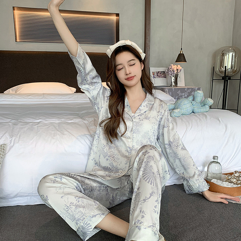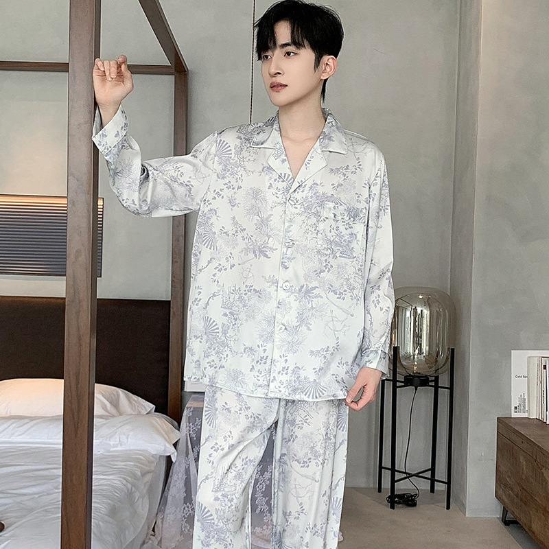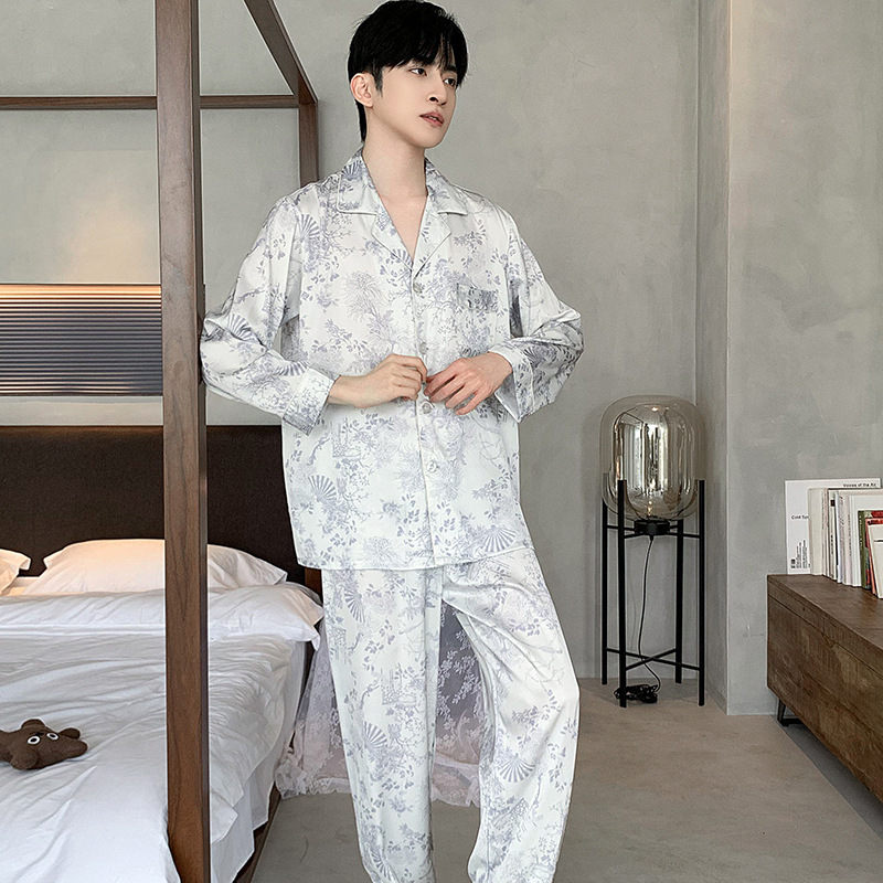 클래식 프린트 커플 잠옷 봄과 가을 아이스 실크 긴 소매 세트 실크 홈 웨어 남성 및 여성 고급 플러스 사이즈