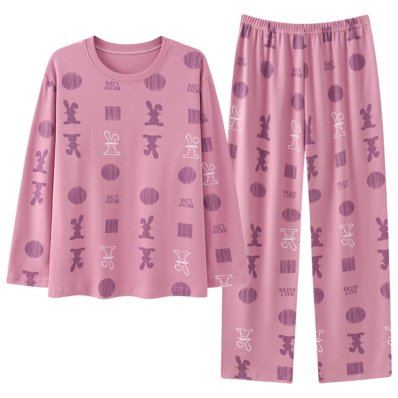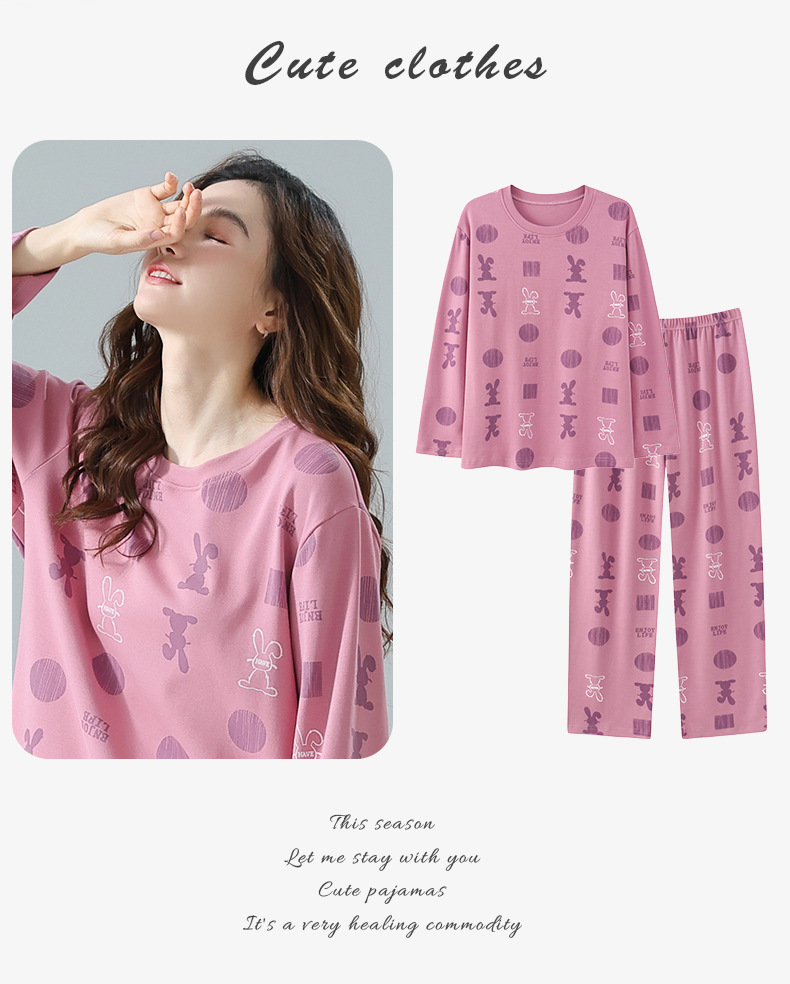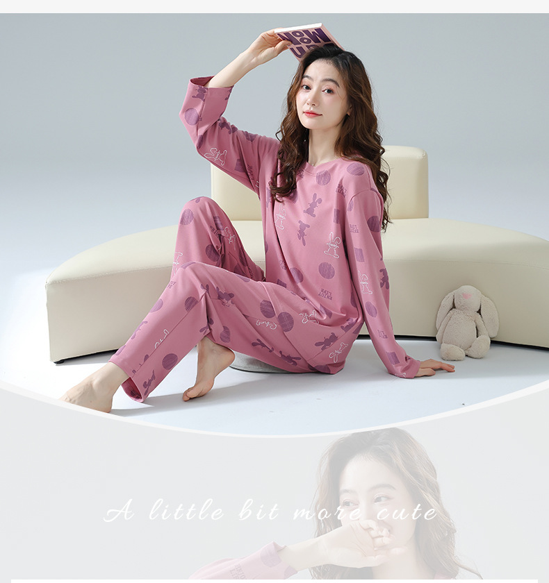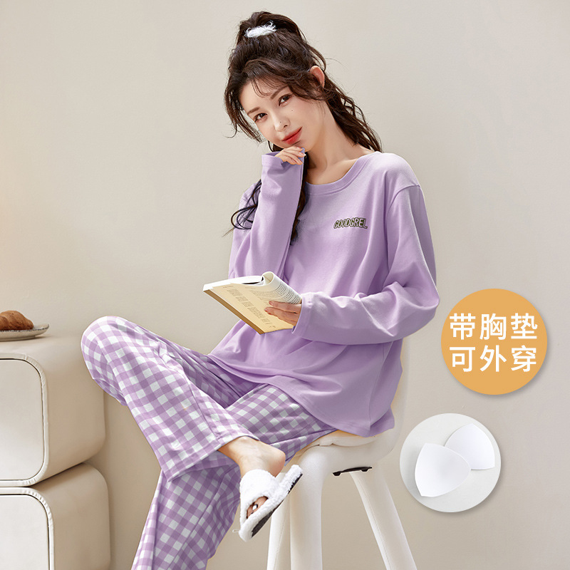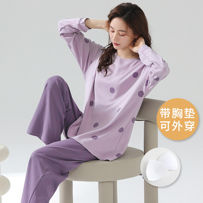 봄과 가을 잠옷 여성용 긴팔 바지 둥근 목 원피스 캐주얼 얇은면 세트 가슴 패드가 달린 청소년 홈웨어