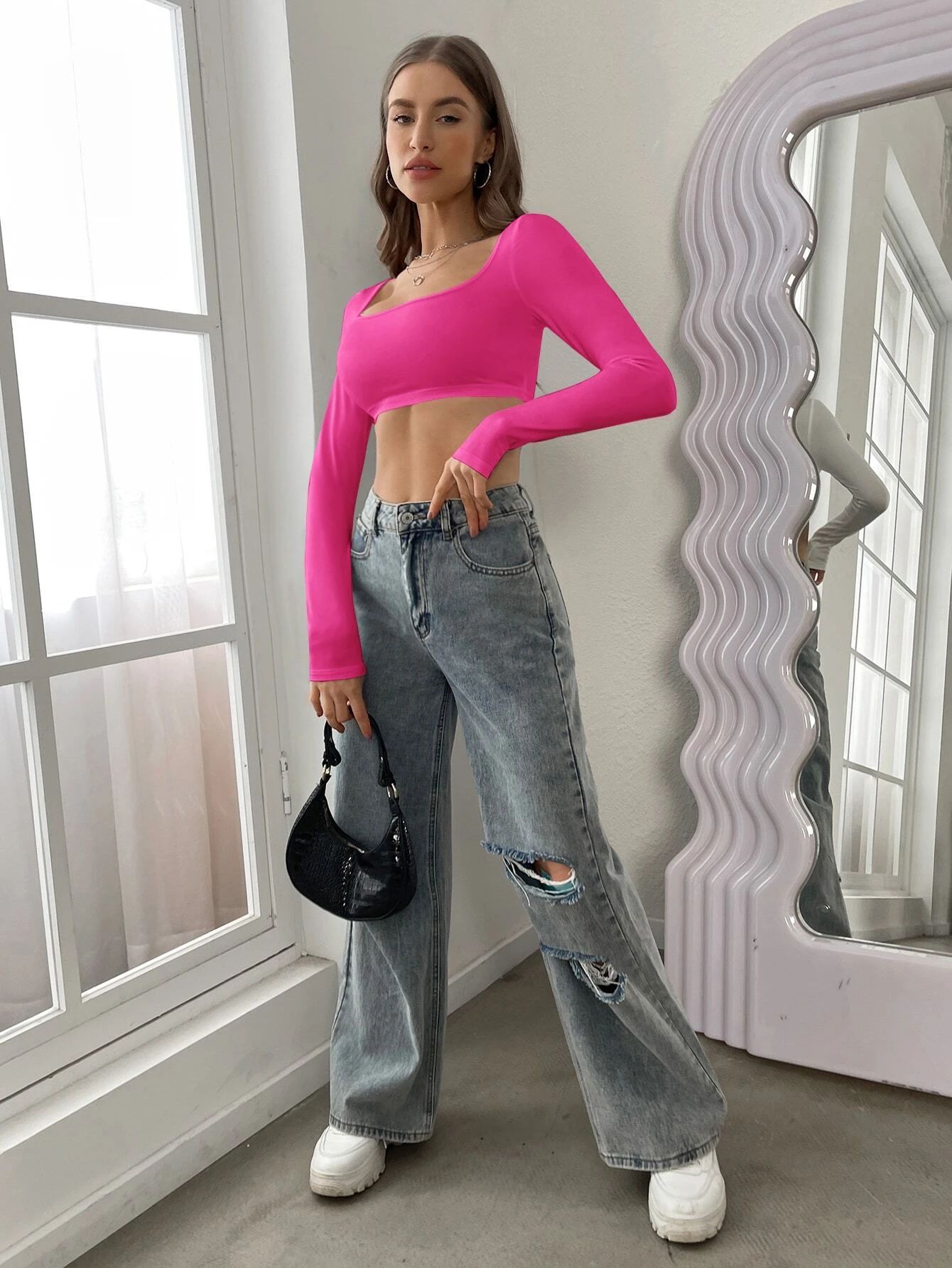새로운 크로스보더 유럽 및 미국 여성복 스포츠 캐주얼 크롭 니트 고탄성 긴팔 티셔츠 상의
