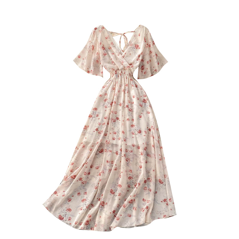 해변 휴가 원피스 여성 여름 2022 새로운 섹시한 V 넥 타이트 허리 슬리밍 긴 쉬폰 꽃 무늬 해변 원피스