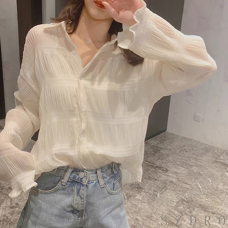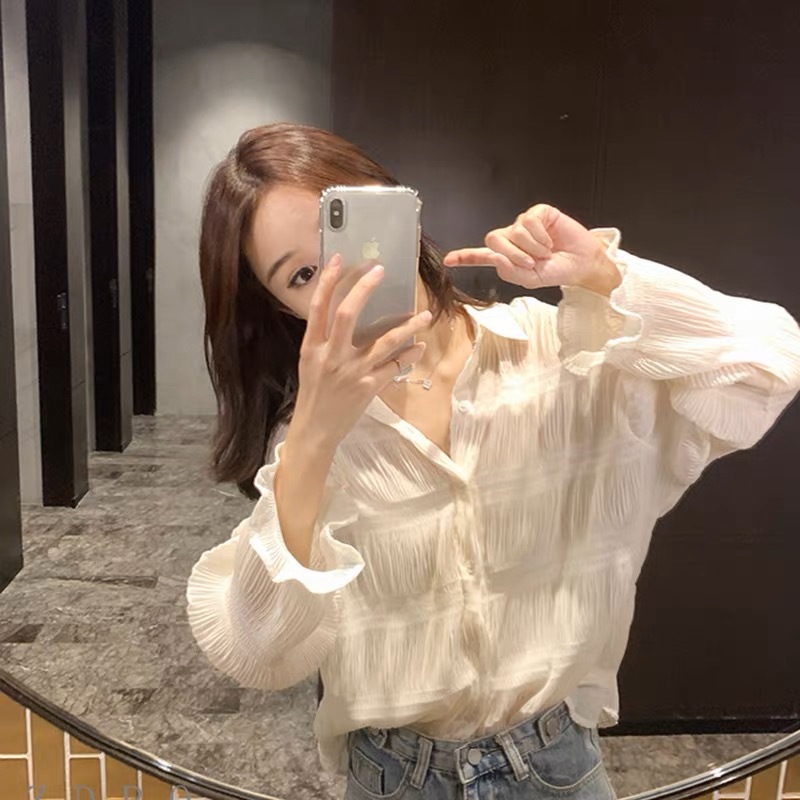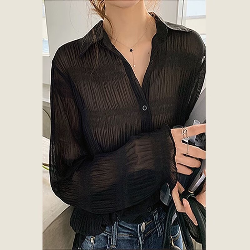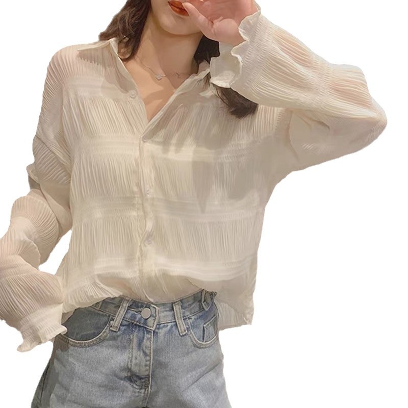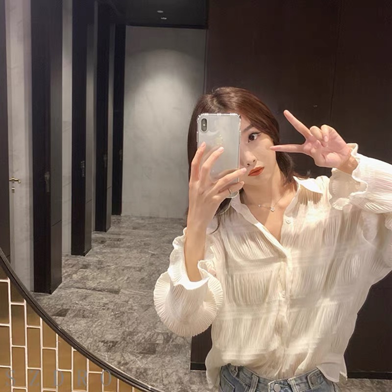 2024 새로운 우아한 옷깃 흰색 셔츠 여름 내부 서양식 쉬폰 긴 소매 디자인 감각 틈새 상단
