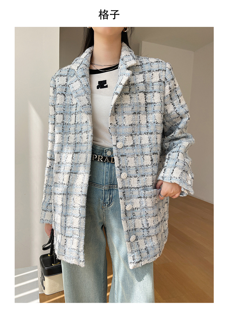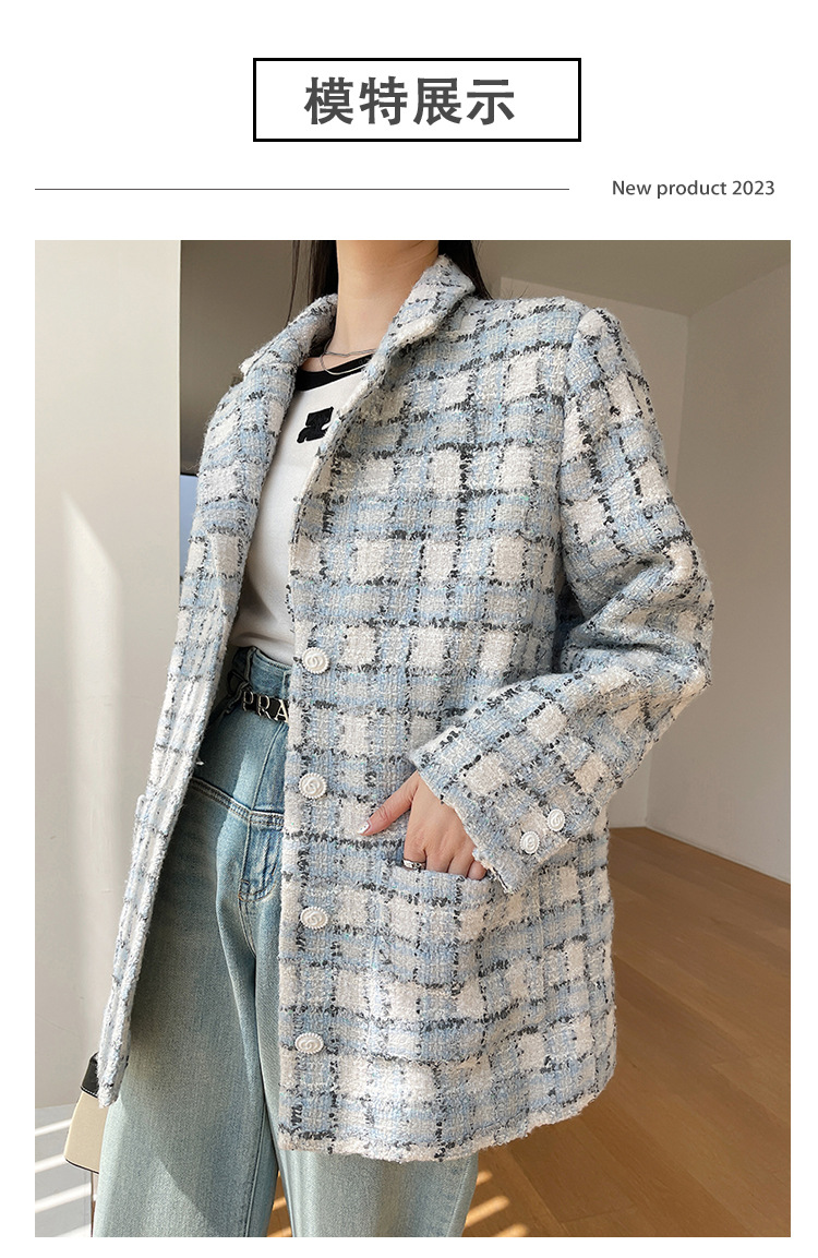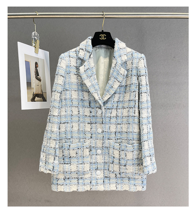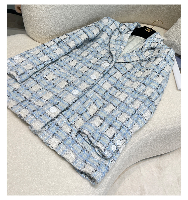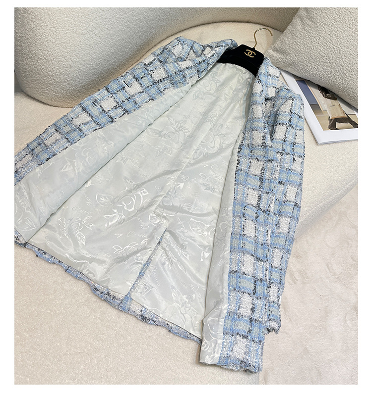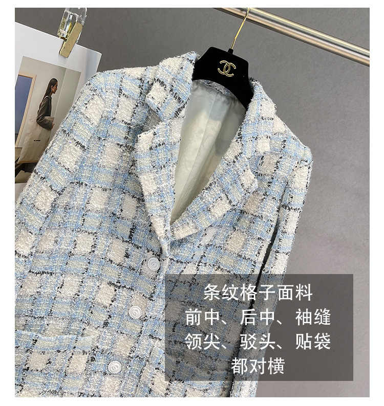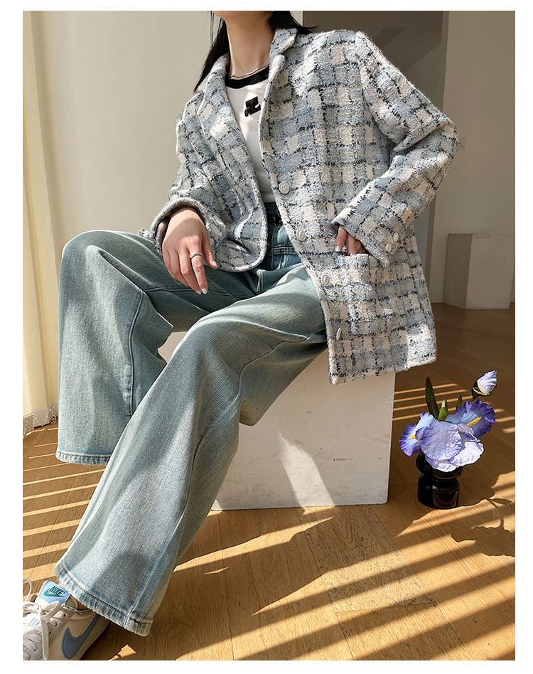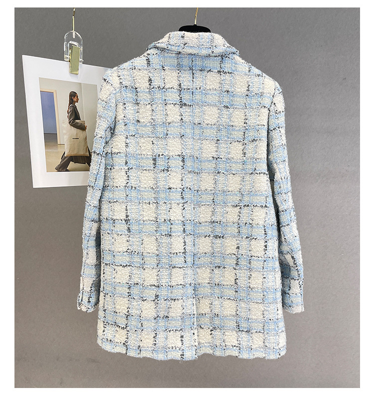 안피오나 프렌치 스타일 모직 블루 화이트 체크 트위드 블레이저 칼라 중간 길이 여성 자켓, 우아한 스타일