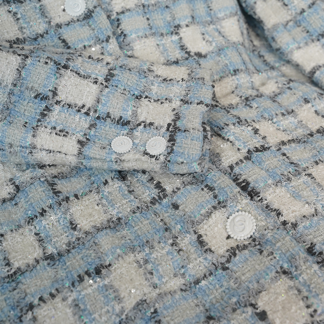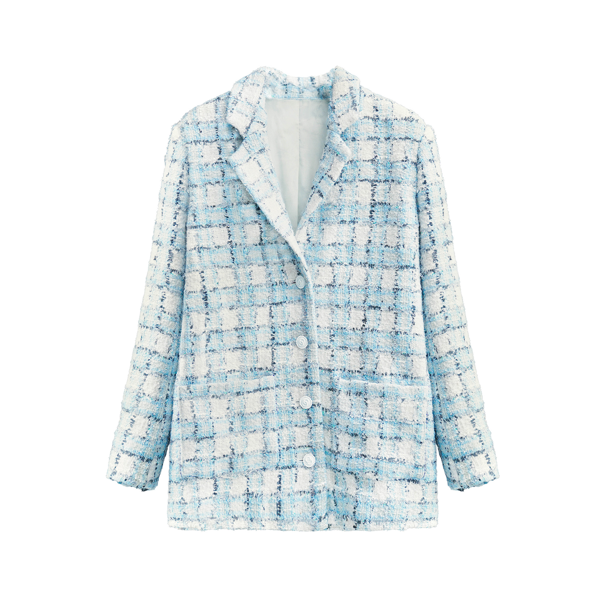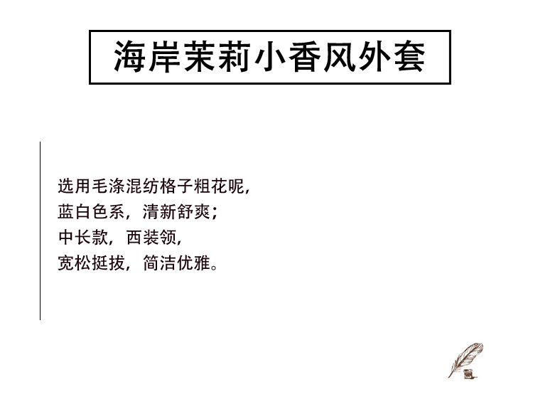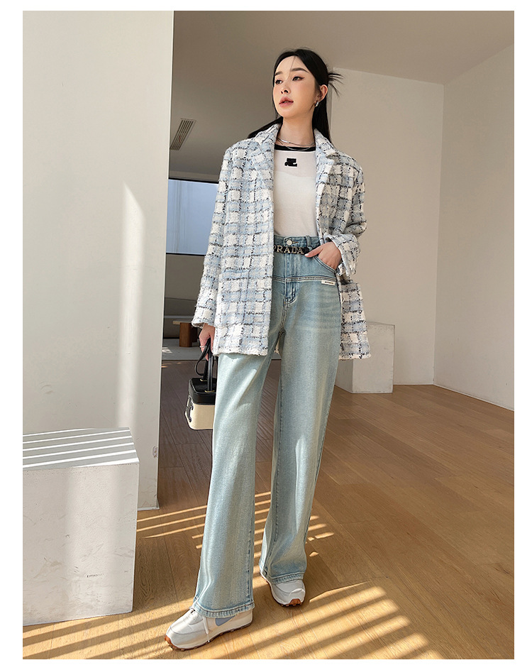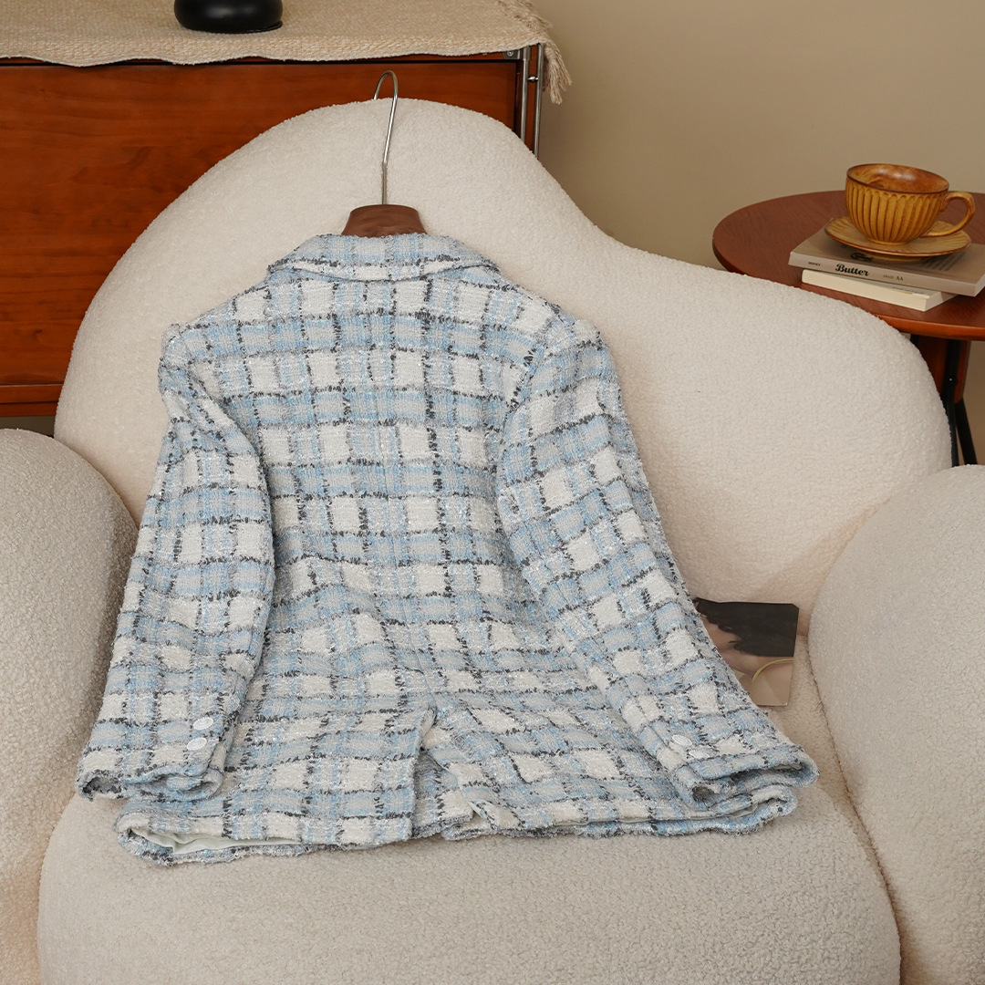 안피오나 프렌치 스타일 모직 블루 화이트 체크 트위드 블레이저 칼라 중간 길이 여성 자켓, 우아한 스타일