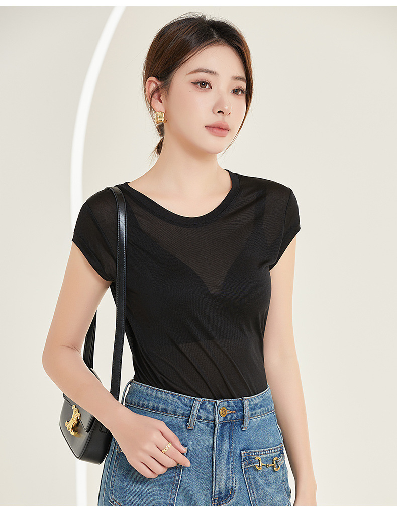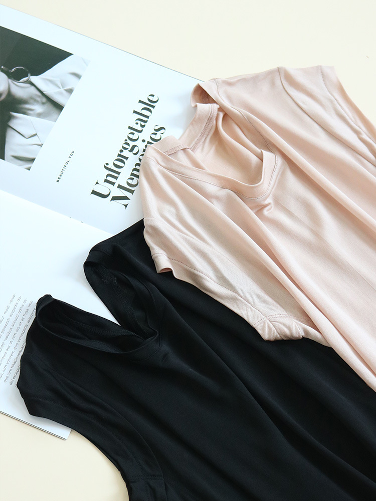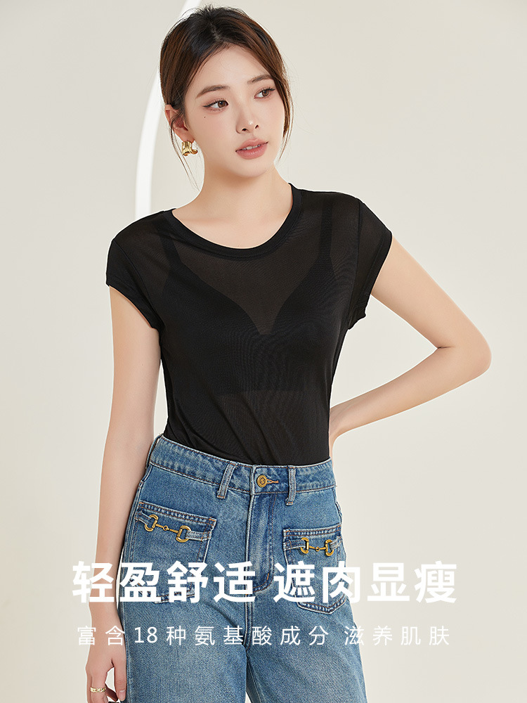 Tangge 봄/여름 실크 원슬리브 바닥 셔츠 여성 홈 착용 뽕나무 실크 둥근 목 반팔 티셔츠 겨드랑이 땀 흡수 층