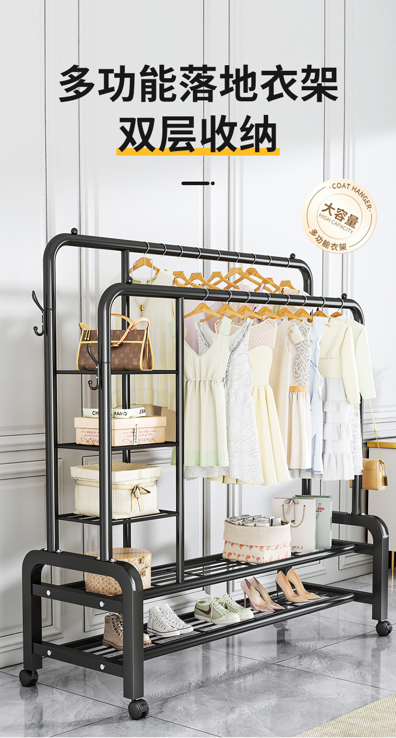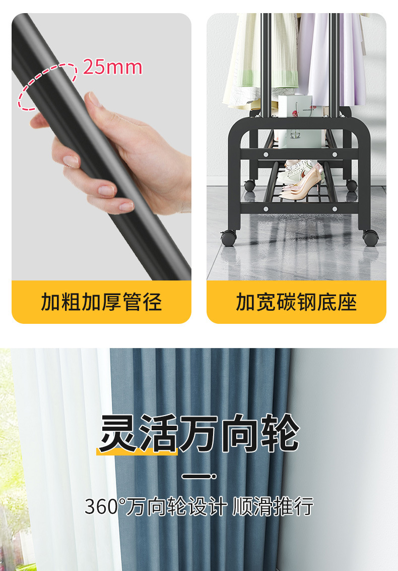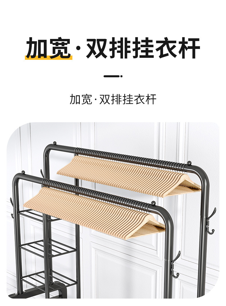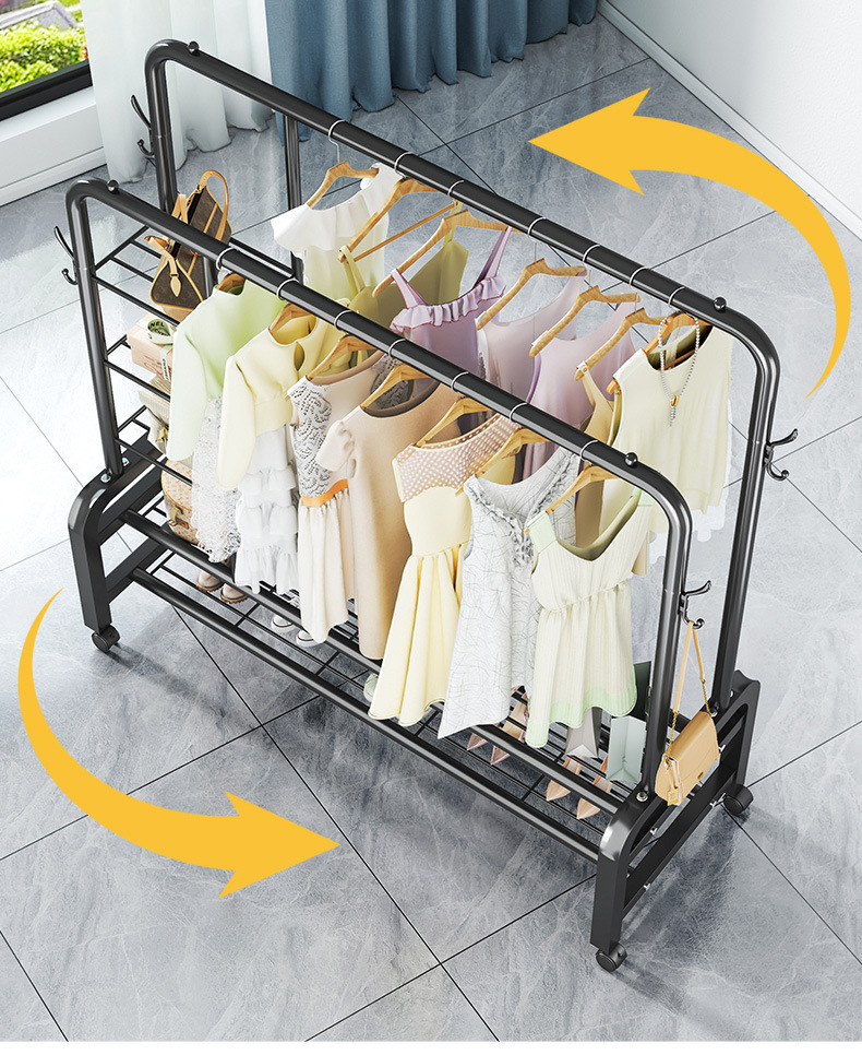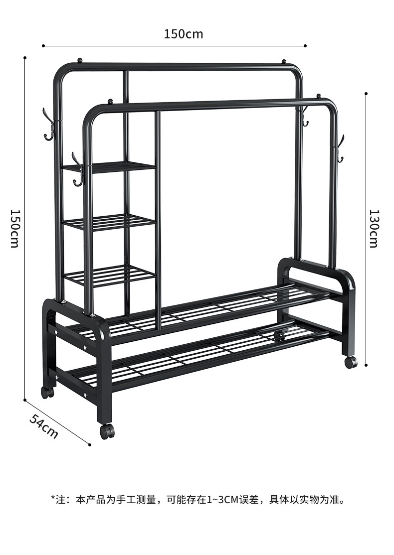 25 원형 옷걸이, 이중 극, 이중 측면, 3단 수납망, 후크 4개, 130 검정색 + 바퀴