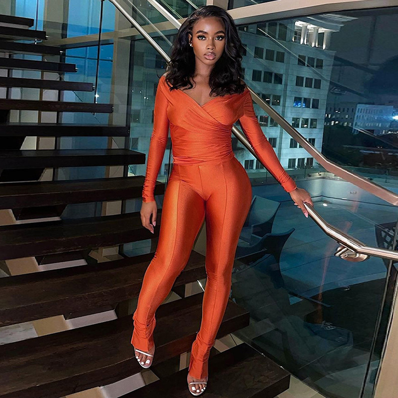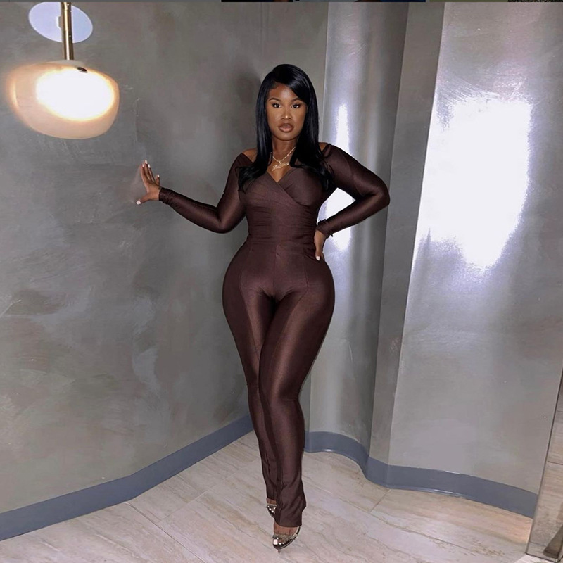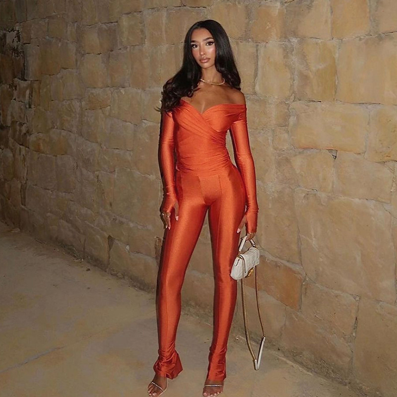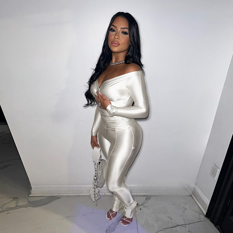 유럽과 미국 스타일 2024 봄과 여름 여성의 새로운 섹시한 오프 숄더 대형 V 넥 하이 허리 타이트 바지 캐주얼 스포츠 커버