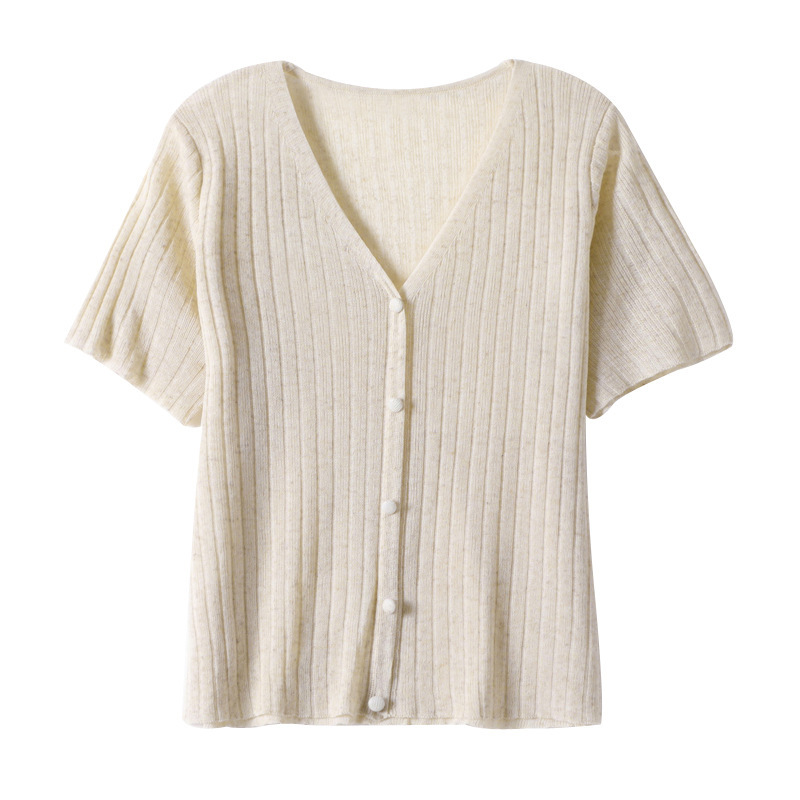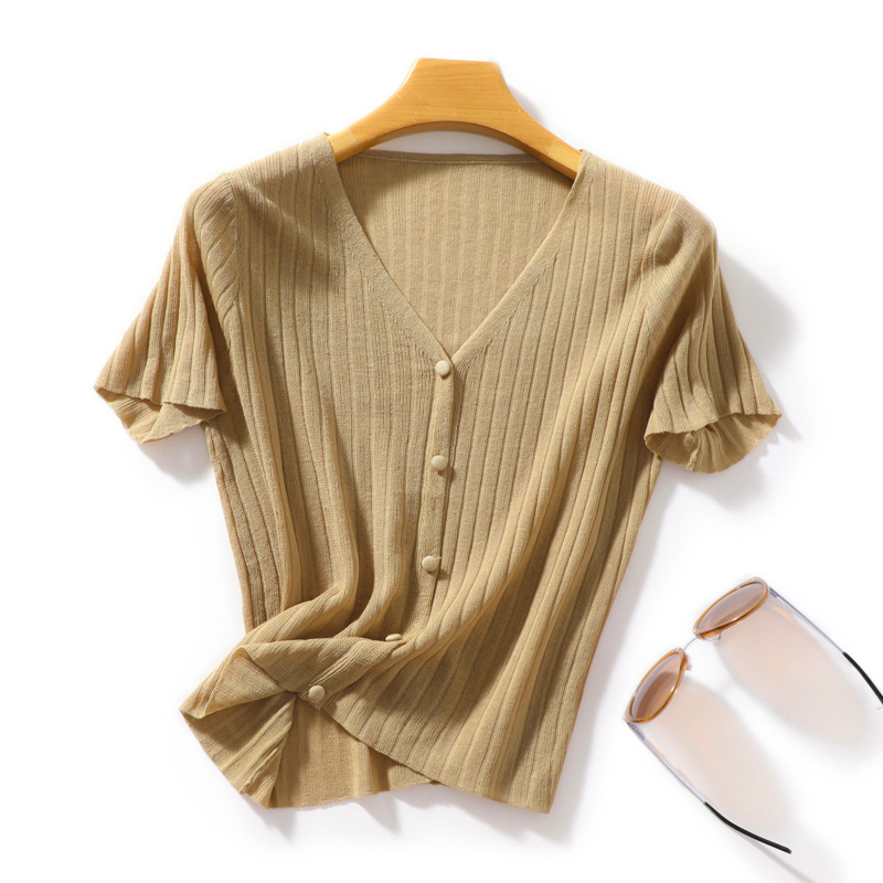 2025 여름 신작 라미 니트 티셔츠 반팔 여성 루즈 브이넥 풀오버 숏 코트 얇은 카디건 탑