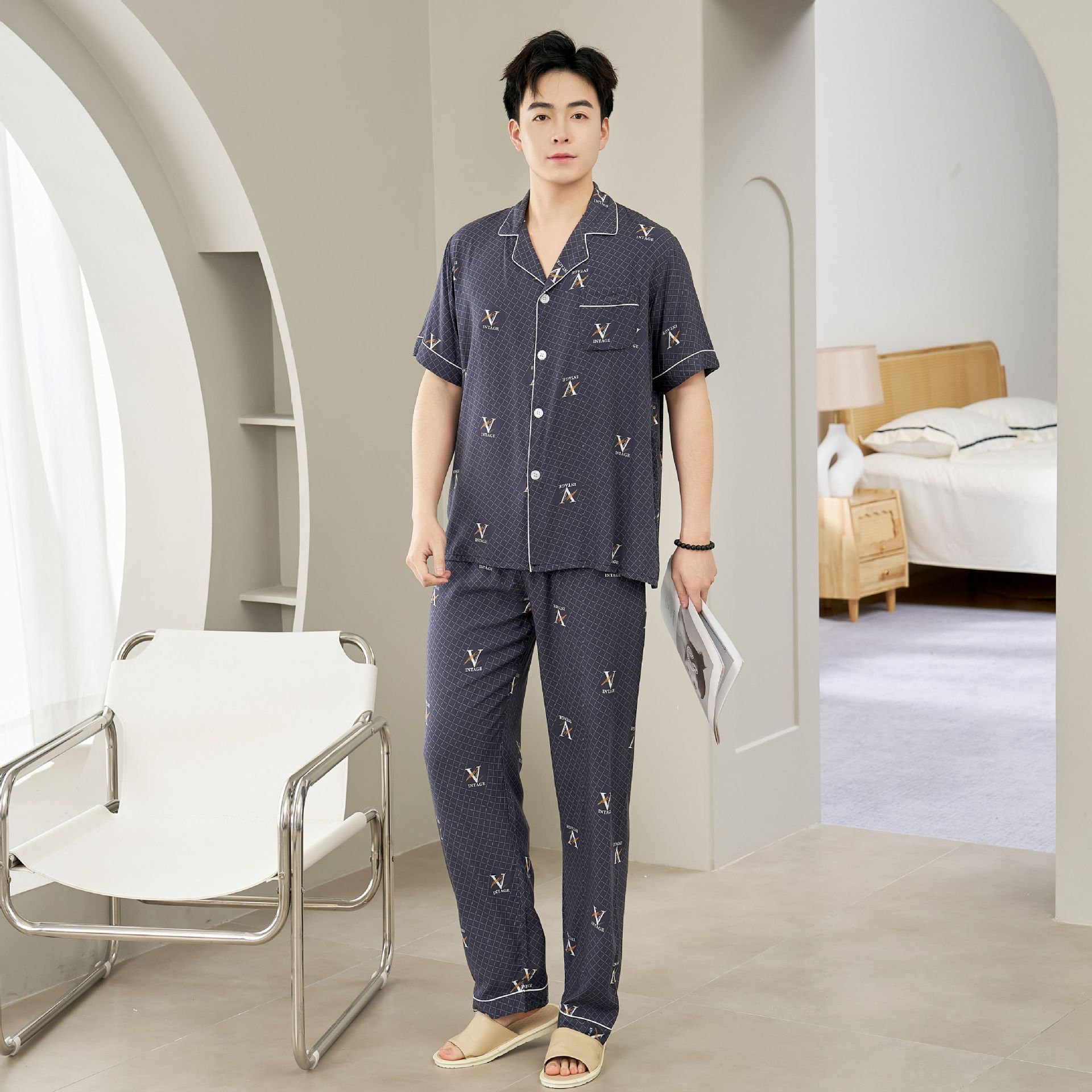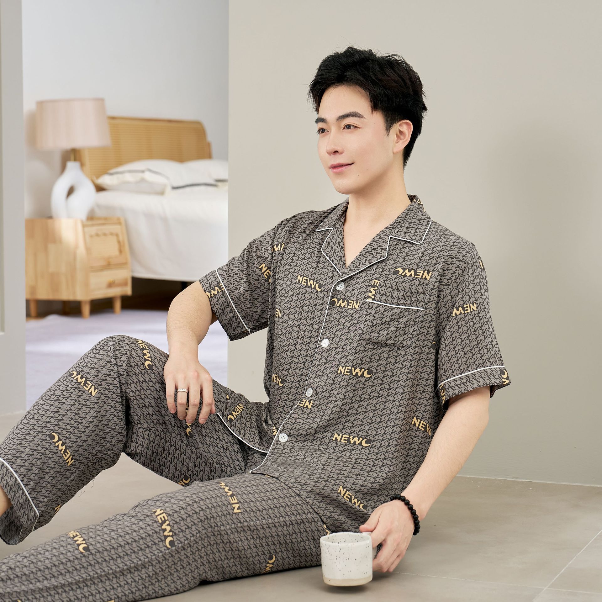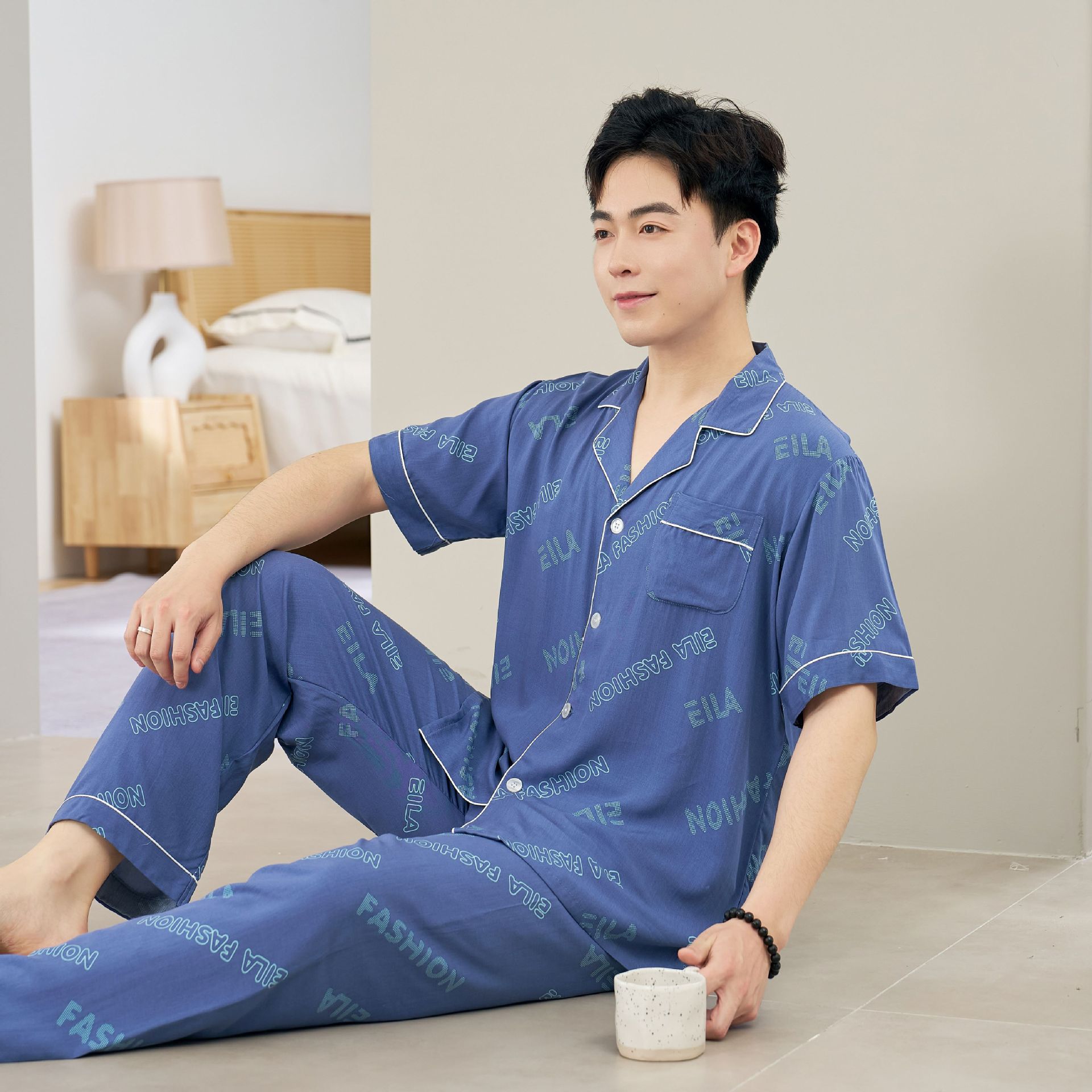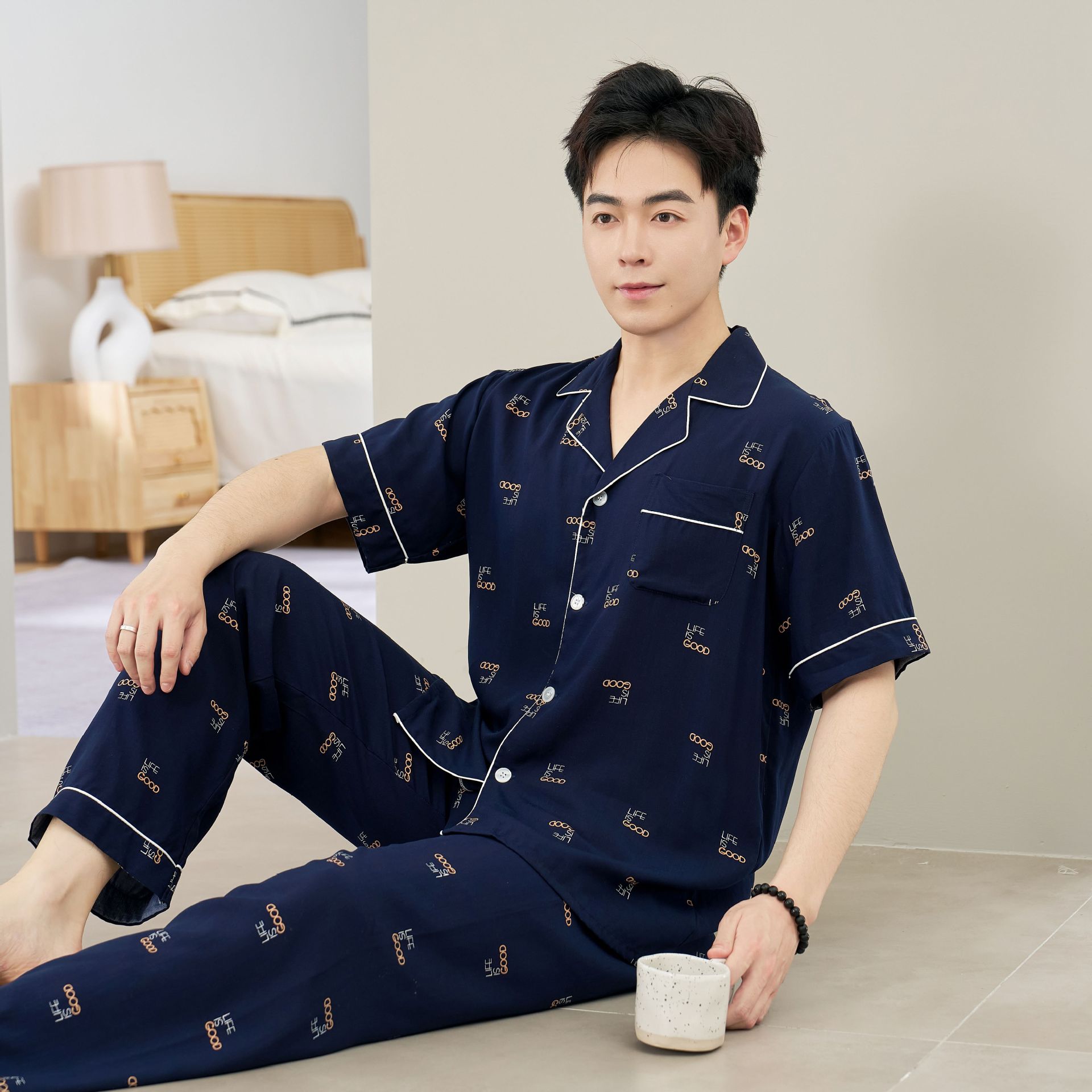 면 실크 남성 잠옷, 라펠 카디건, 봄 여름용 얇은 면 실크 루즈핏 반팔 잠옷, 심플하고 편안한 홈웨어