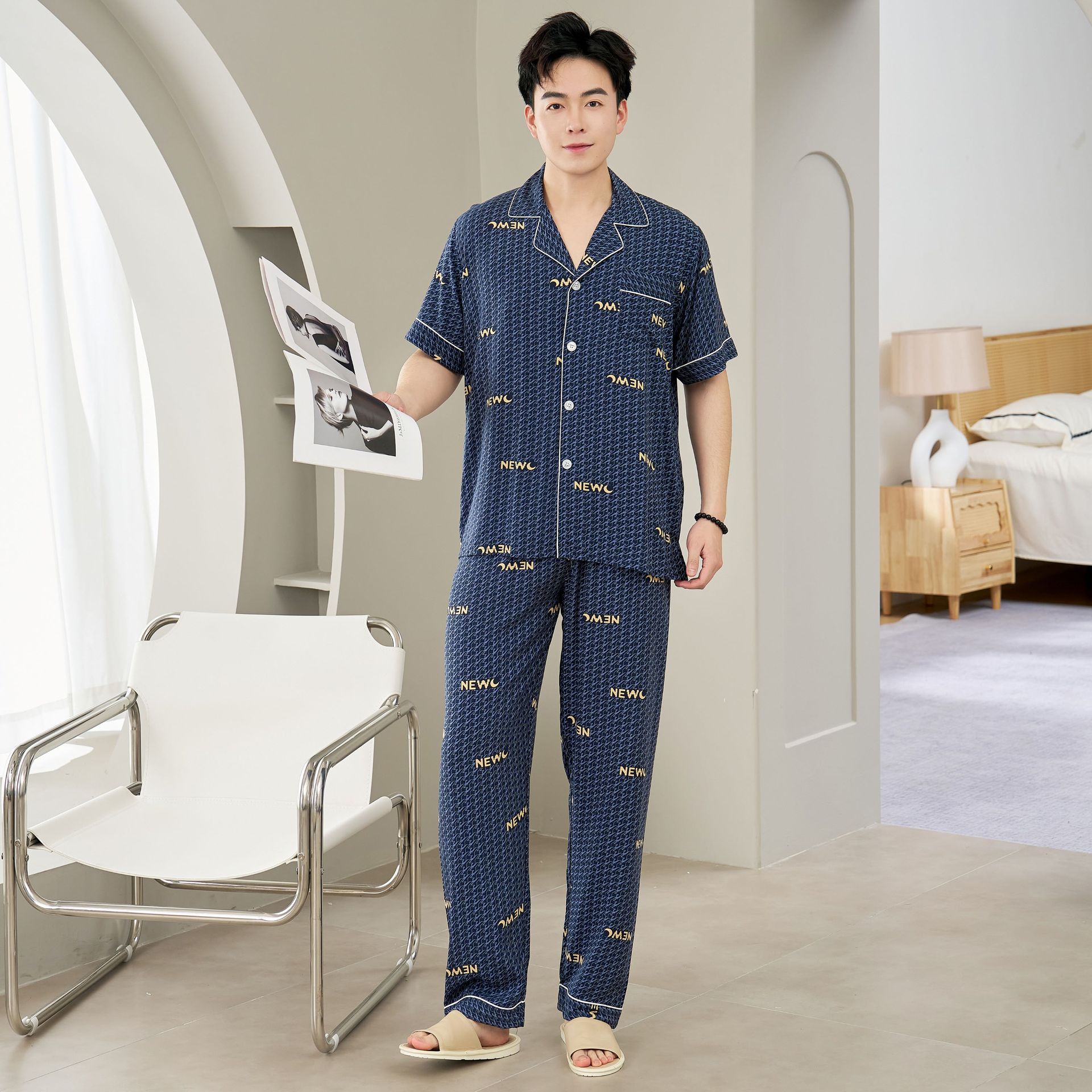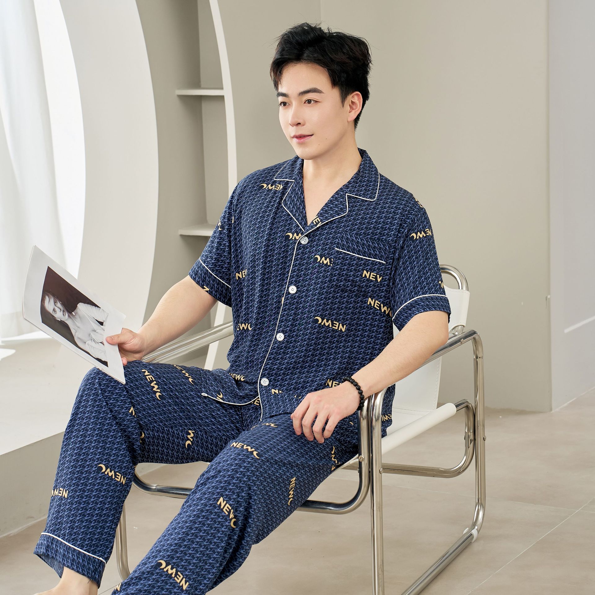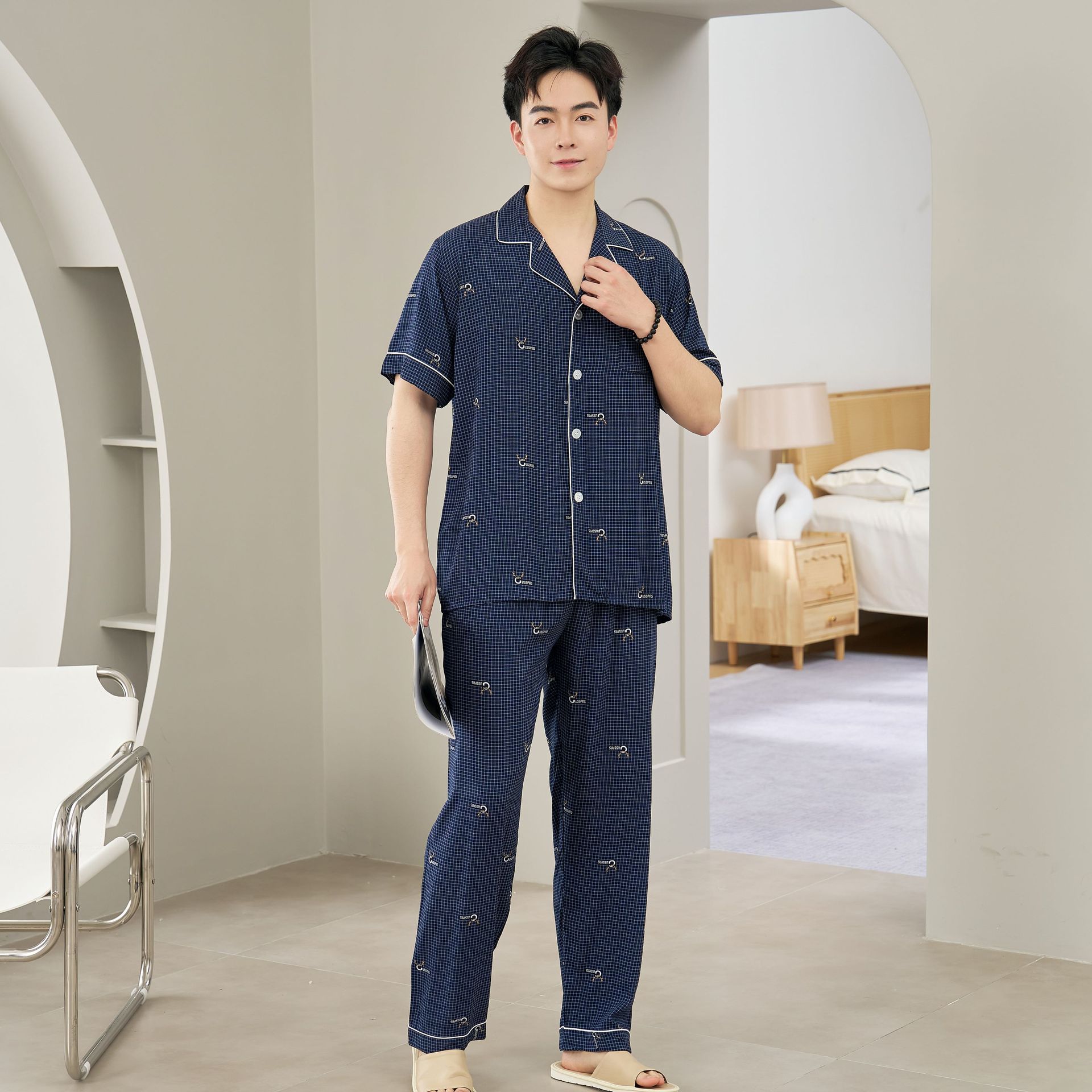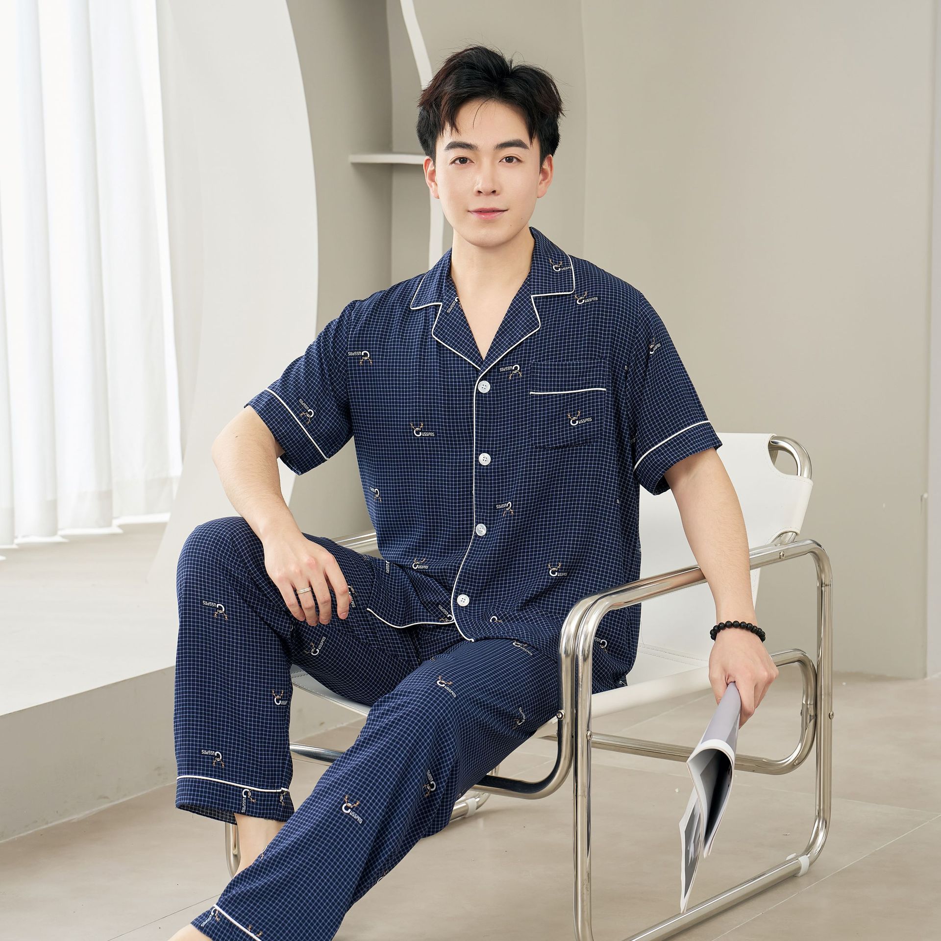 면 실크 남성 잠옷, 라펠 카디건, 봄 여름용 얇은 면 실크 루즈핏 반팔 잠옷, 심플하고 편안한 홈웨어