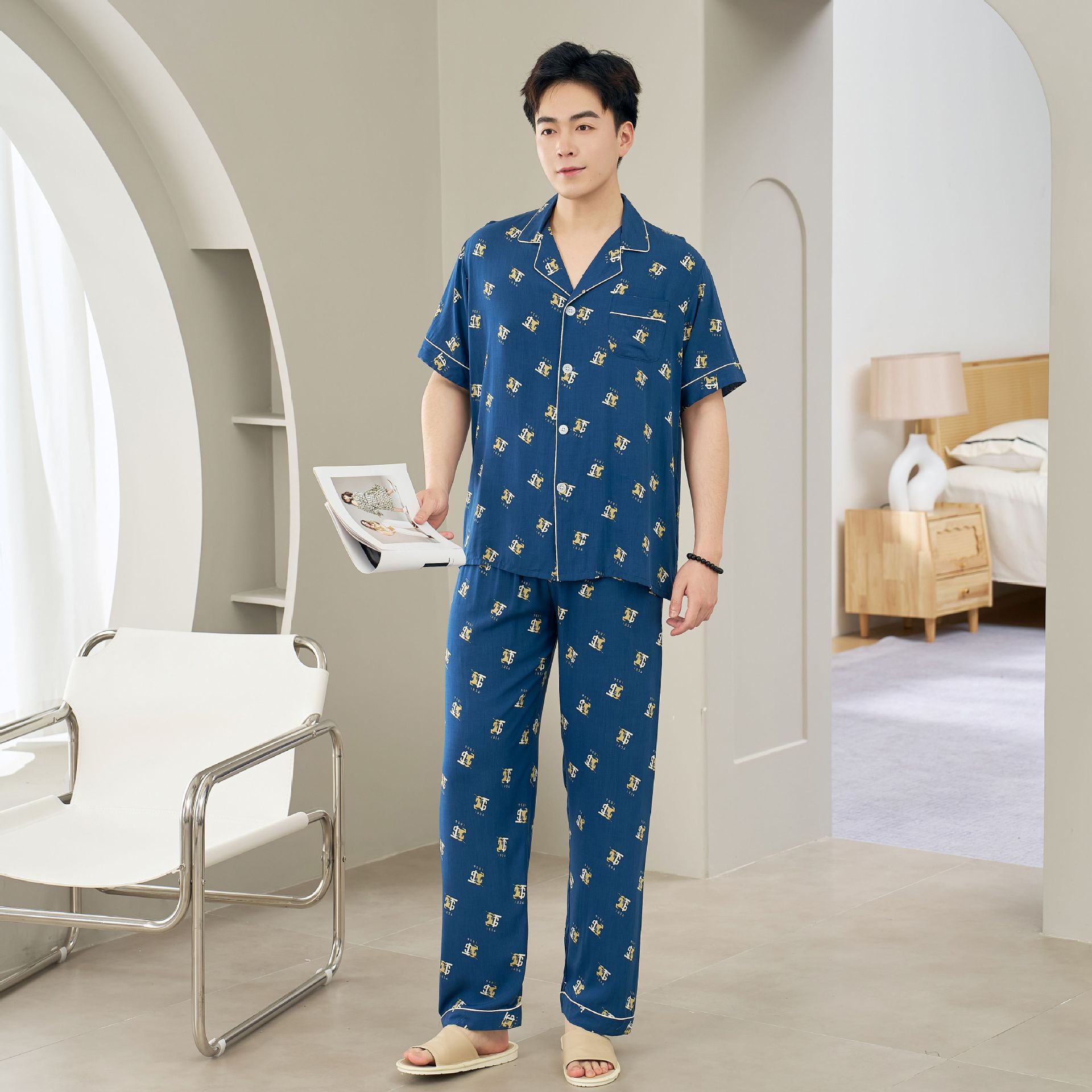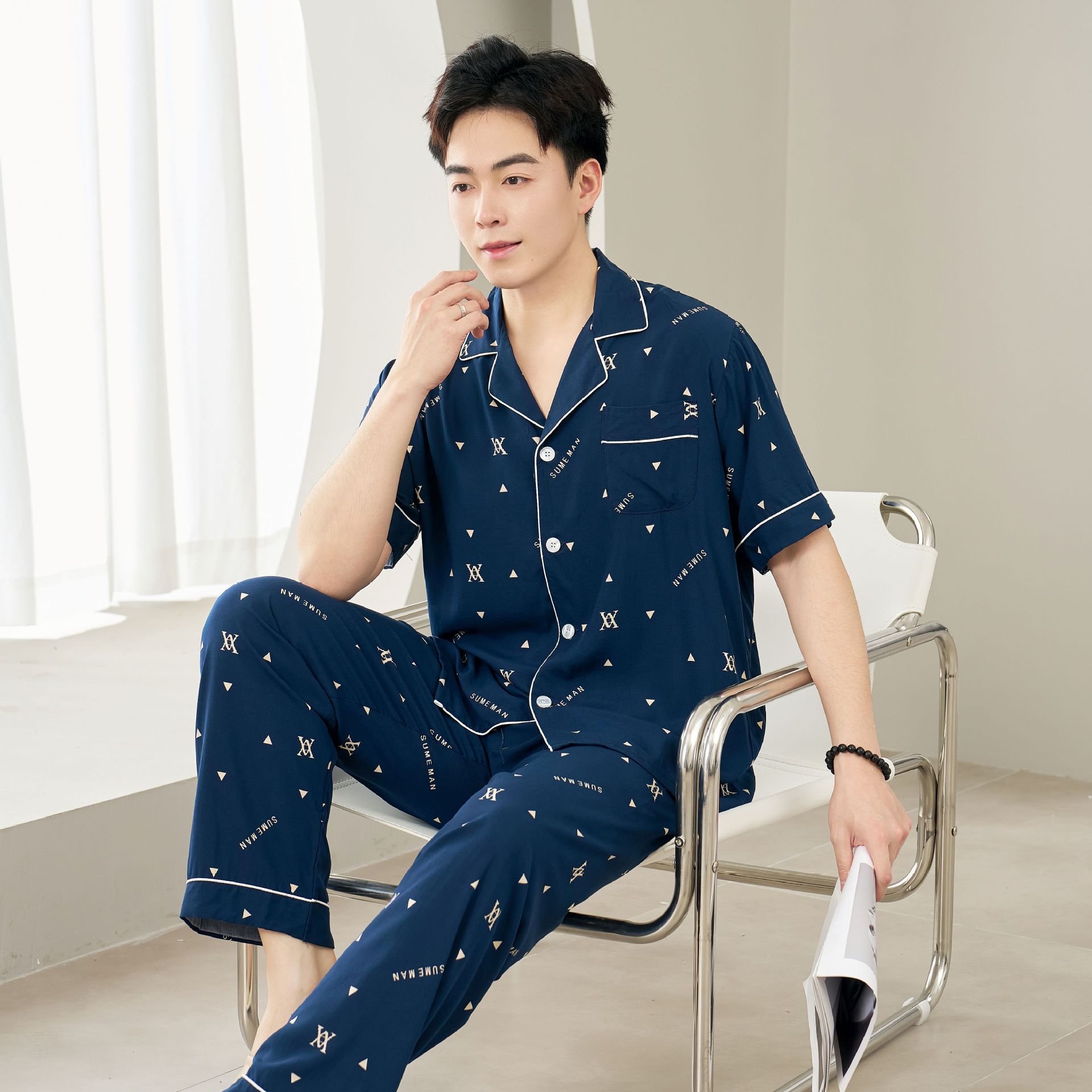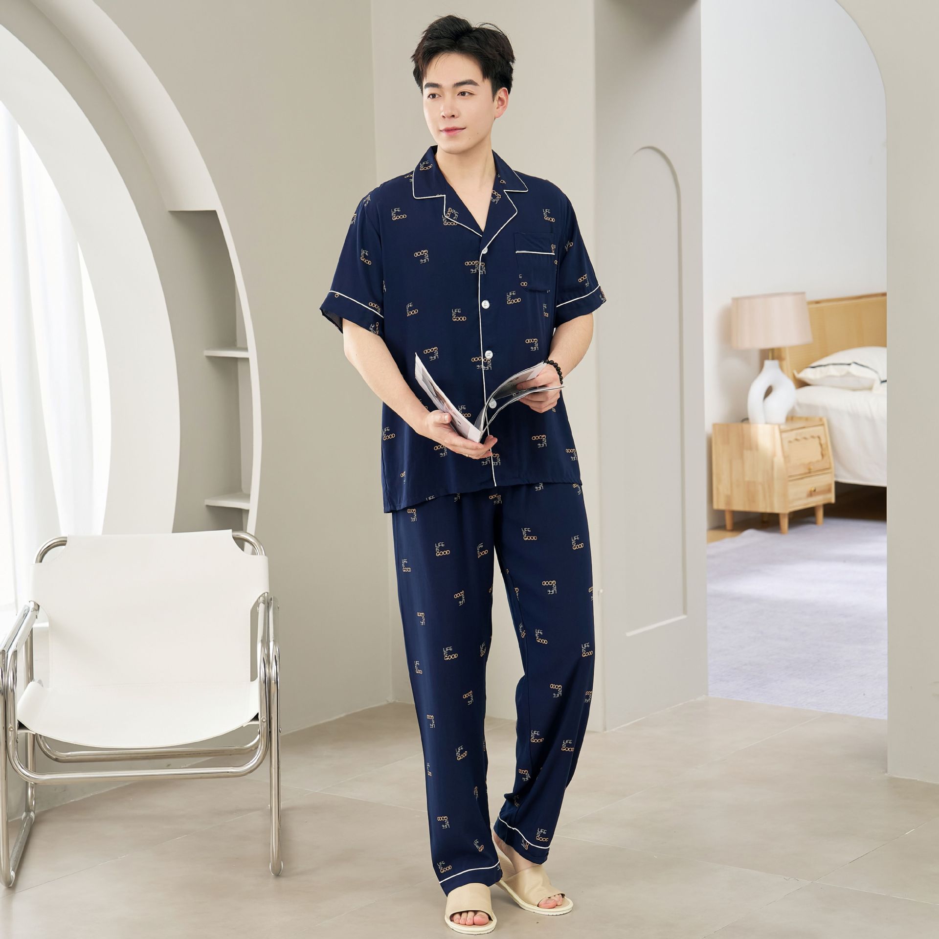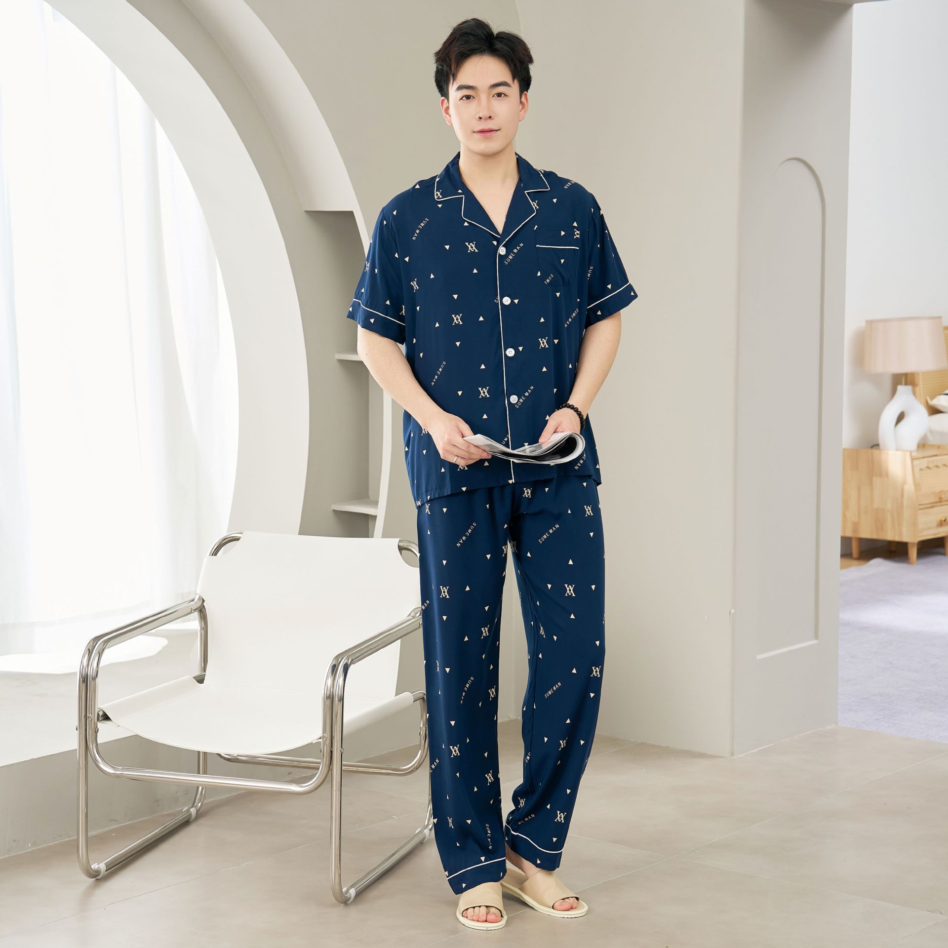 면 실크 남성 잠옷, 라펠 카디건, 봄 여름용 얇은 면 실크 루즈핏 반팔 잠옷, 심플하고 편안한 홈웨어