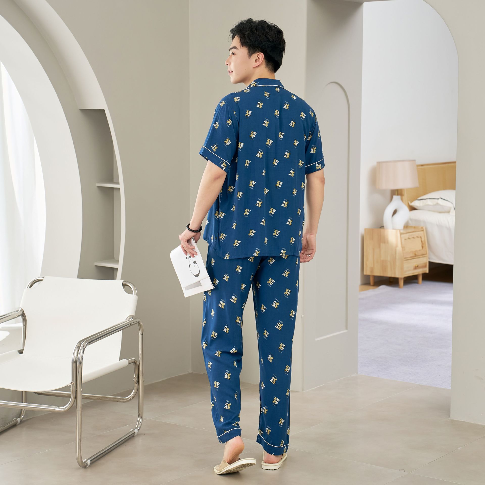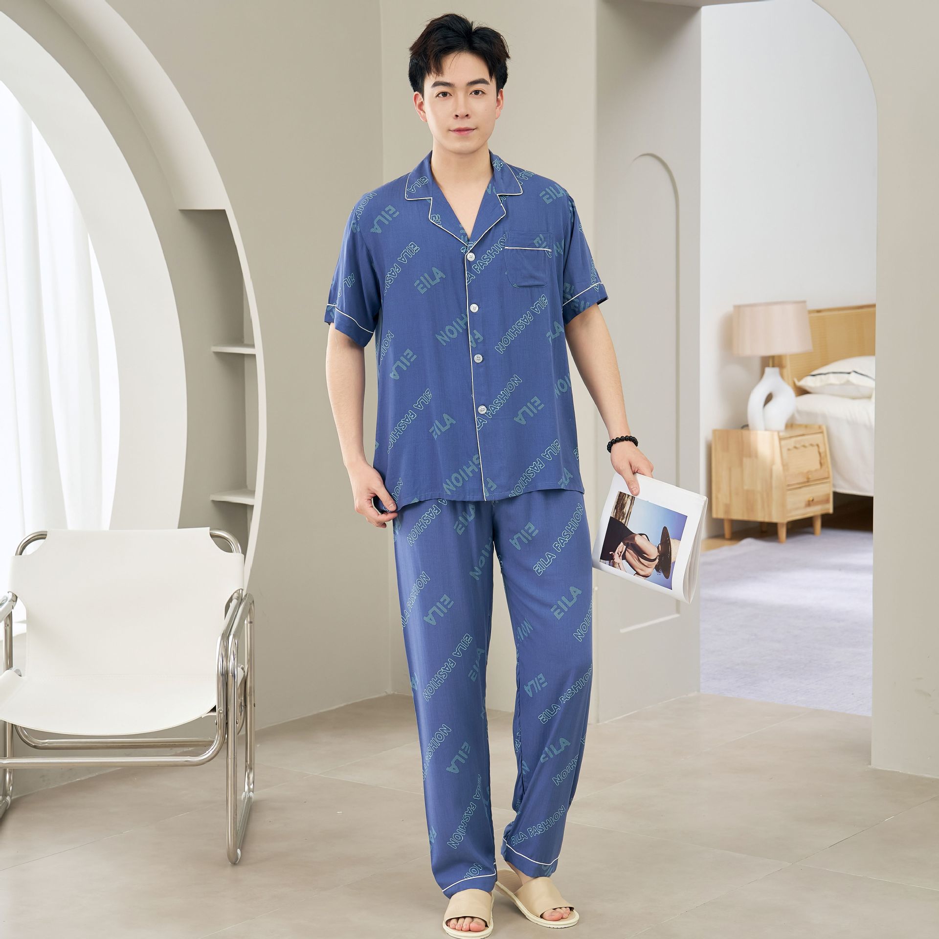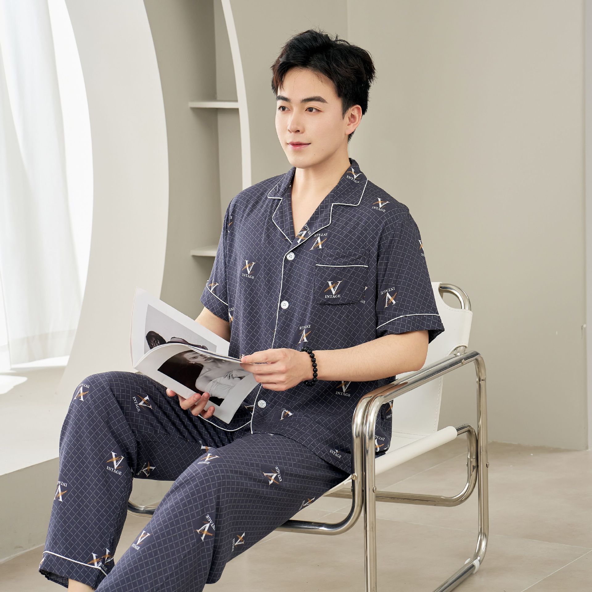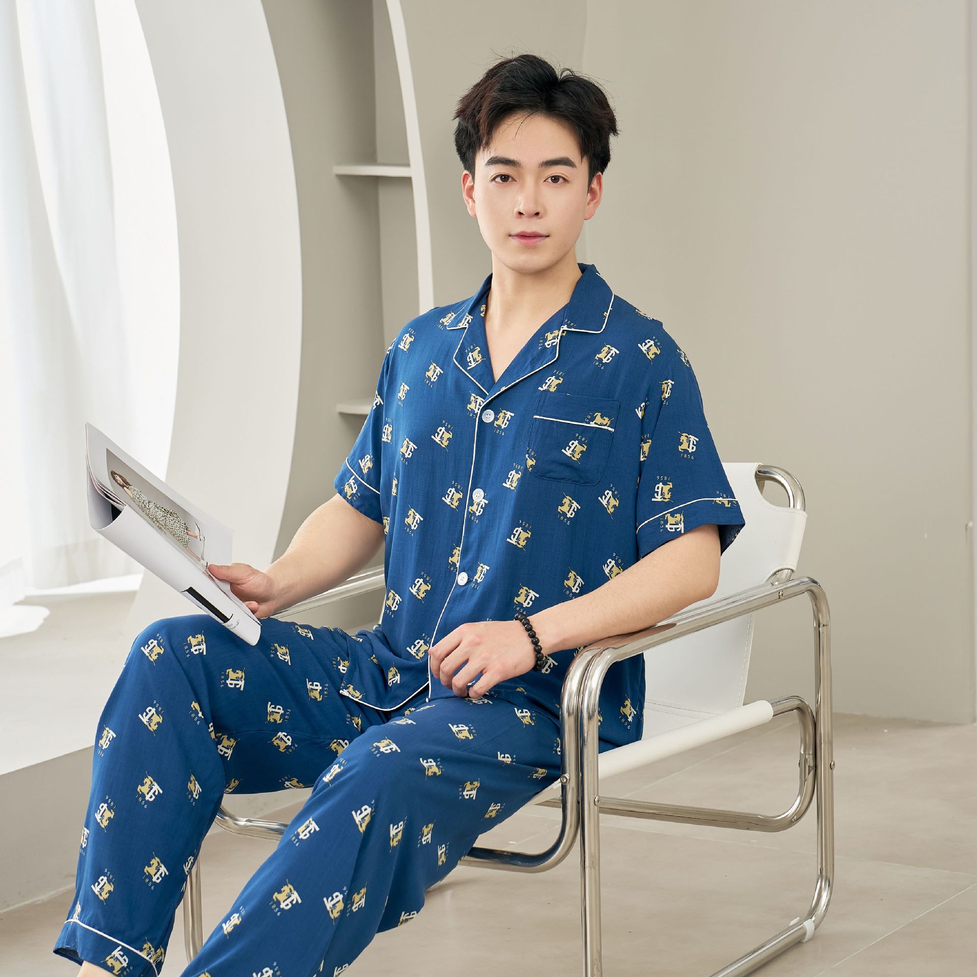 면 실크 남성 잠옷, 라펠 카디건, 봄 여름용 얇은 면 실크 루즈핏 반팔 잠옷, 심플하고 편안한 홈웨어