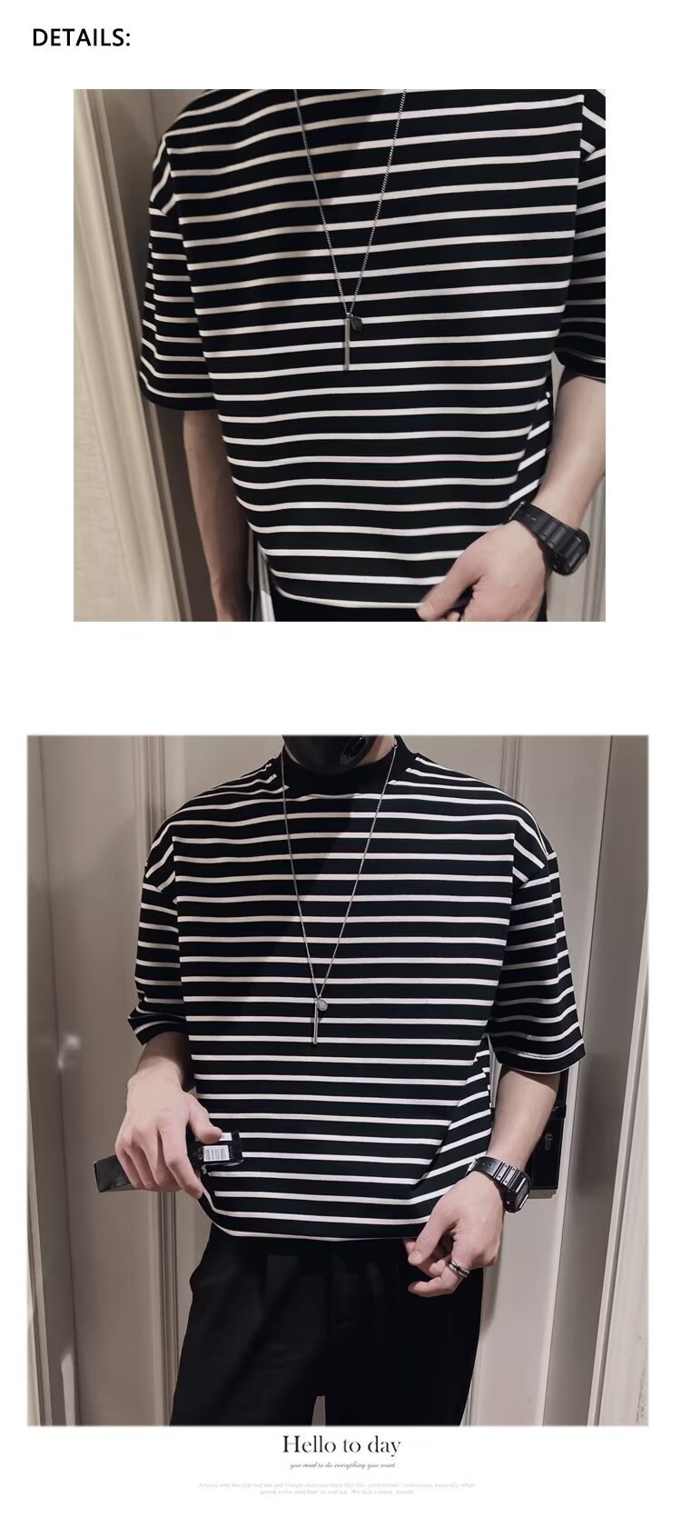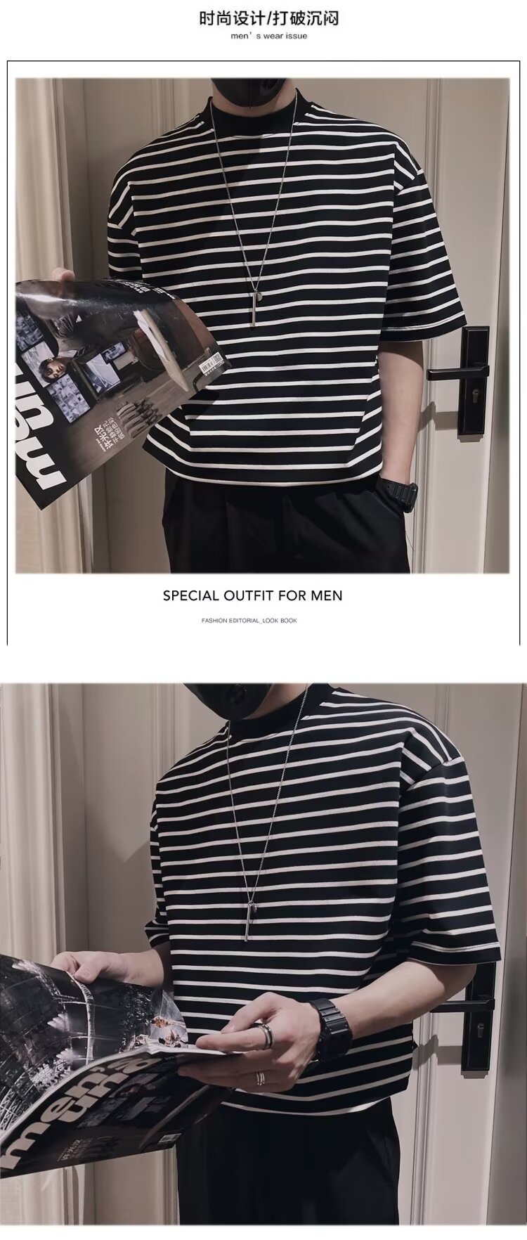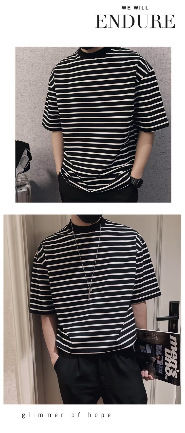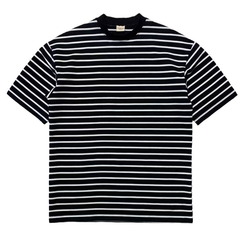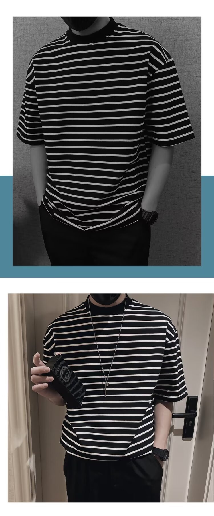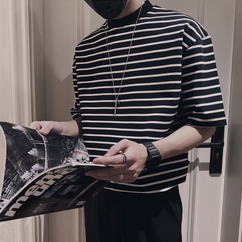 올 매치 반팔 남성 티셔츠 여름 새로운 느슨한 한국식 트렌디 한 스트라이프 반 터틀넥 반소매 트렌디 티셔츠
