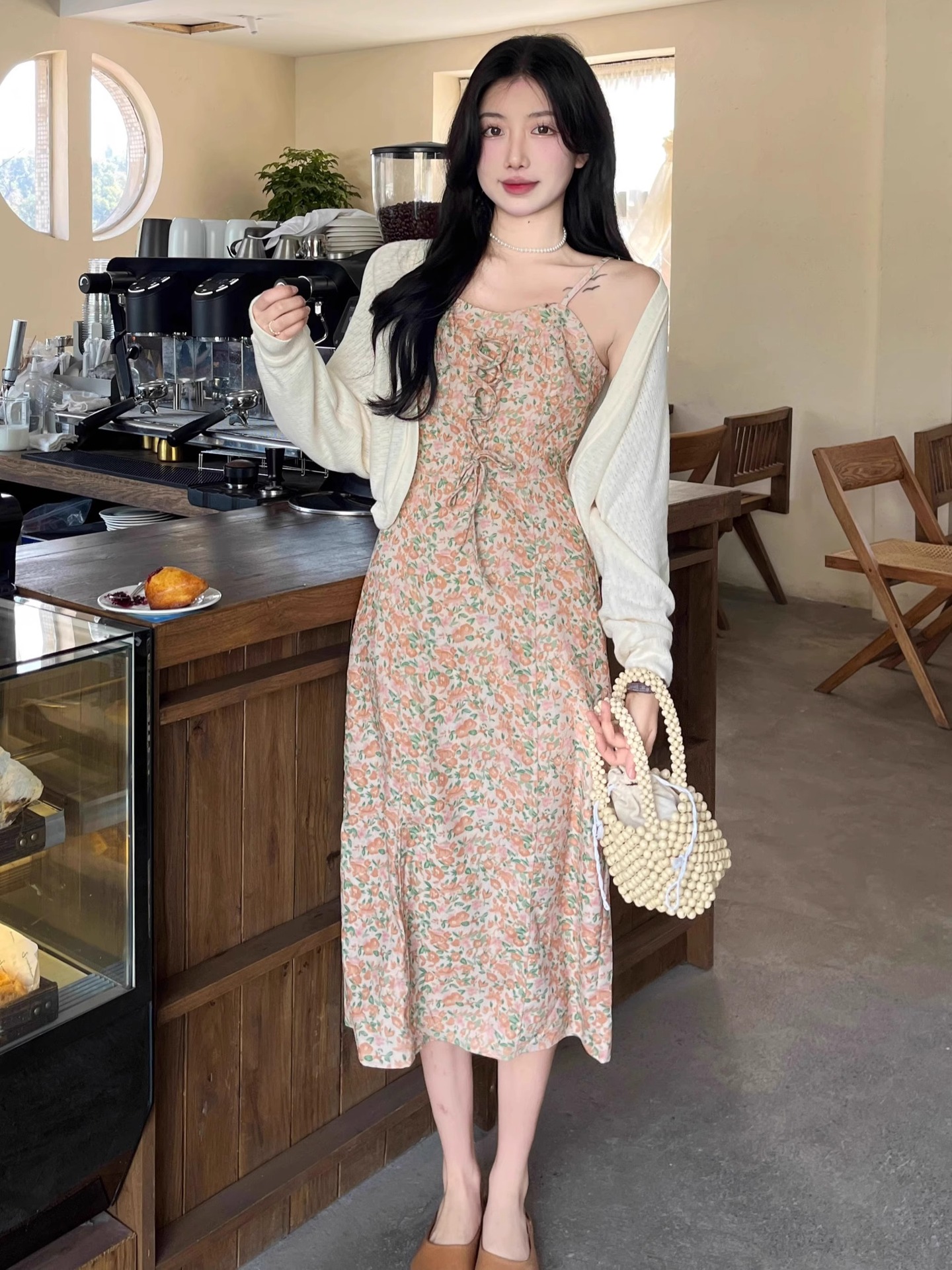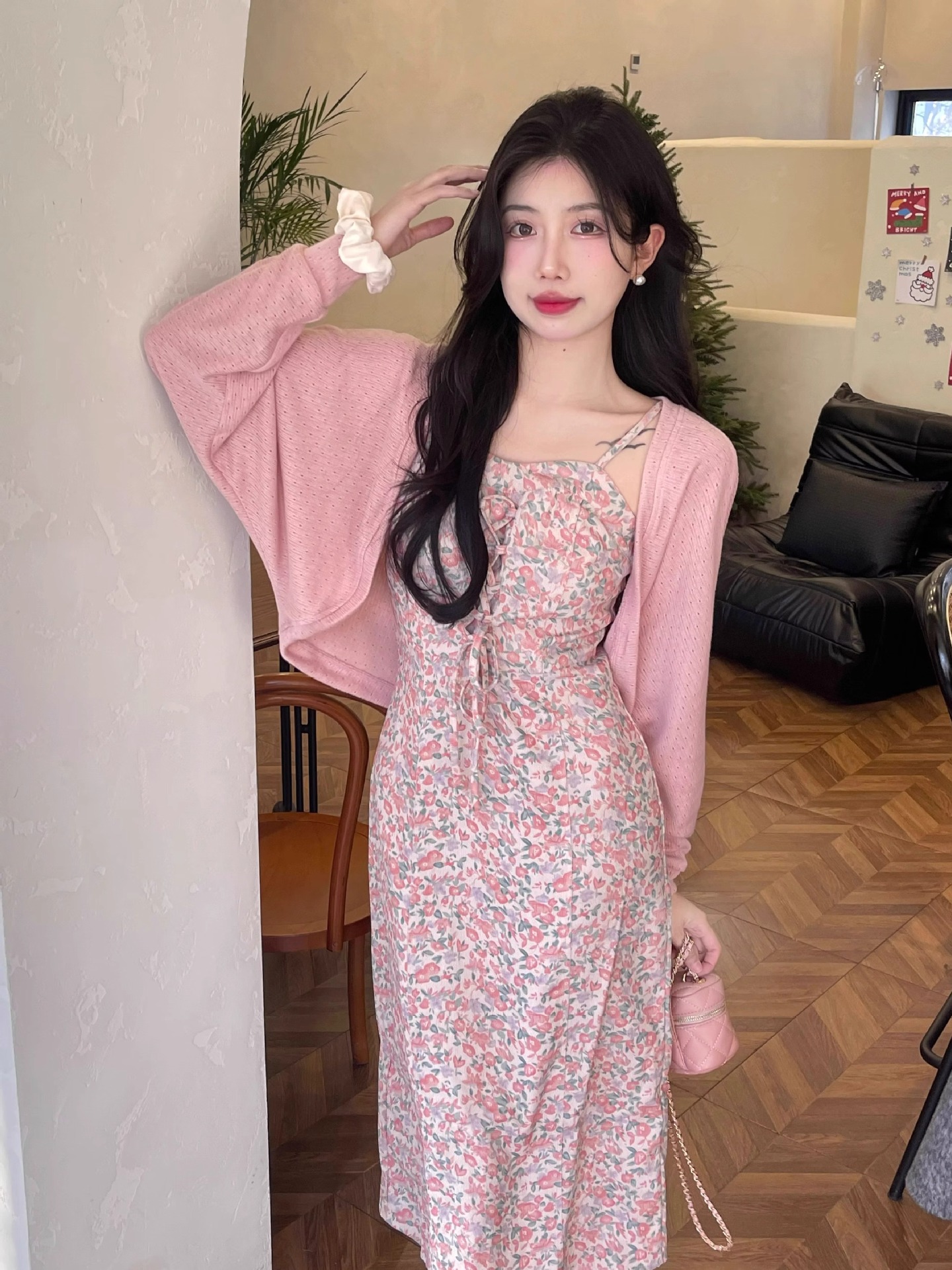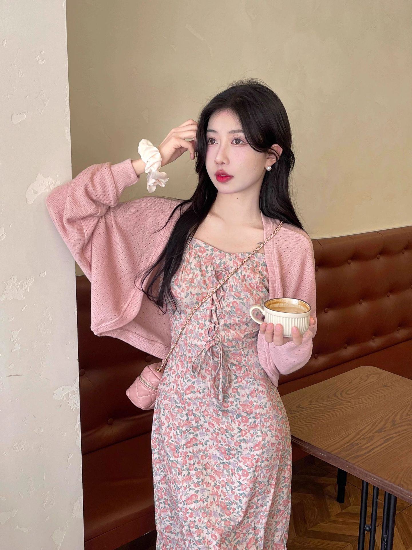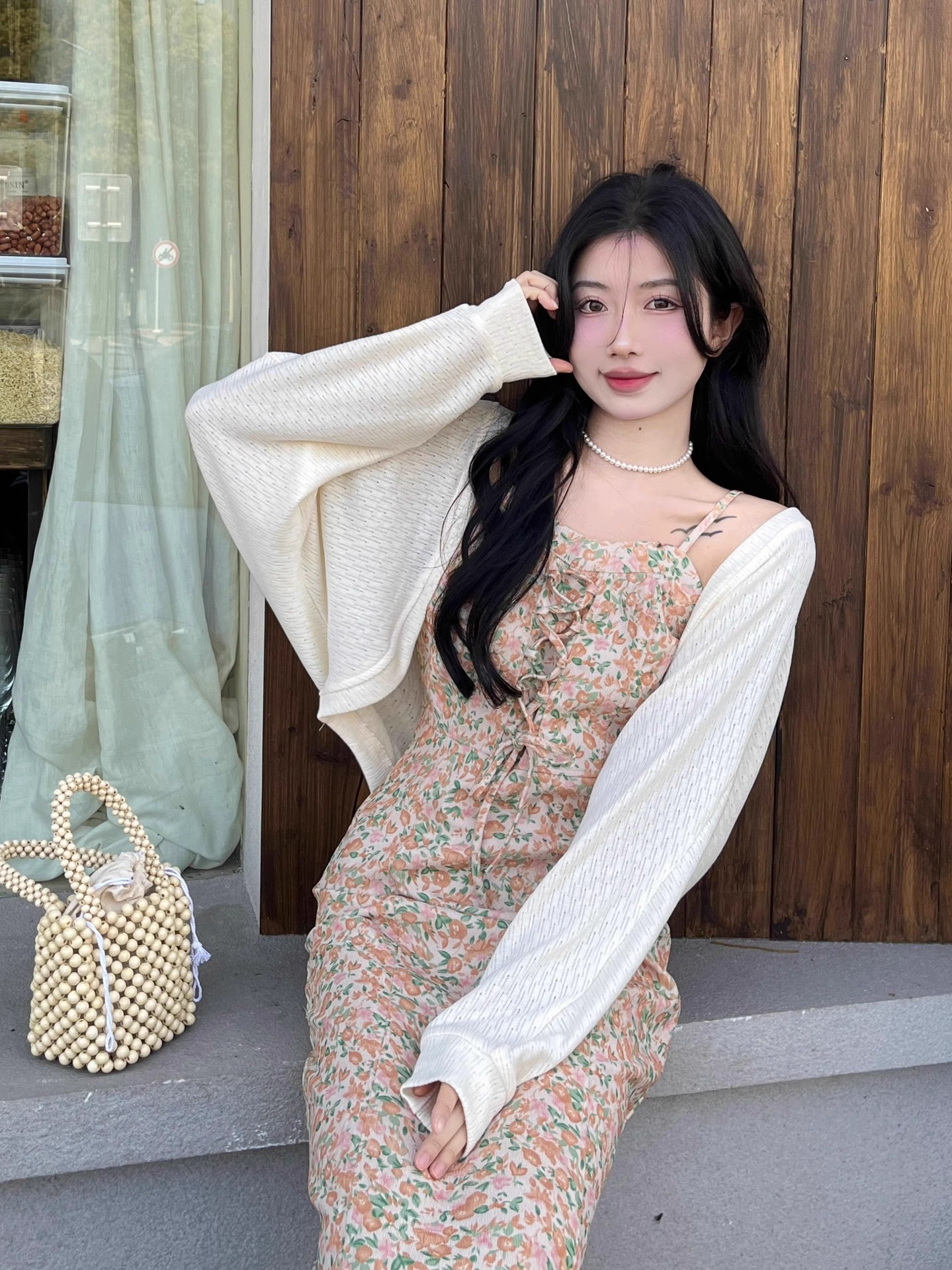 프랑스 우유 살구색 니트 카디건 코트 여성의 봄과 가을 서스펜더 스커트 외부 목도리 배트 윙 슬리브 아이스 실크 태양 보호 셔츠 여름