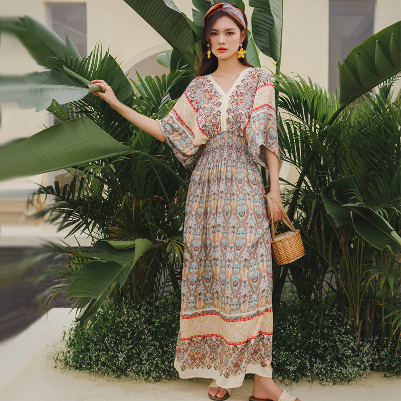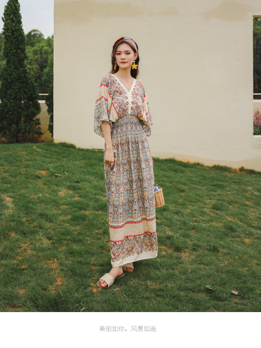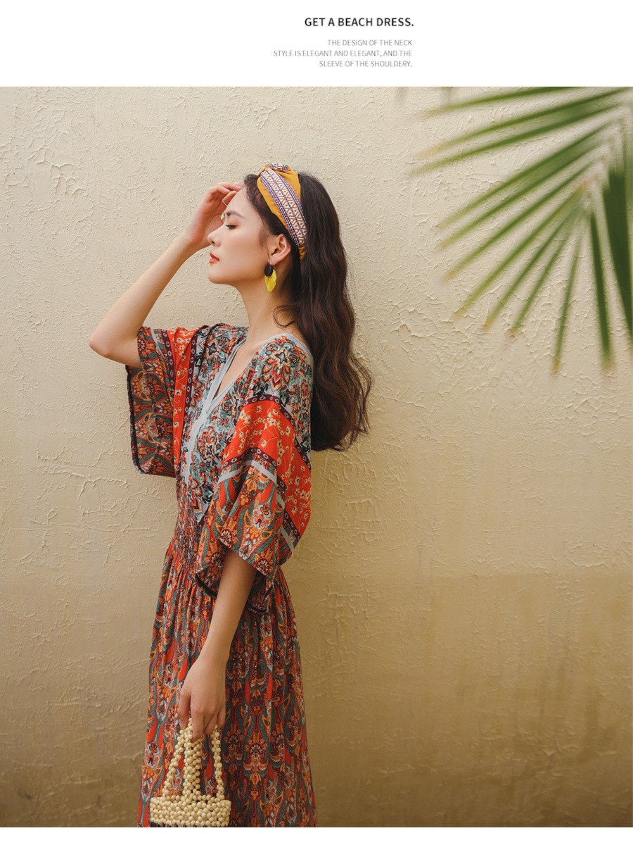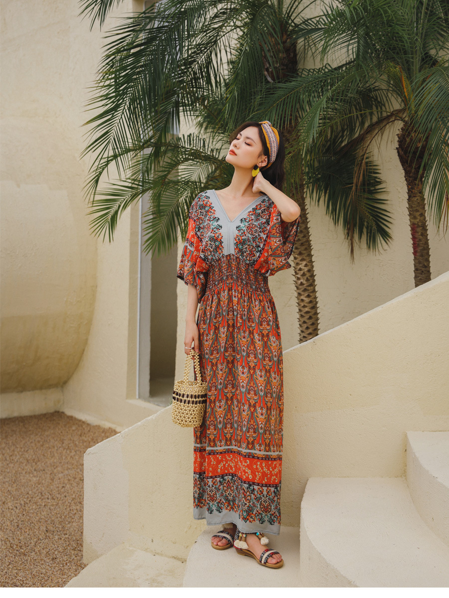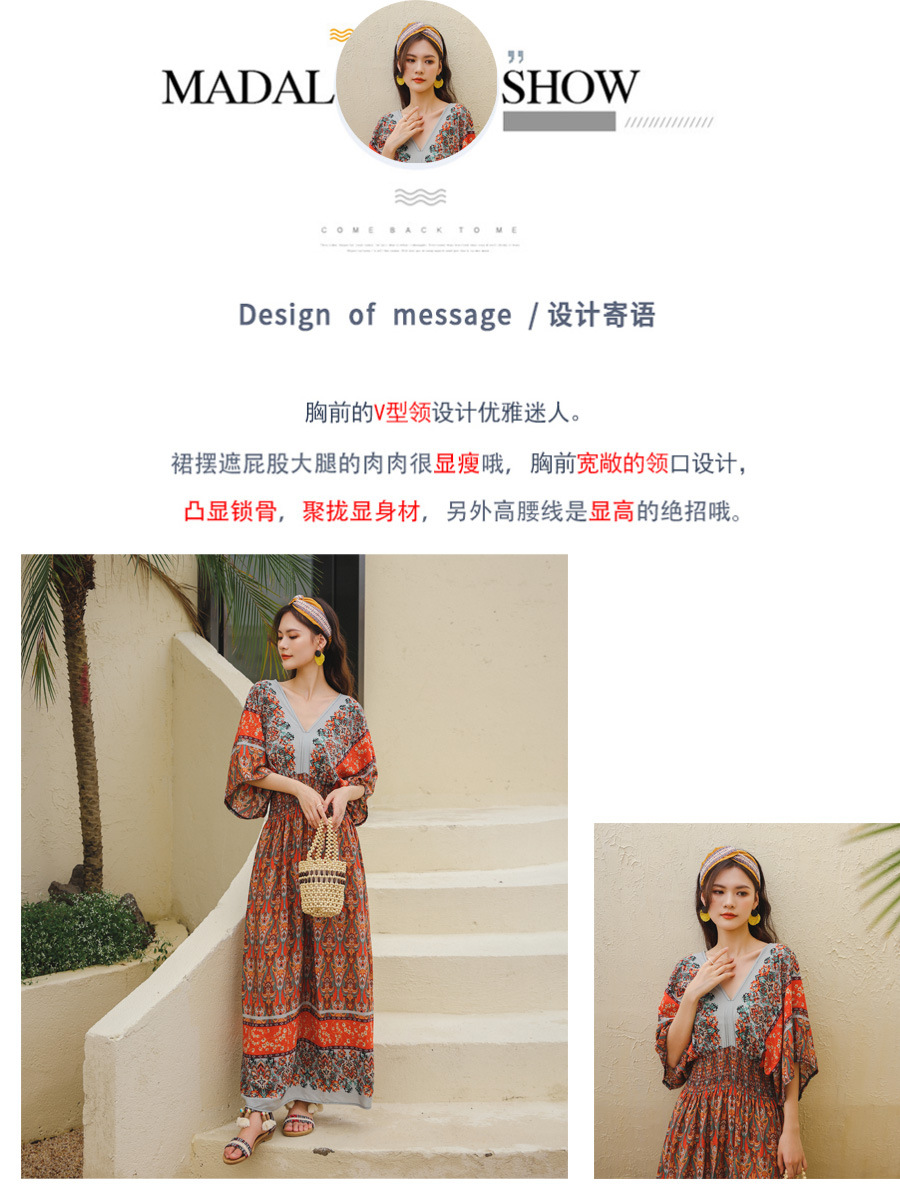국경 간 민족 스타일 V-목면 실크 반팔 비치 스커트 태국 여행 원피스 여름 인쇄 휴일 꽃 스커트